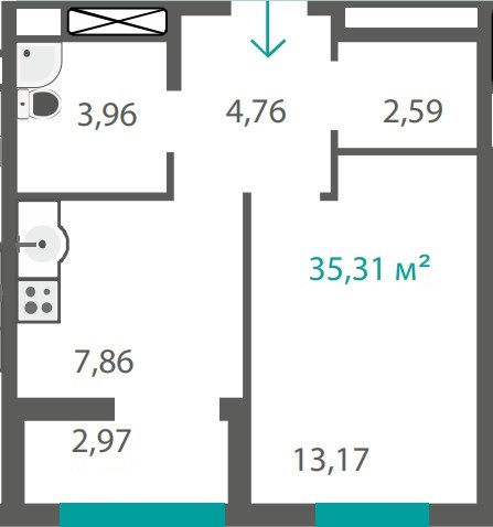 Общая площадь 35.3 м2
