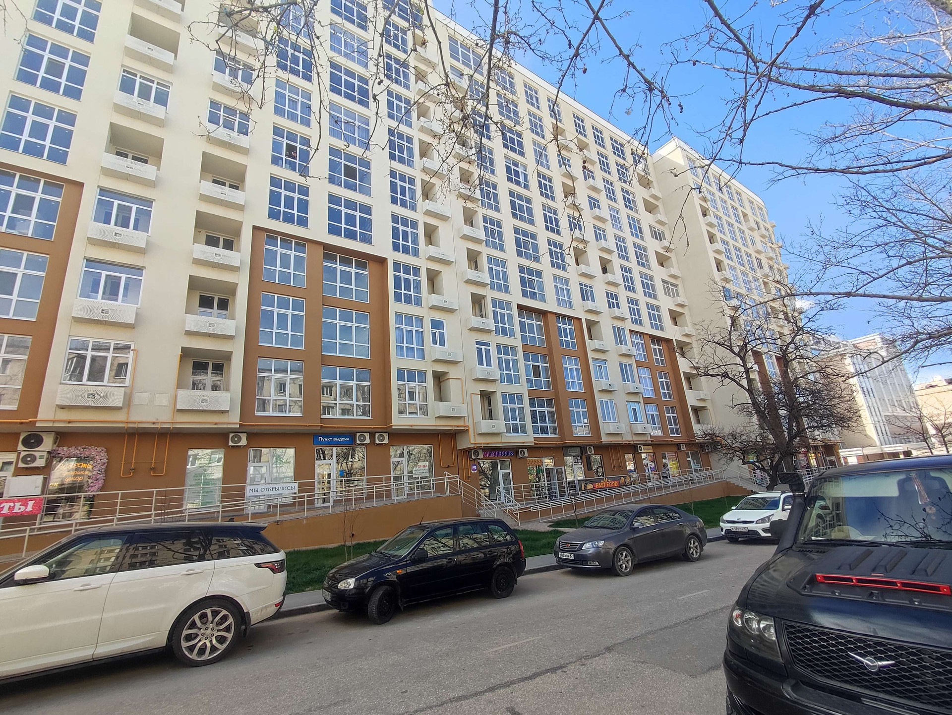 Дом сдали совсем не давно, но уже на первых этажах есть валдберис, озон, магазины и кафе.