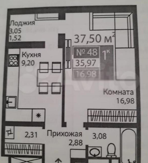 Общая площадь 37.5 м2
