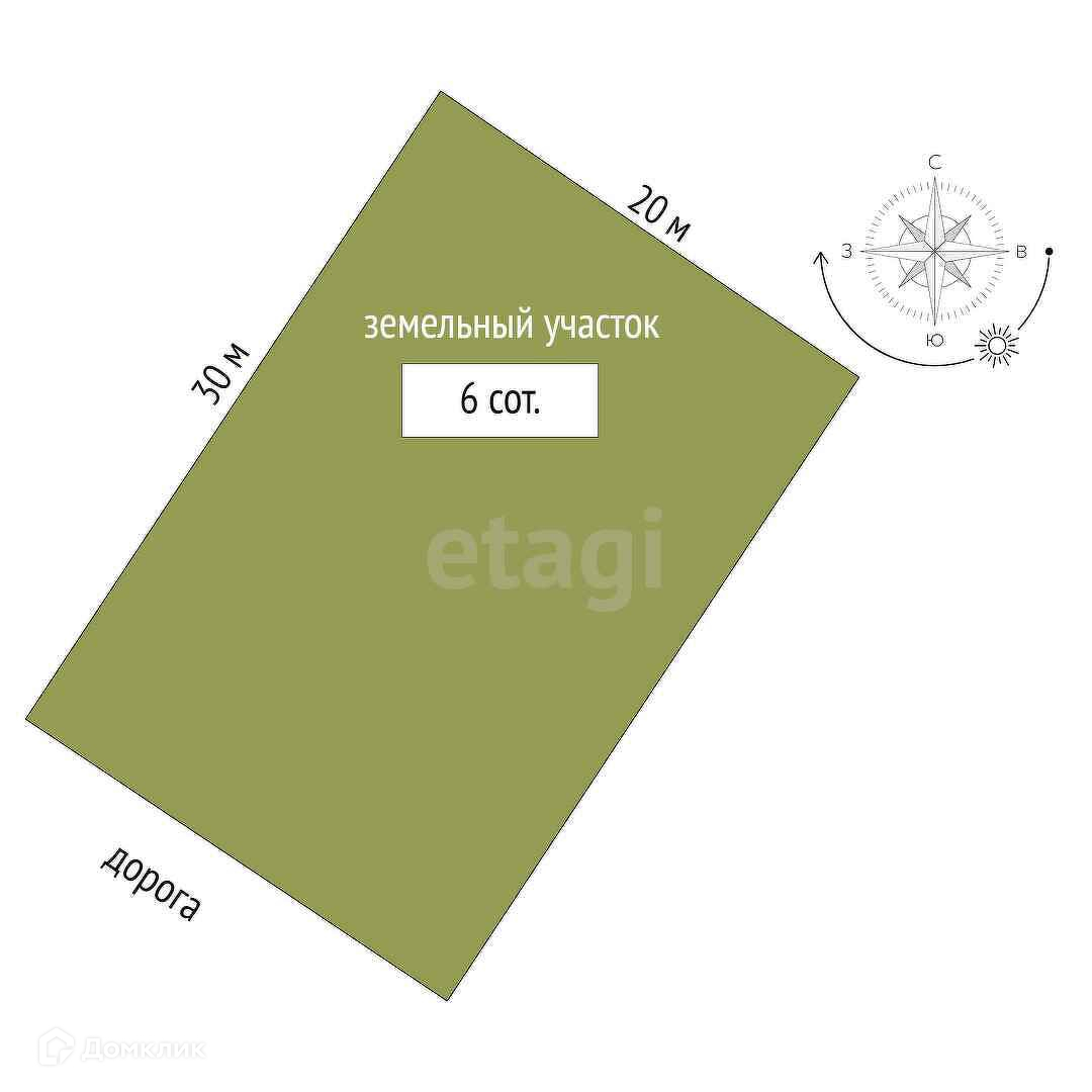 Площадь участка - 6 соток. Участок со сторонами: 20 м*30 м*20 м*30 м метров.
