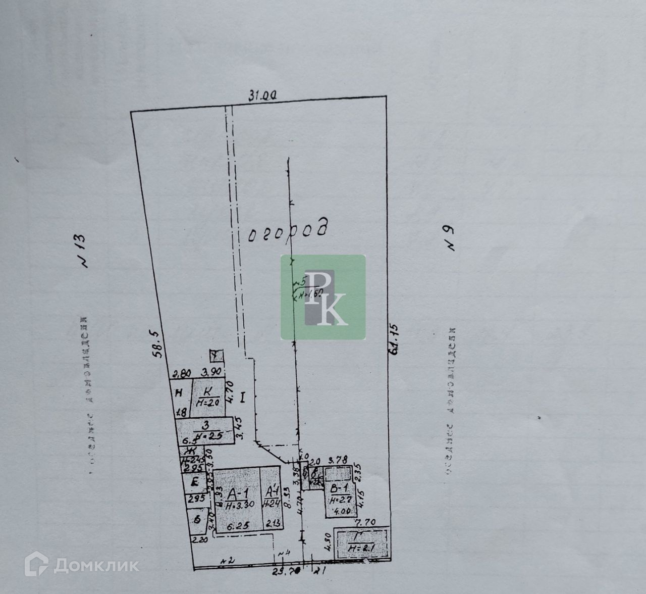 На участке имеются: жилой дом 50,3 кв.м, хоз. постройки, гараж. Постройки старые, под реконструкцию либо под снос.