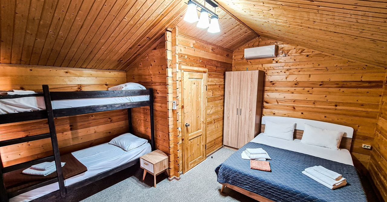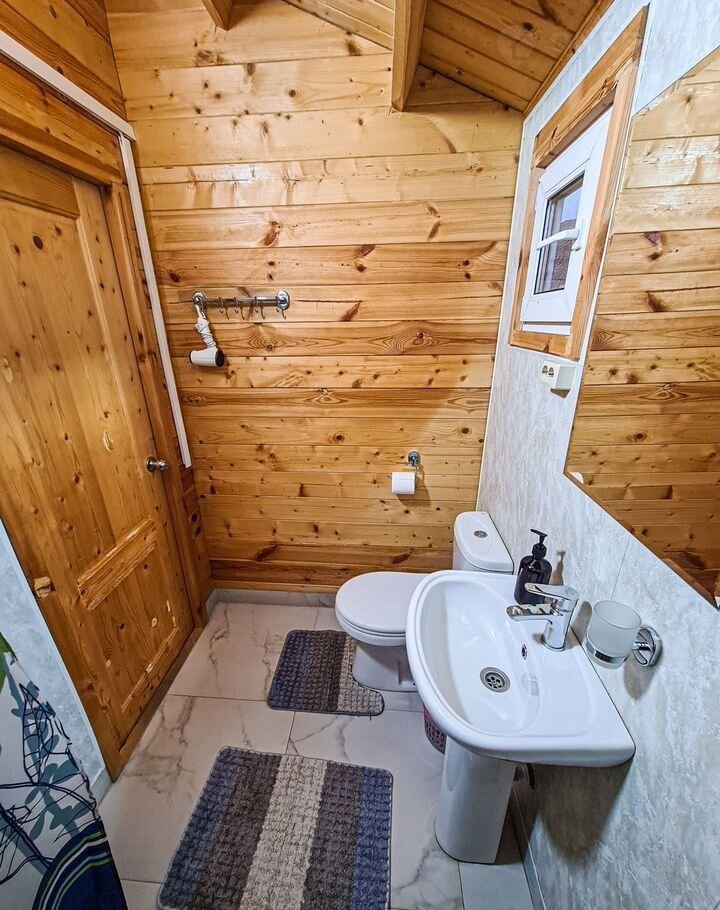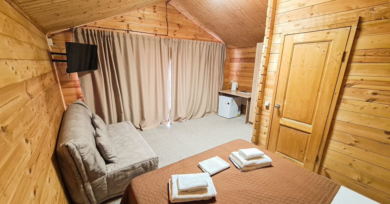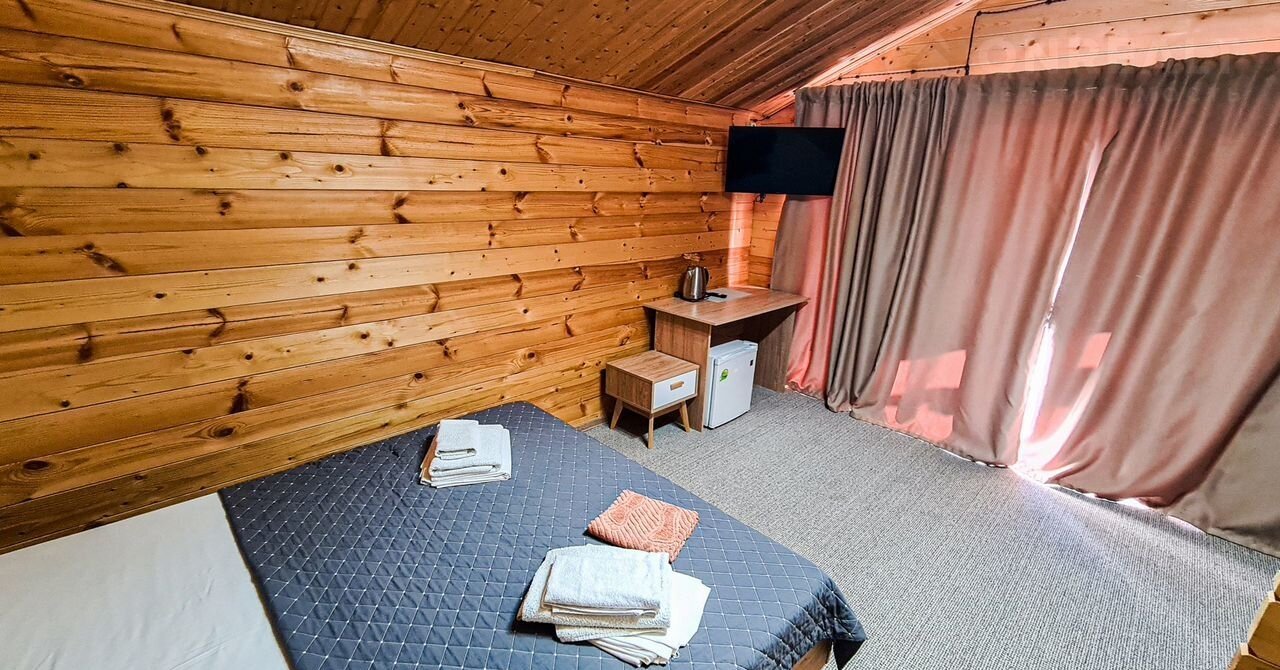 Отдельный домик с террасой - оснащен комфортными двуспальной и двухъярусной кроватями или двуспальной кровать с диваном-кроватью для двоих. Каждый домик оборудован следующими удобствами: мини-холодильник, кондиционер, телевизор, СВЧ - печь, электрический чайник, фен для волос, шкаф для одежды, отопление в холодное время года, средства личной гигиены (мыло, шампунь, гель для душа, туалетная бумага), полотенца и постельное белье, ложки для обуви, тапочки, комплиментарно при заезде предоставляется питьевая вода. Индивидуальный санузел в номере. Площадь номера 25 кв.м.