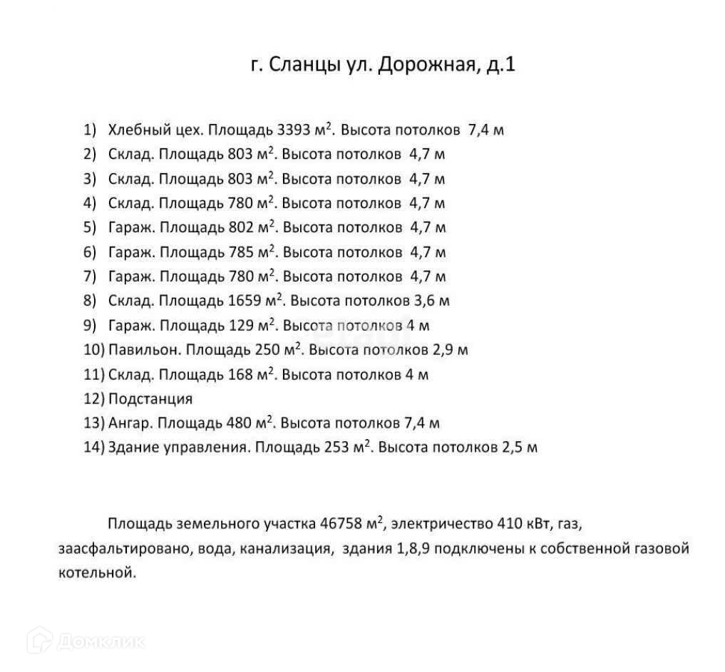 На территории Ленинградской области в городе Сланцы имеется в собственности земельный участок 4,7 га с находящимися на нем помещениями различного назначения, различные площади и с различной высотой потолков. До КАД расстояние от Сланцев 160 км. До Пскова 160 км. А также в помещение номер 1 находятся собственное хлебобулочное производство. Помещение оборудовано всеми необходимыми коммуникациями (электричество 410 кВт, газ, вода, канализация, собственная газовая котельная). Есть собственный автопарк, своя материально-техническая база, свой обученный персонал по производству хлебобулочных изделий.