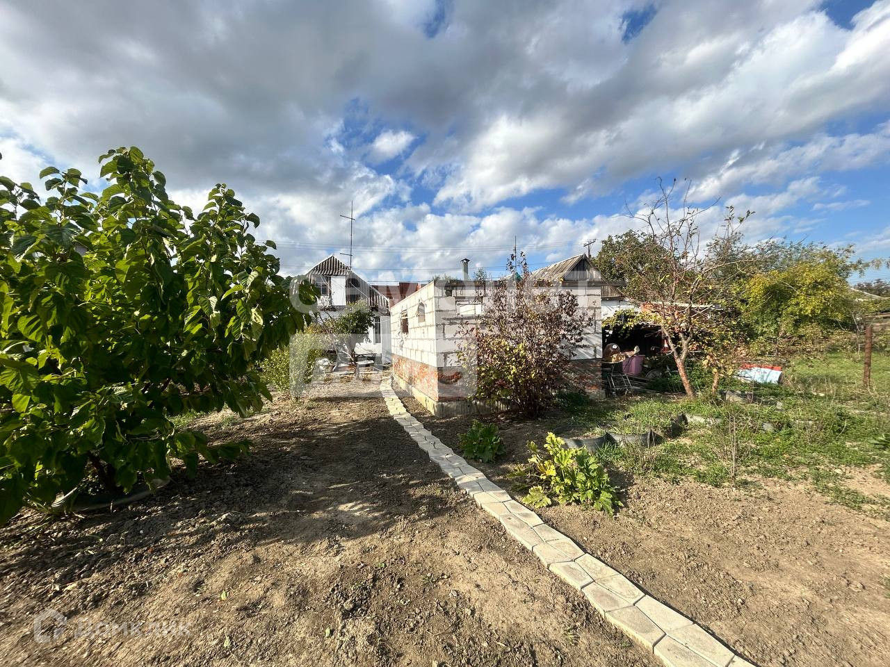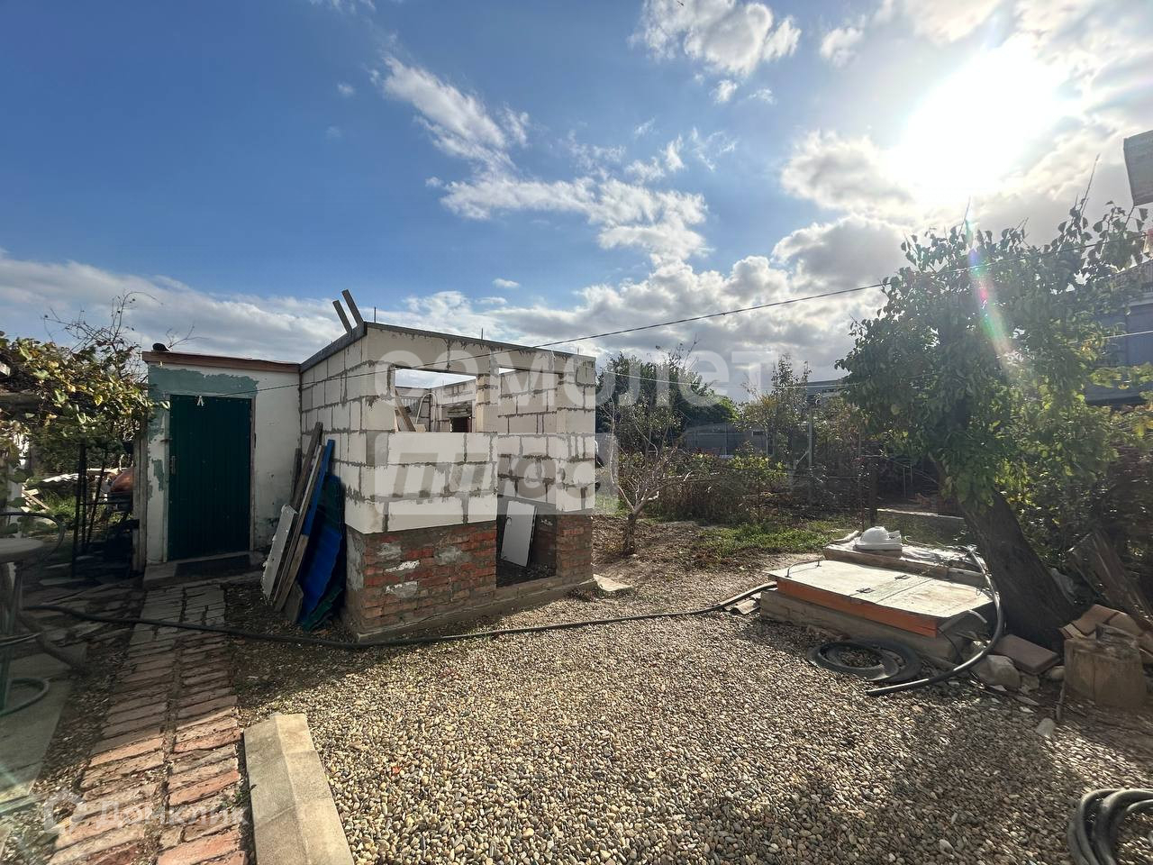 Земельный участок: 513 кв. м. правильной формы. Имеются хозпостройки, коробка из пеноблока под баню.