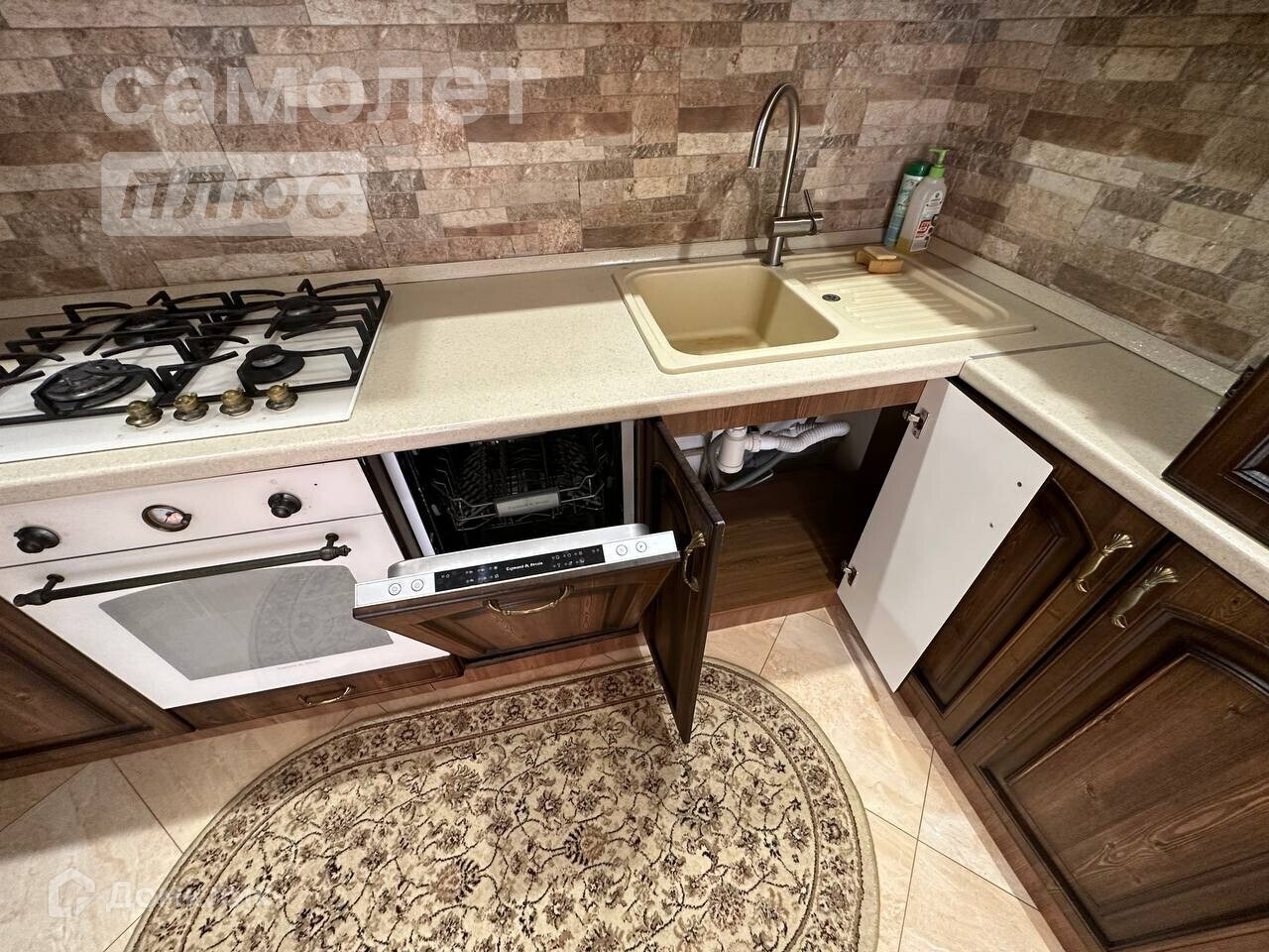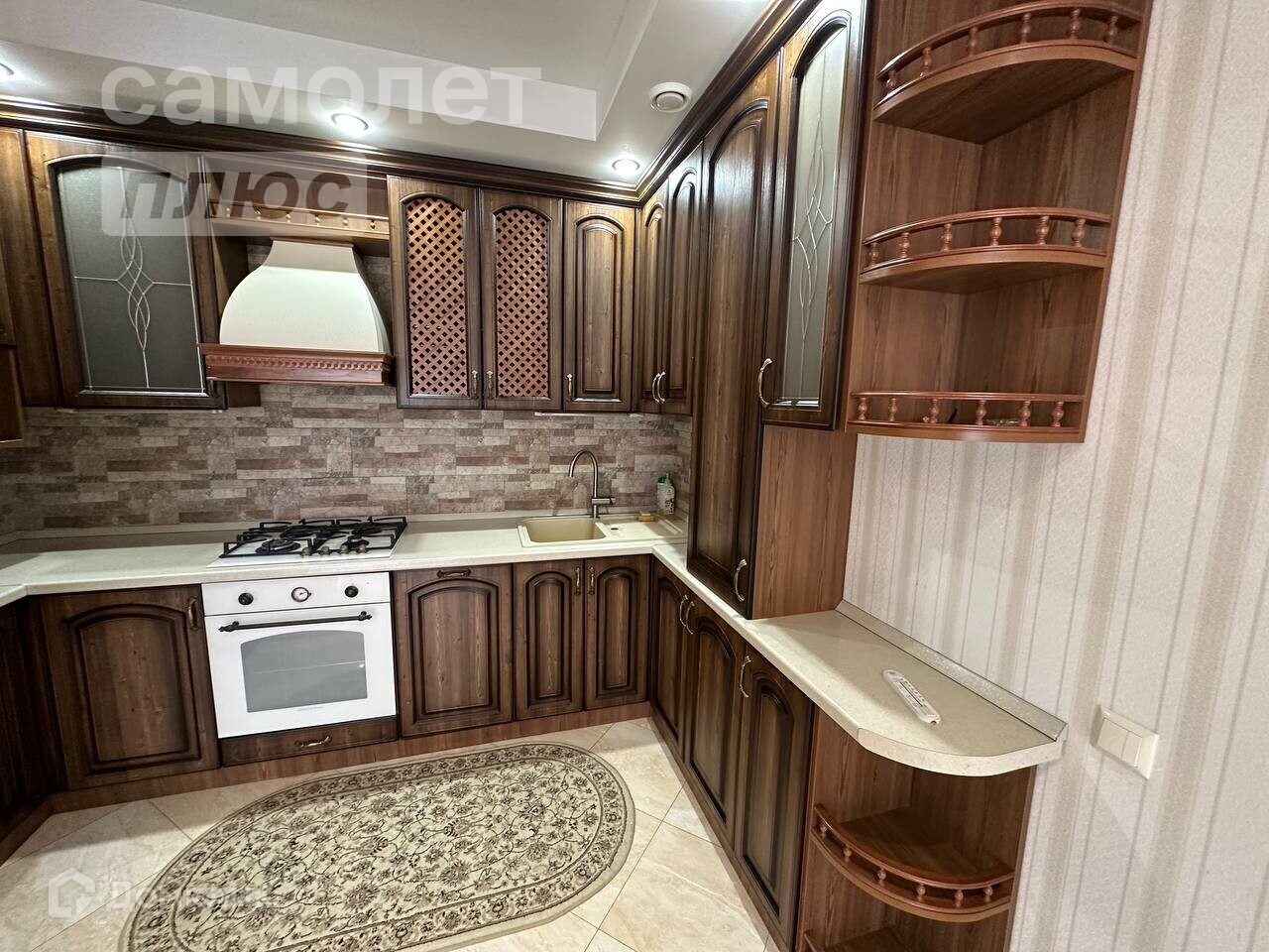 Кухня - гостиная с выходом на лоджию. На полу плитка, есть современный кухонный гарнитур с посудомоечной машиной, газовой плитой и духовым шкафом. Сделан многоуровневый потолок.