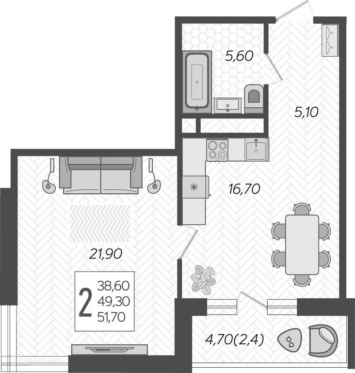 Общая площадь 51.7 м2