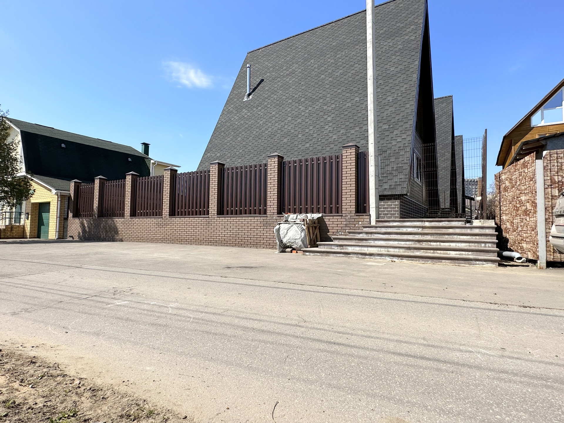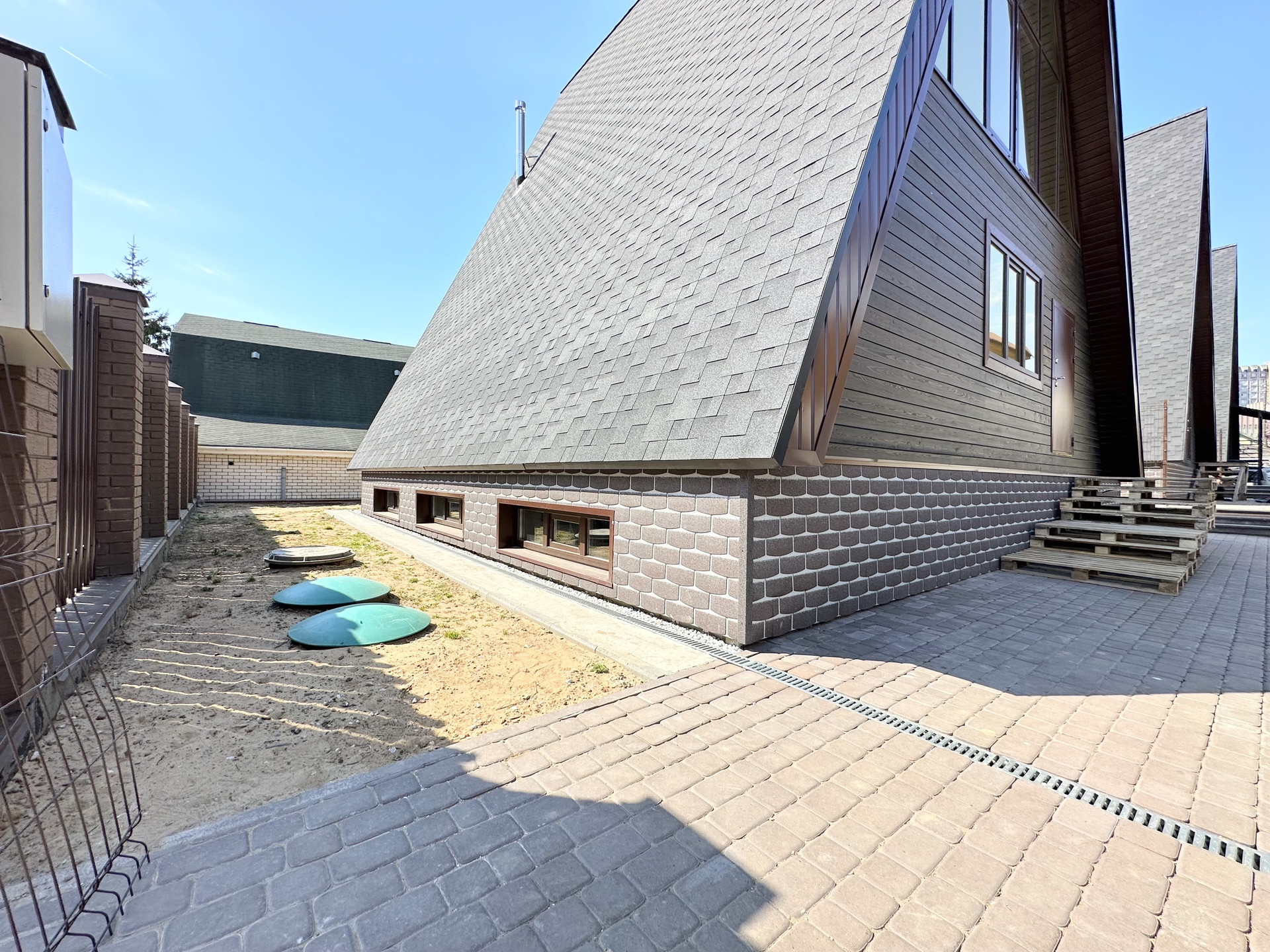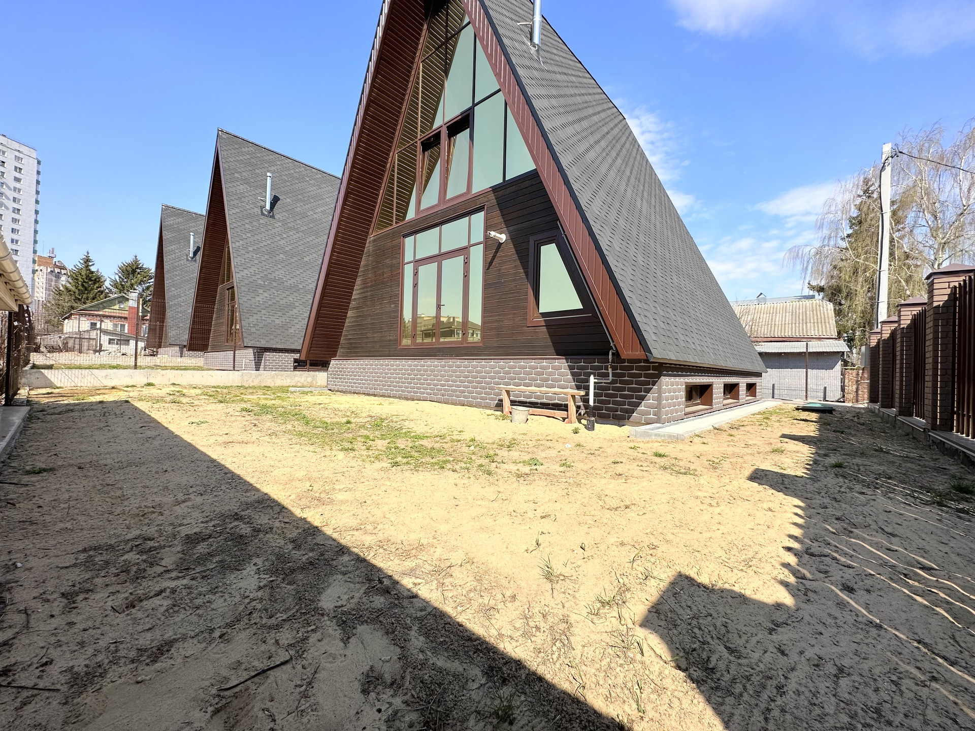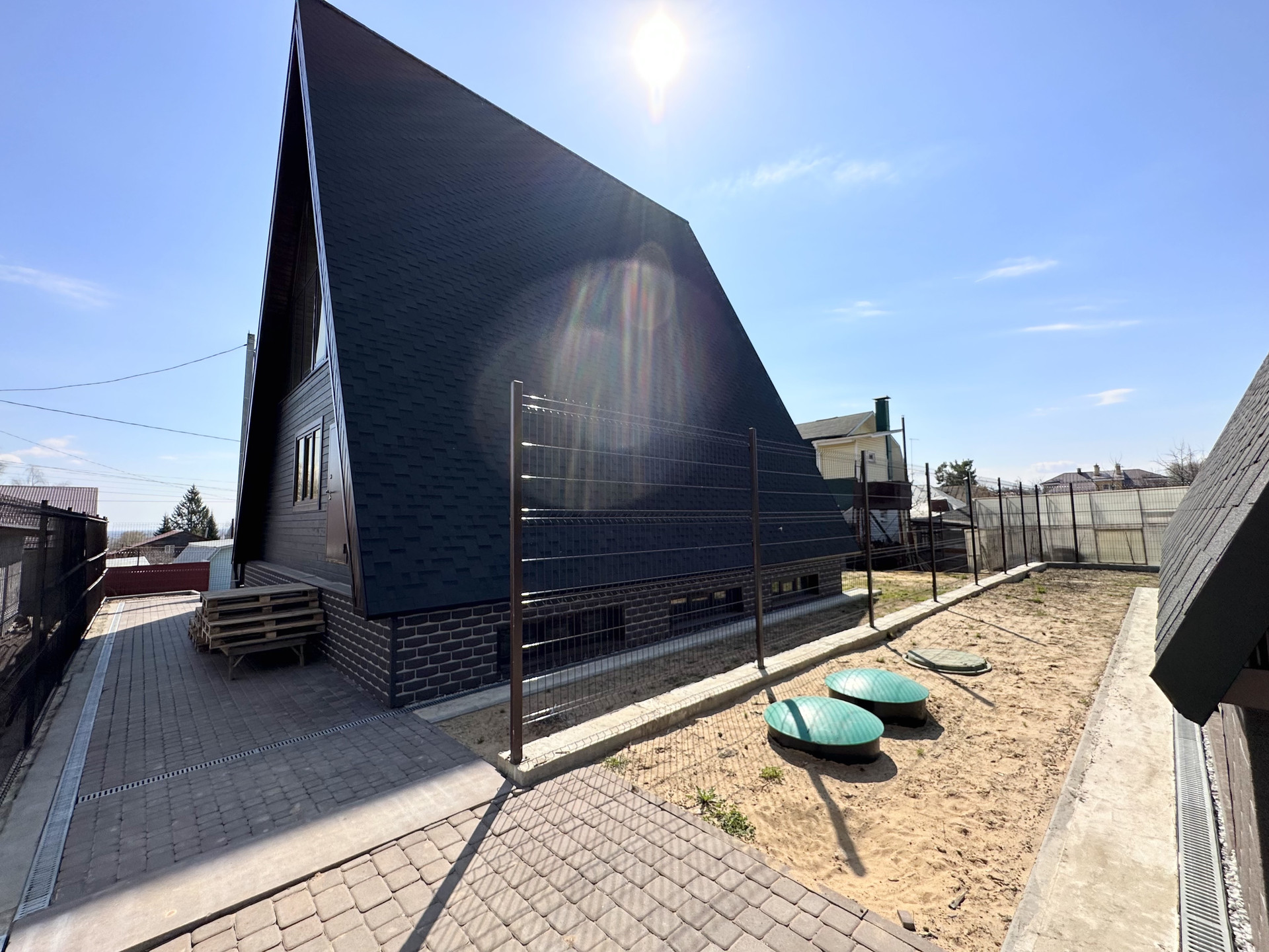 Дом без отделки, построен в современном, набирающем популярность в России стиле "A-frame House". Такие дома уже давно отлично зарекомендовали себя в Северной Америке и Канаде, в местах, со схожим с нашей полосой сложным климатом (снежные и холодные зимы, дождливые, ветреные осень и весна, аномально жаркие летние месяцы).