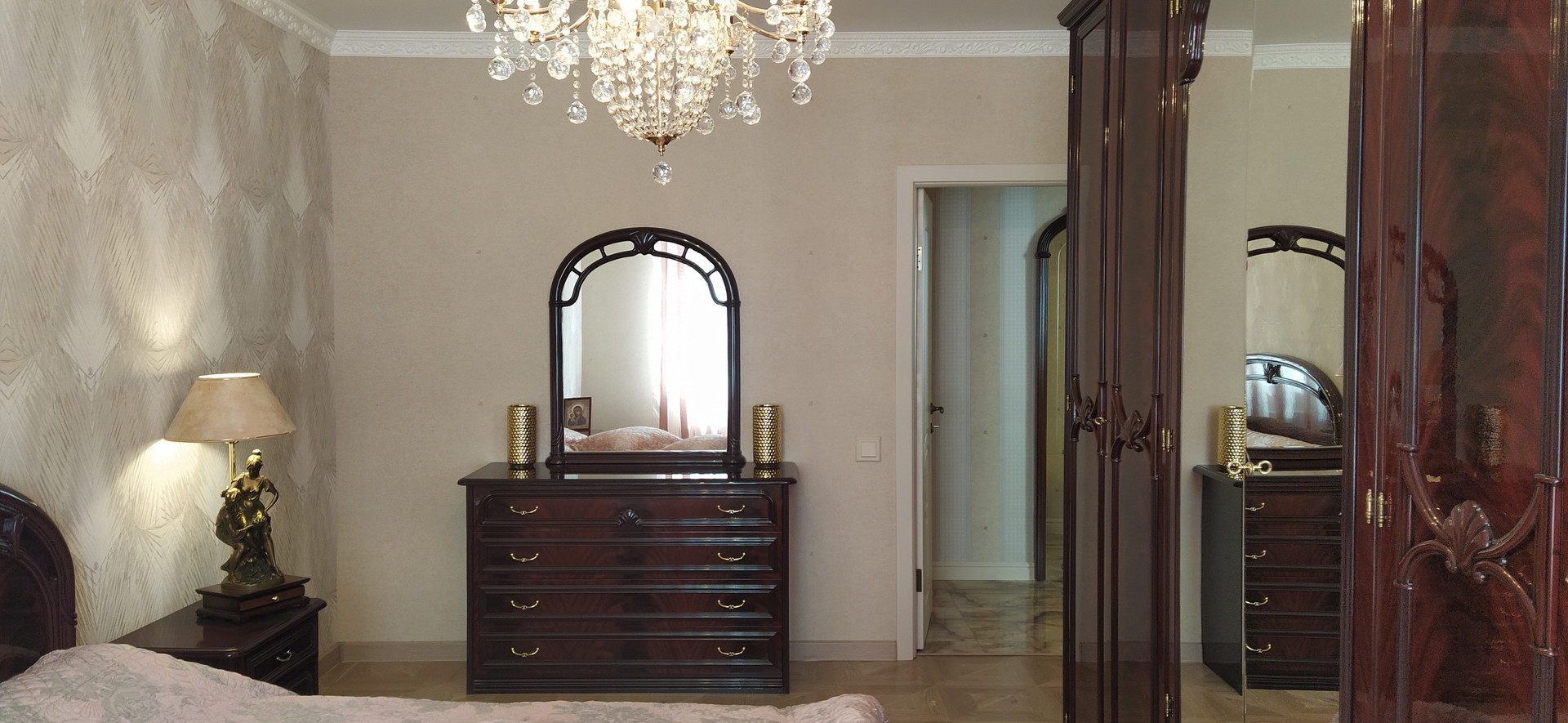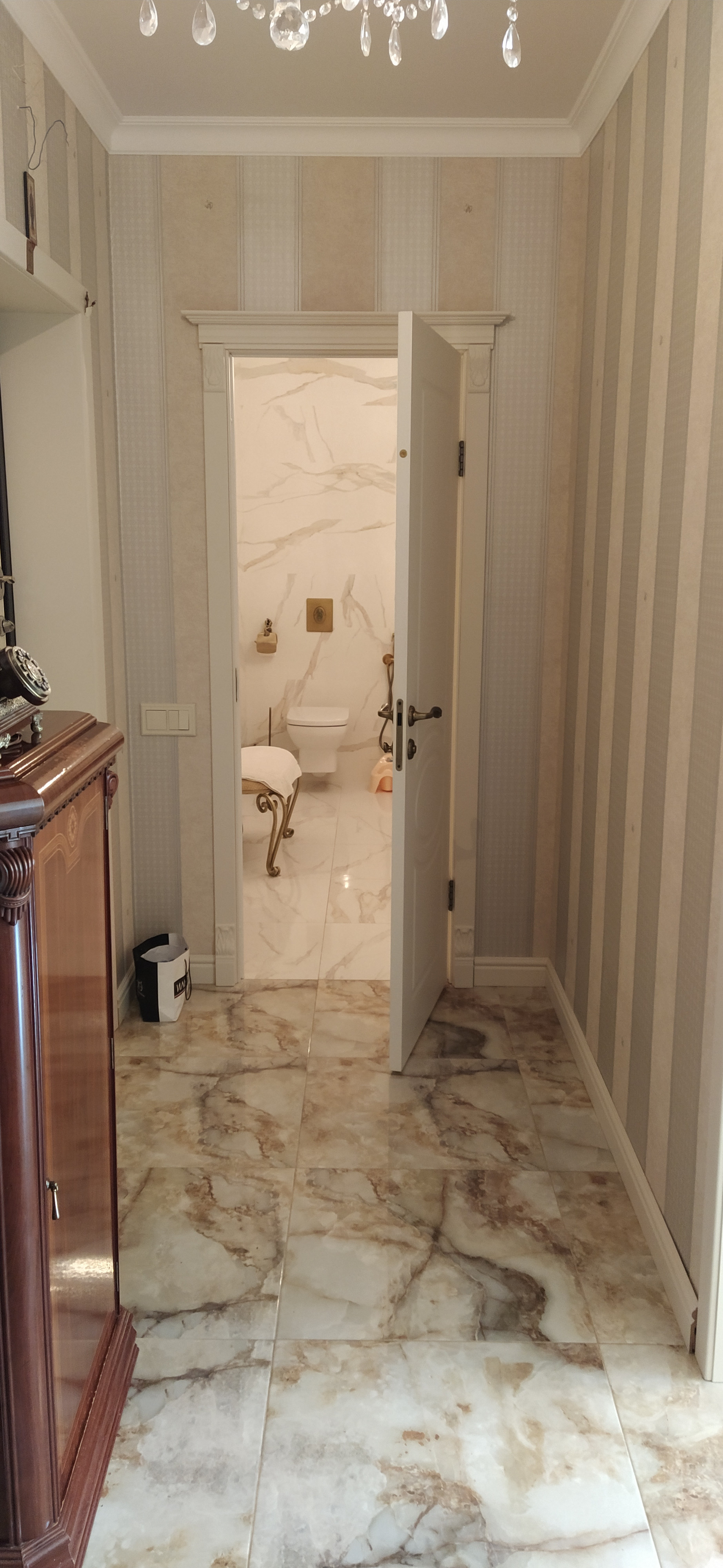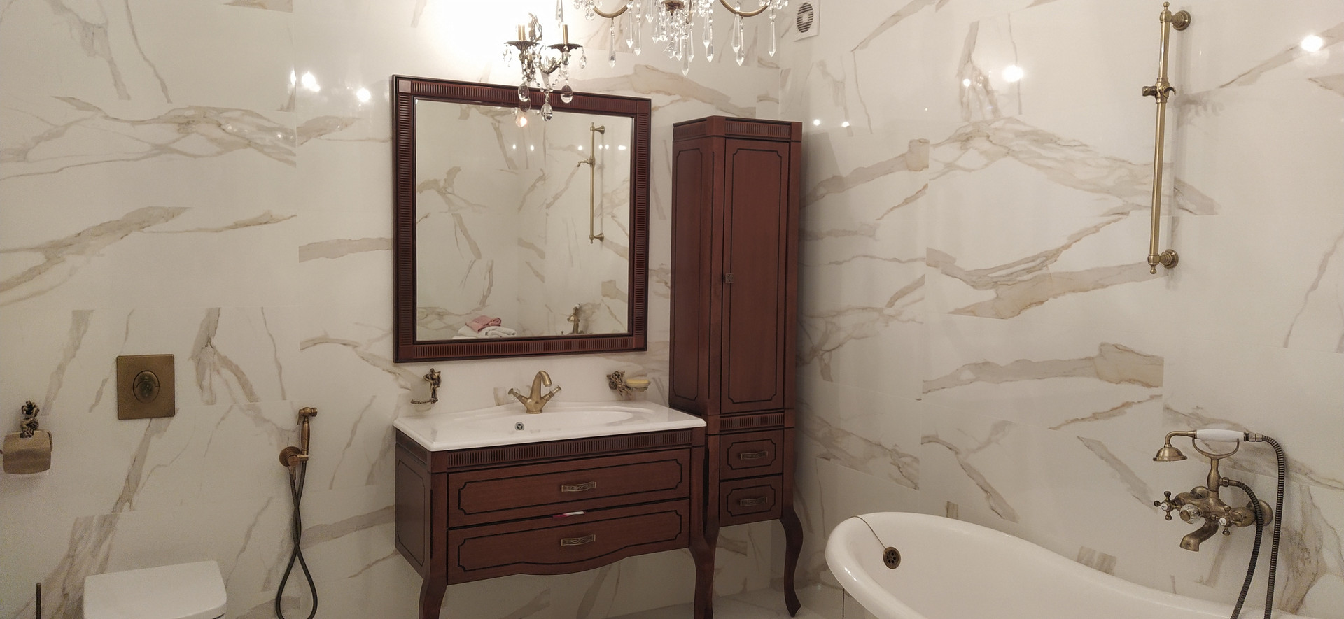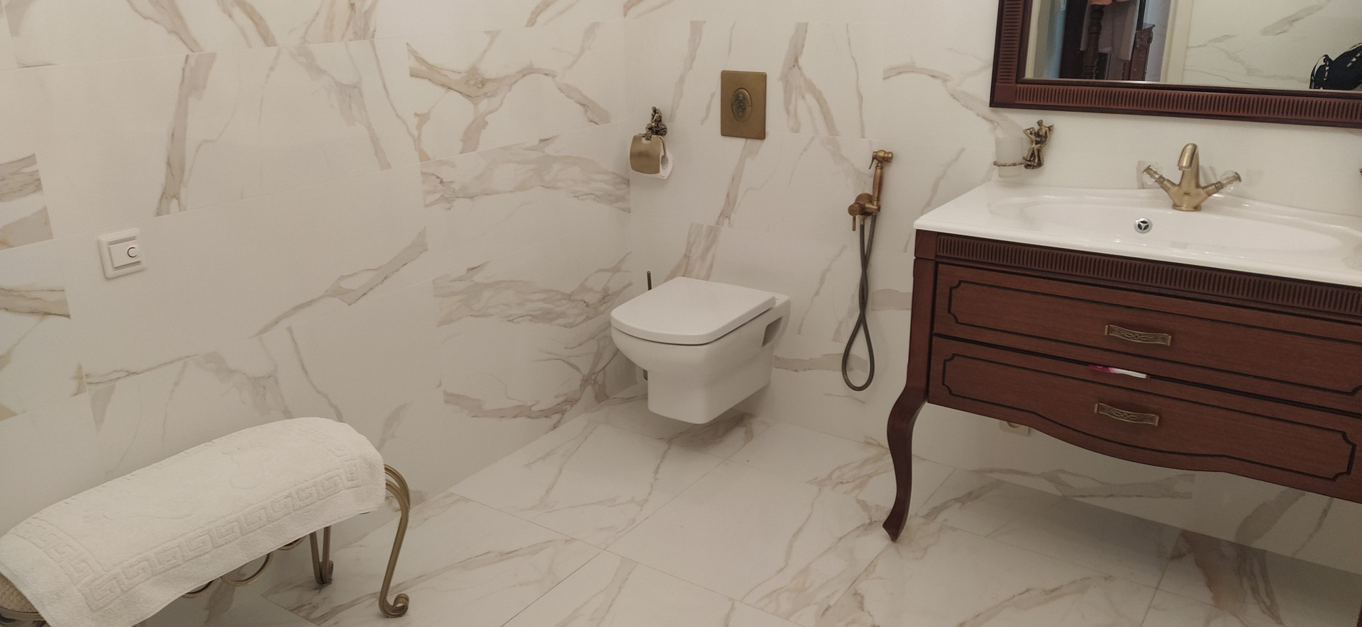 В квартире выполнен ремонт из дорогостоящих и качественных материалов по дизайн-проекту (плитка на полу и с/у коллекции Bulgaria, обои Roberto Cavalli, итальянская сантехника и т.д.).