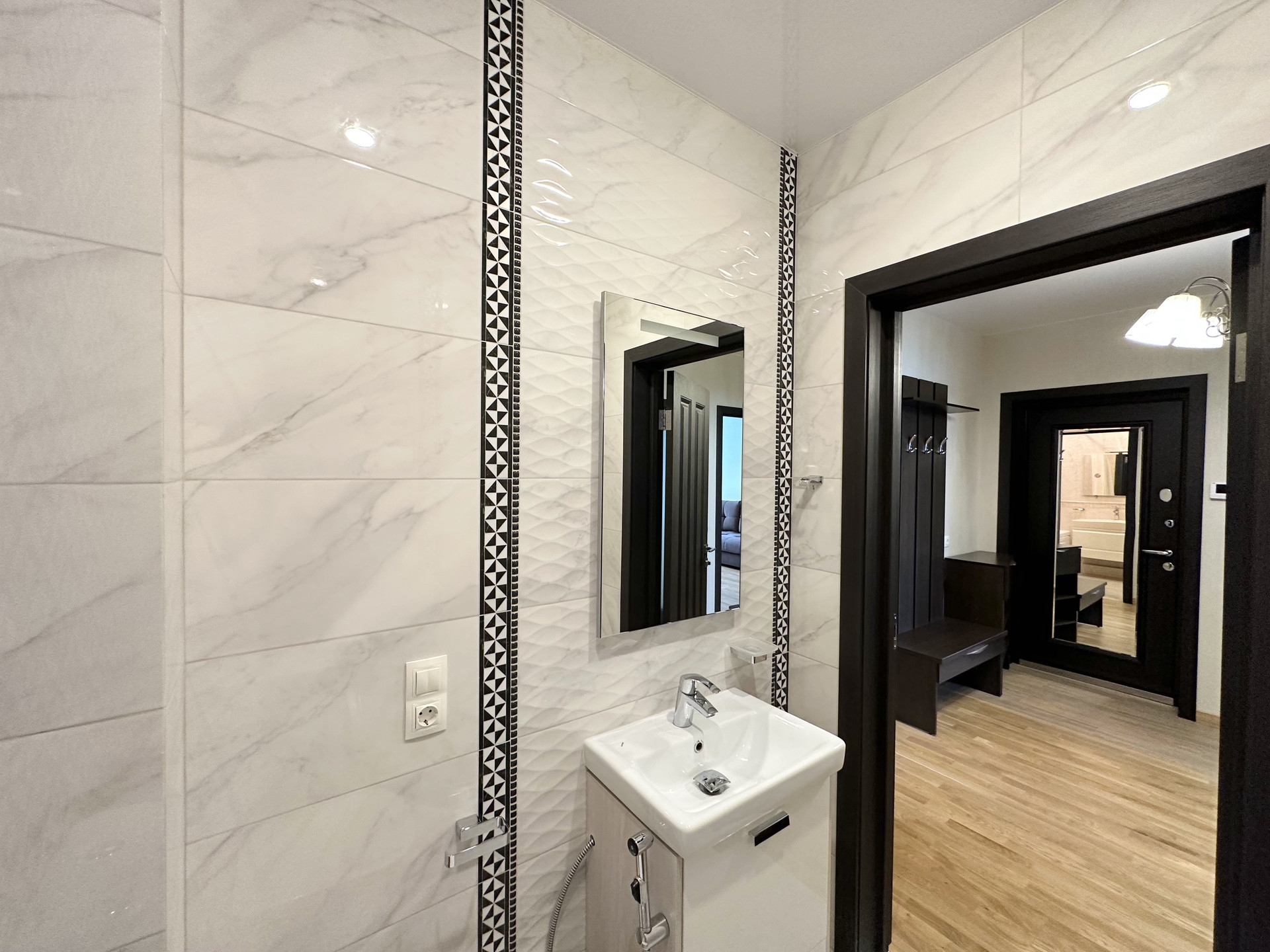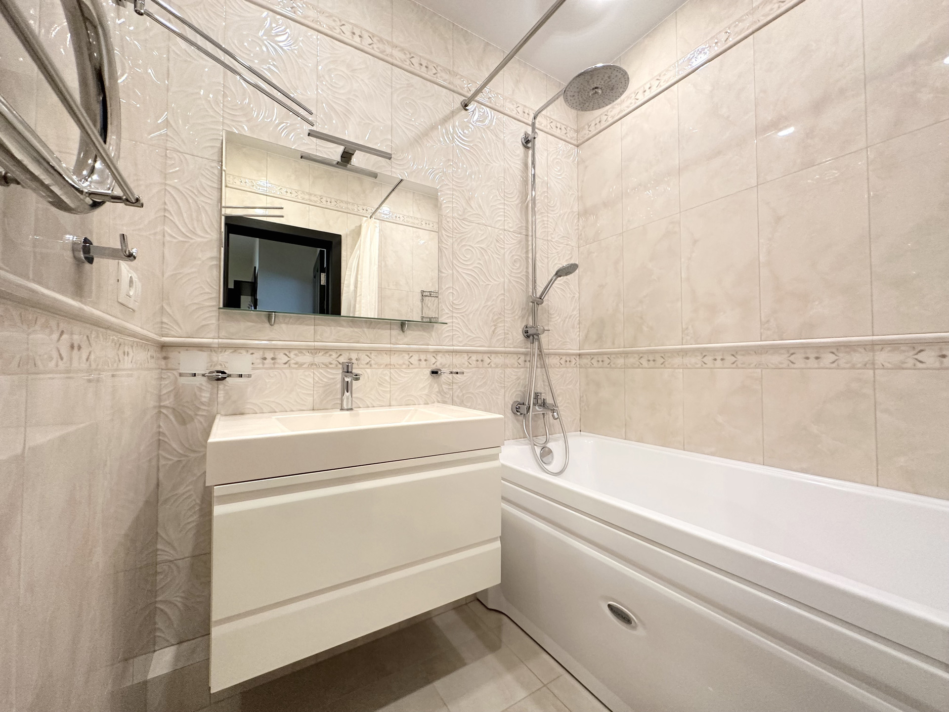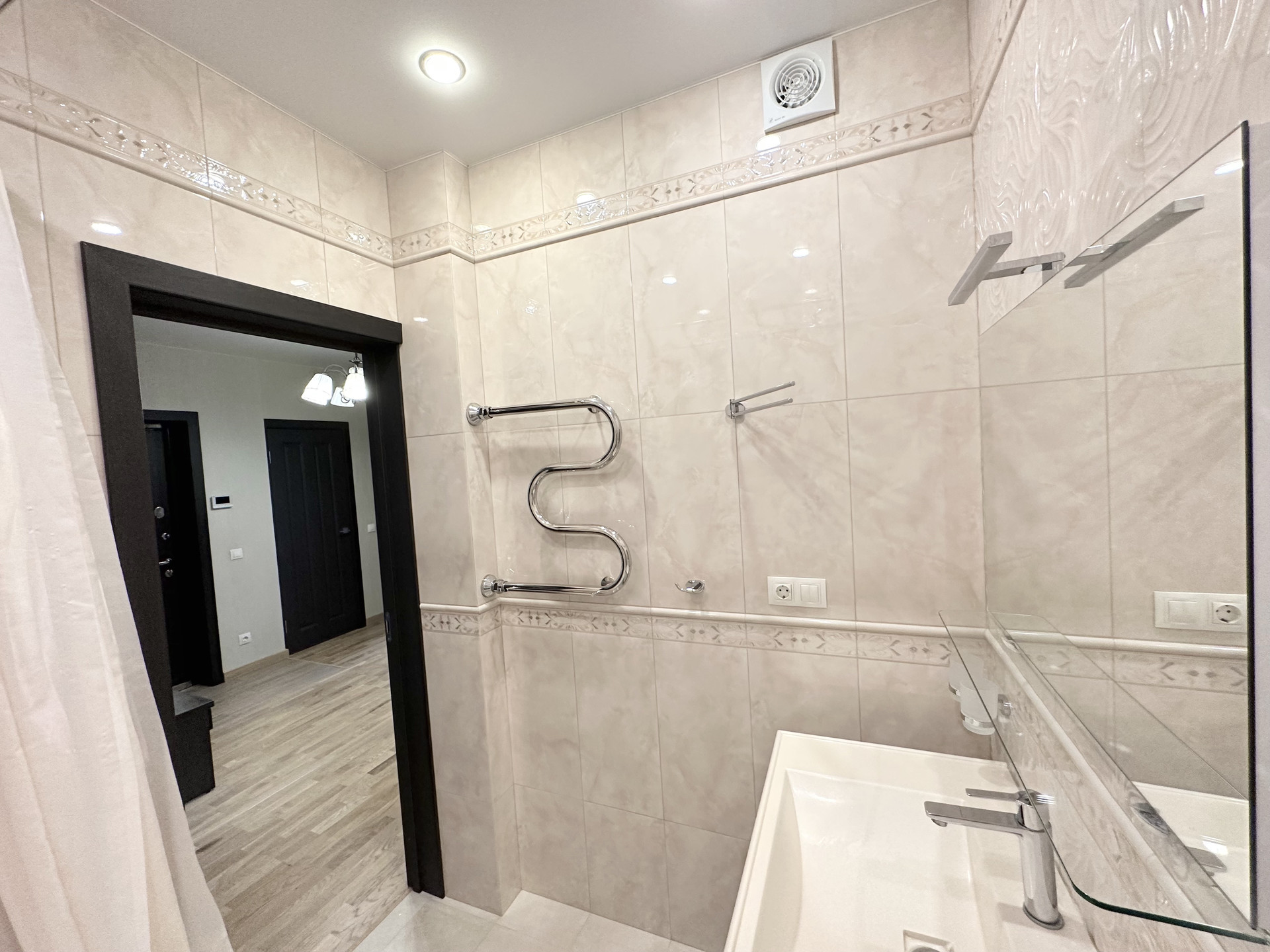 В квартире грамотная дизайнерская расстановка света, полы с подогревом, керамогранит и ламинат 32-го класса, дорогая сантехника, импортные краны.