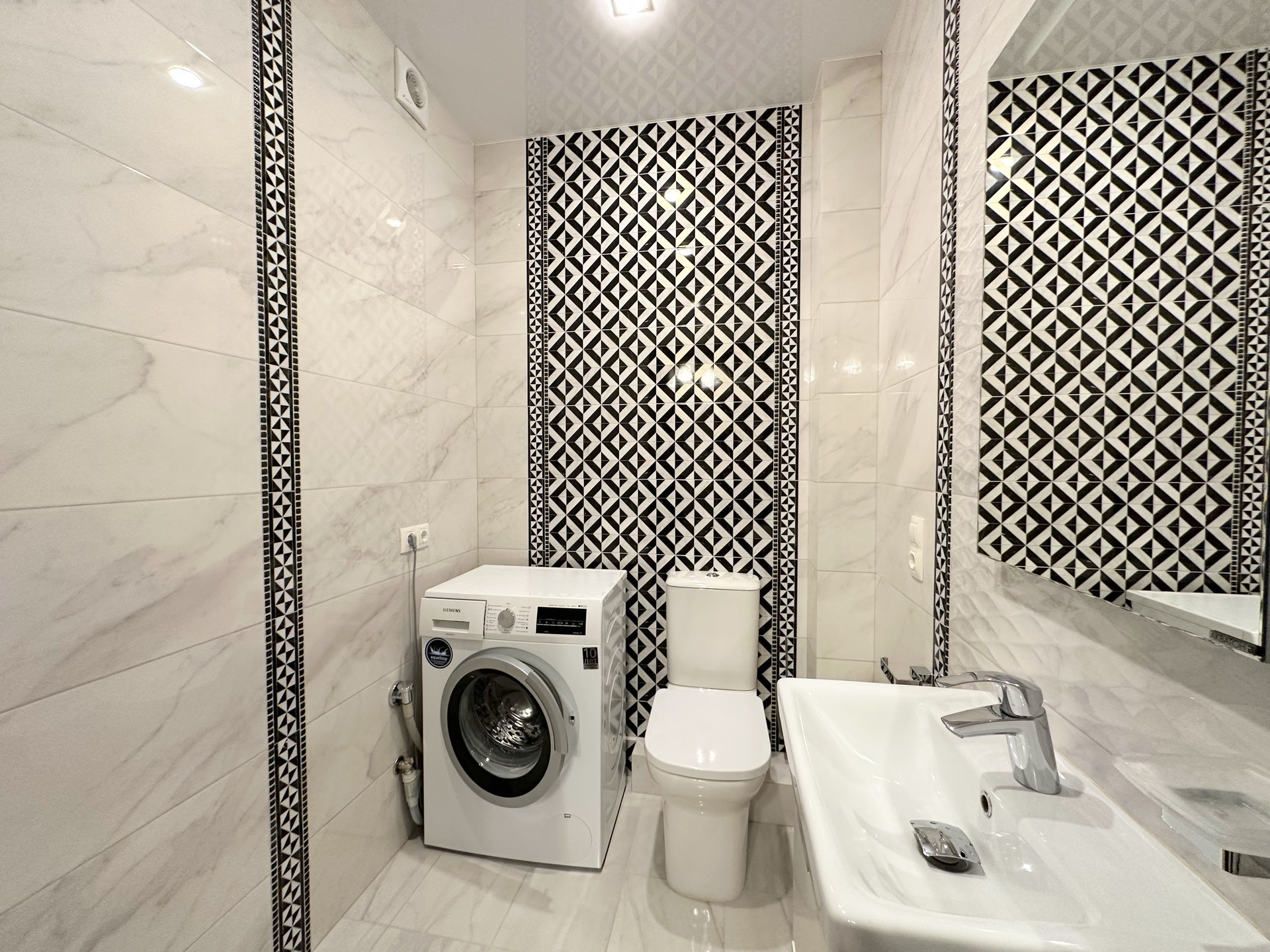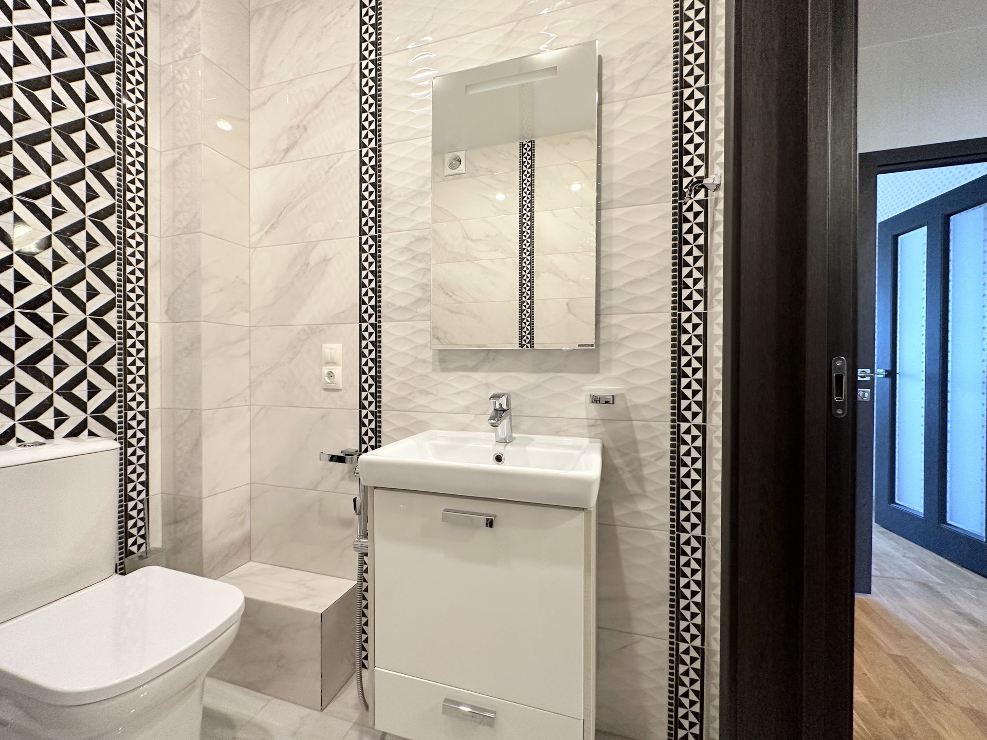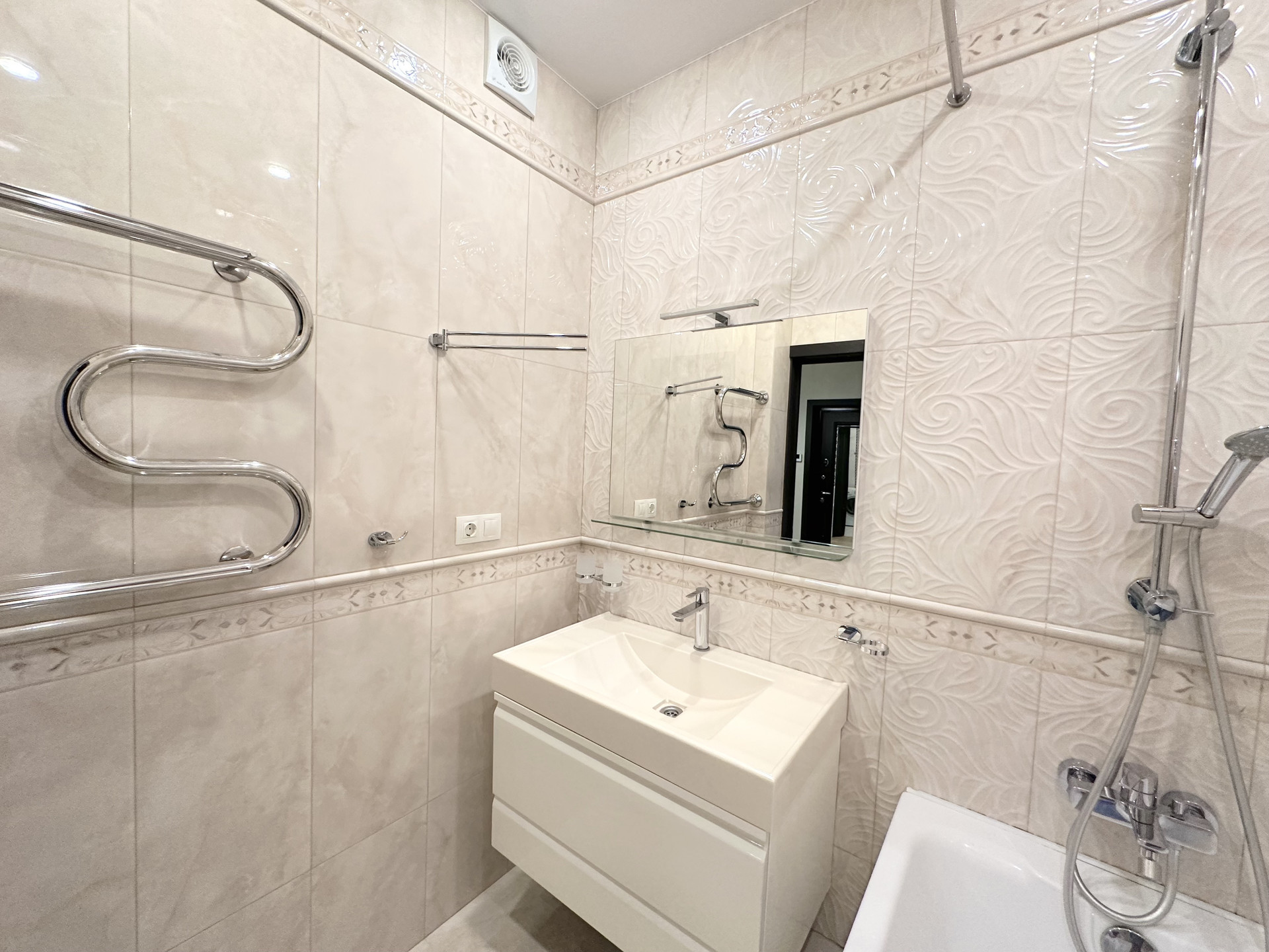 В квартире грамотная дизайнерская расстановка света, полы с подогревом, керамогранит и ламинат 32-го класса, дорогая сантехника, импортные краны.