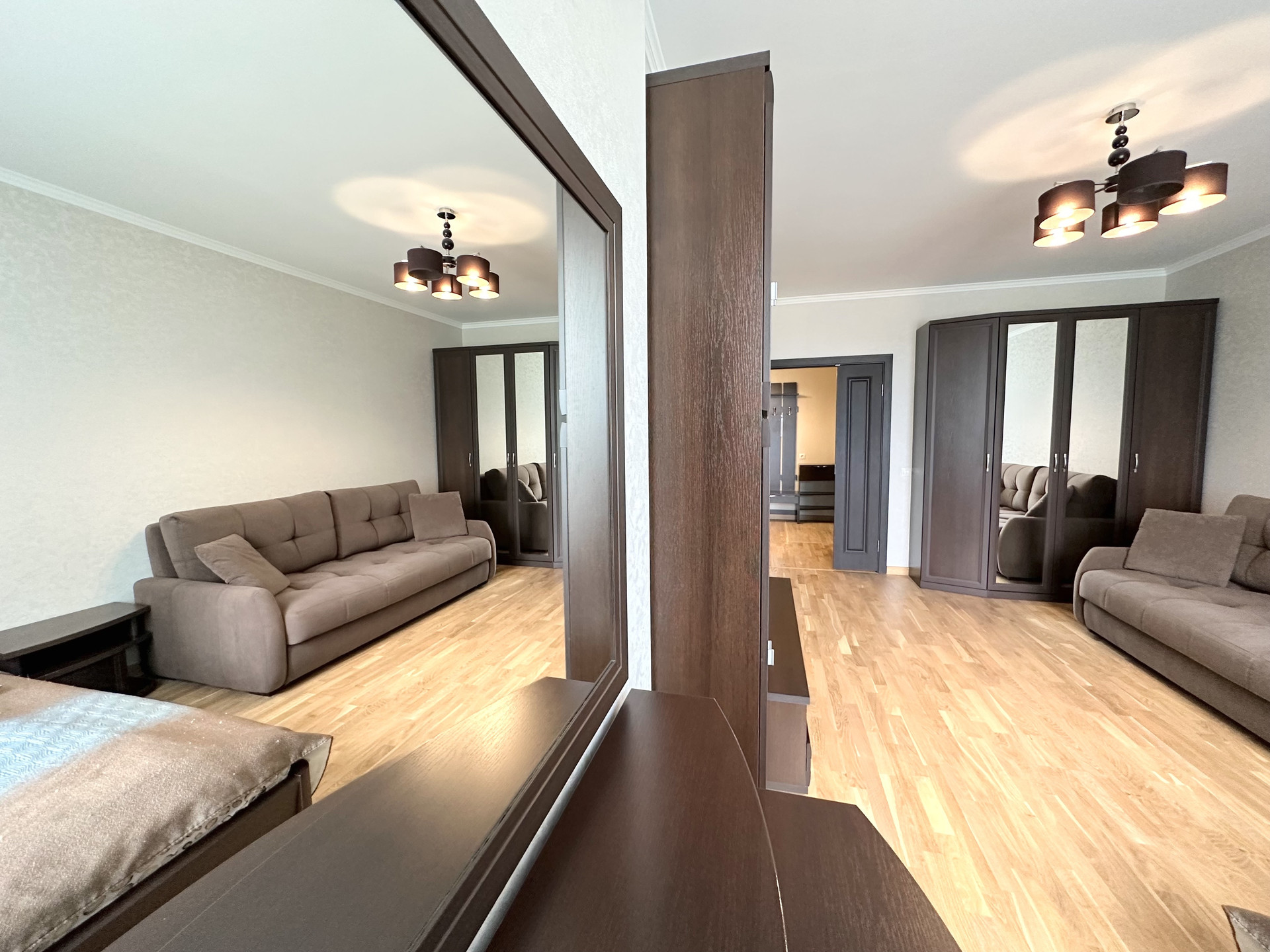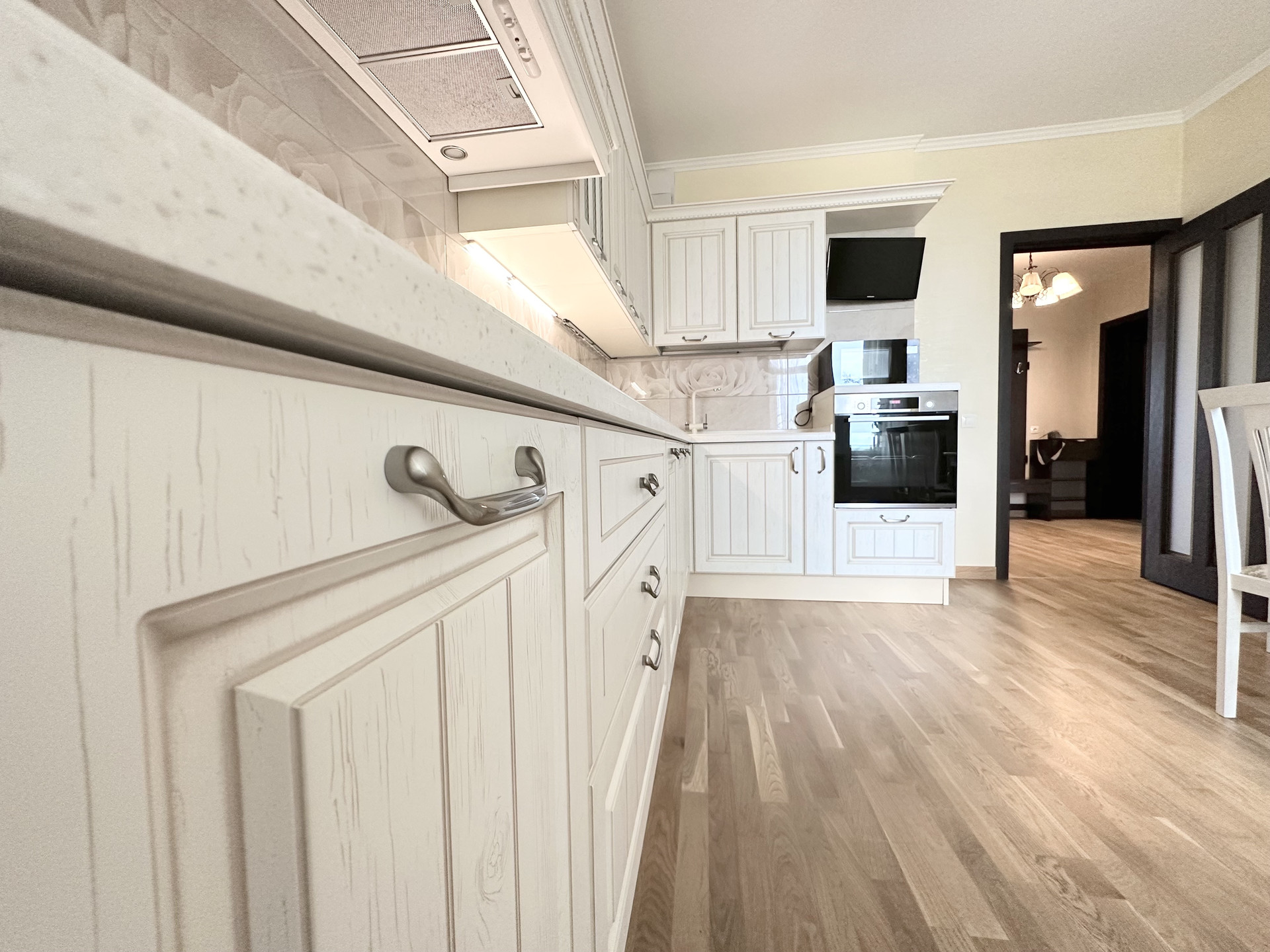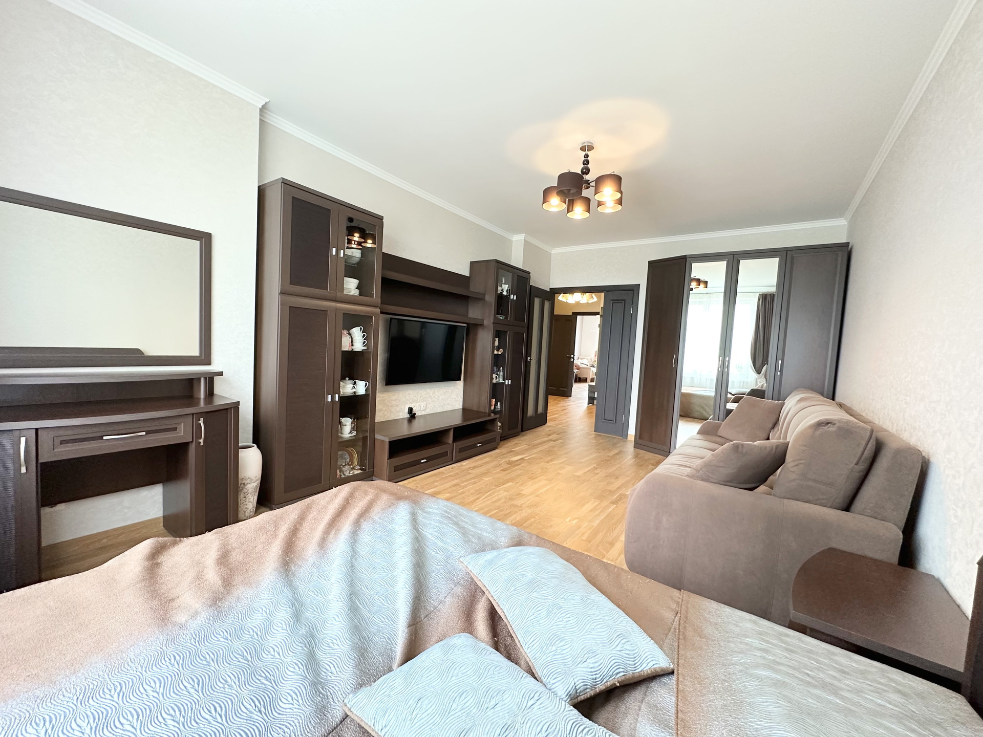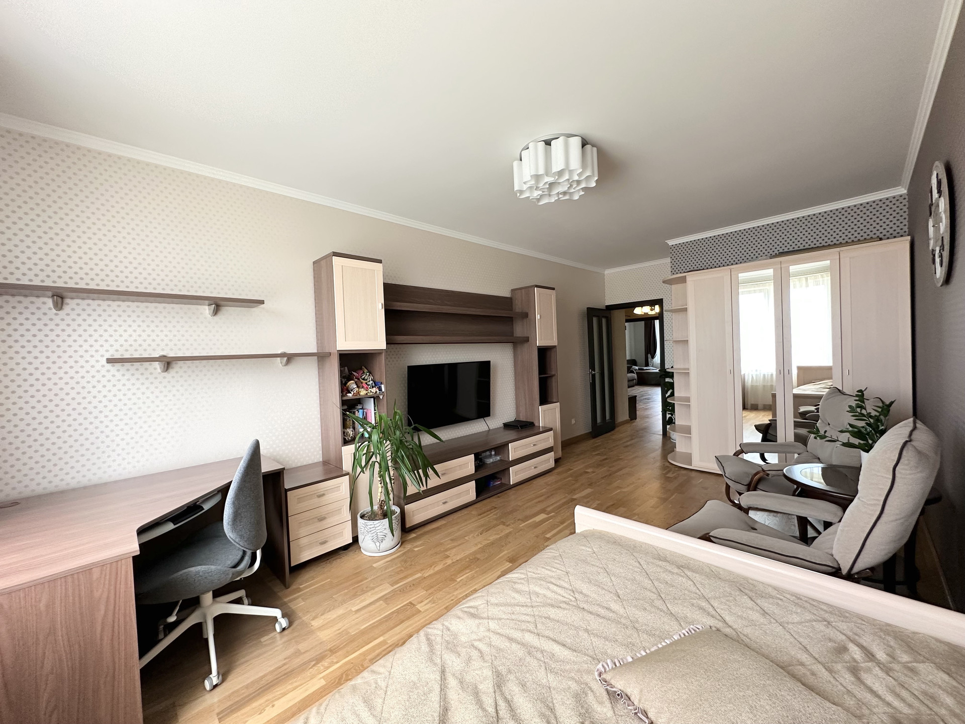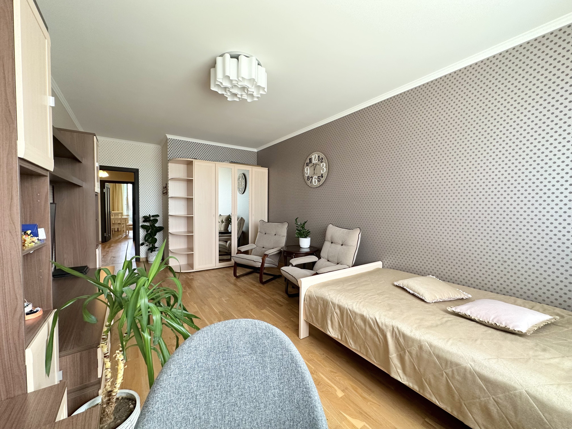 Квартира светлая и уютная, с функциональной современной планировкой: две удобные изолированные комнаты на разные стороны дома, большая кухня с выходом на обустроенную лоджию, просторный холл, санузел раздельный, практичная гардеробная с наполнением, высокие потолки.