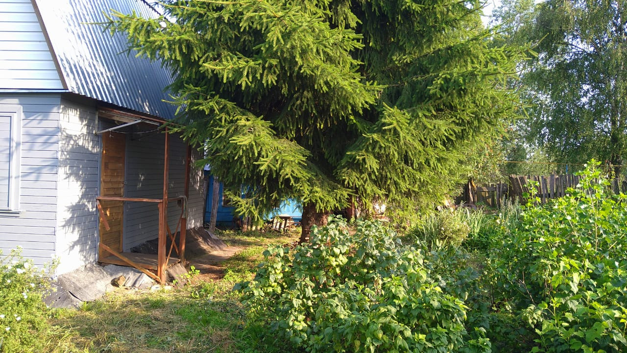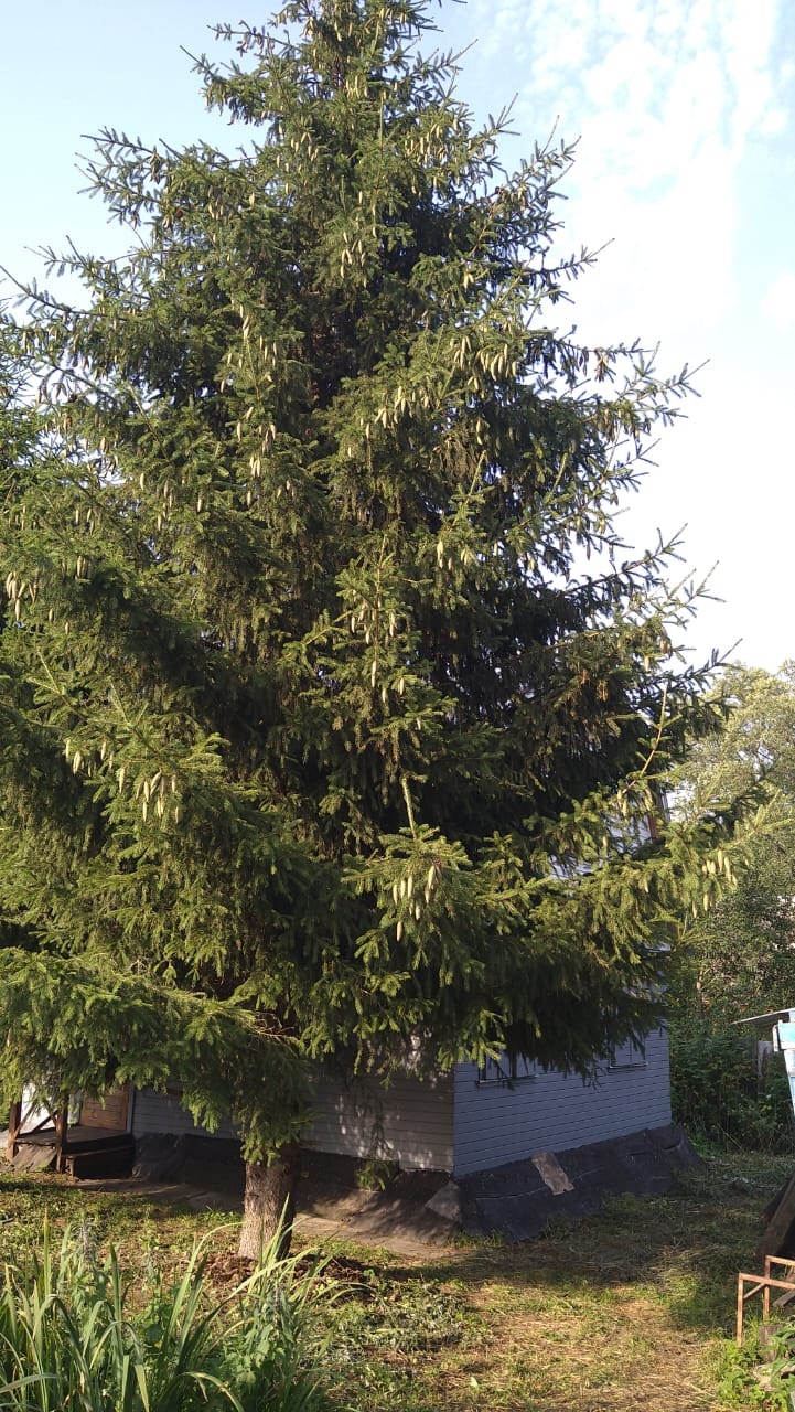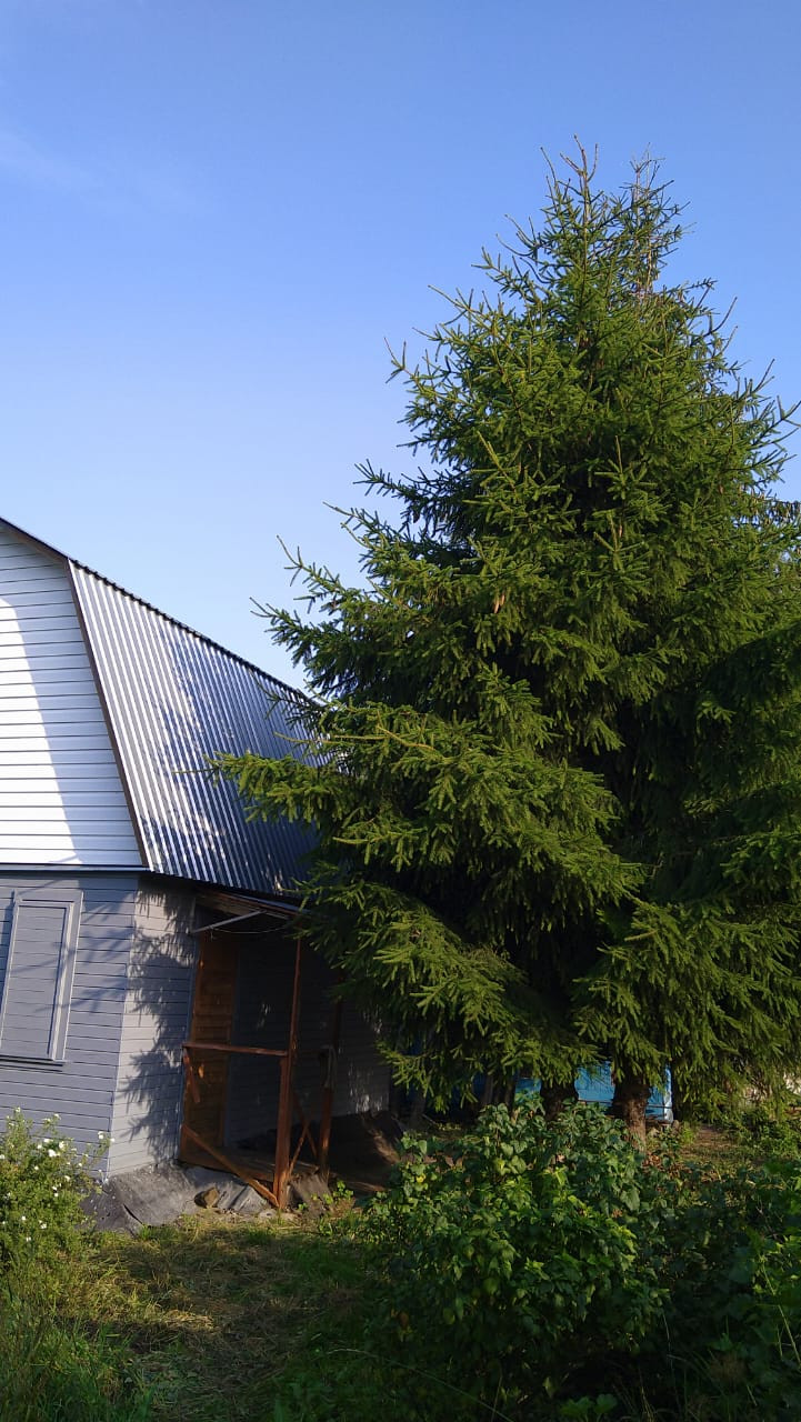 Перед входом в дом растут 2 ели.