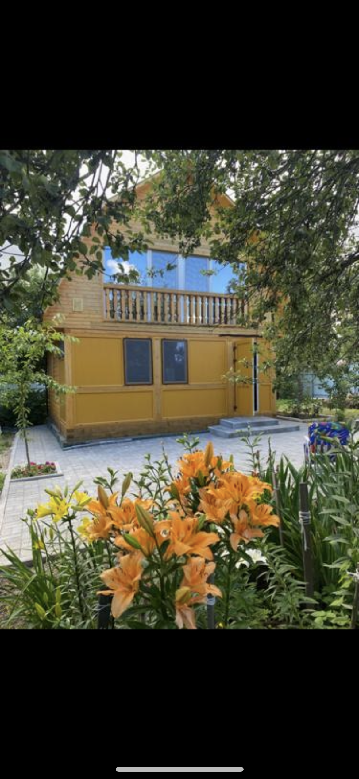 Участок 6 соток, дом из бруса в плане 6x6, 2этажный. Во дворе брусчатка.