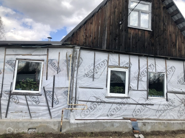 Дом деревянный, утеплитель из эковаты, внутренняя отделка из деревоплиты. На 1 этаже просторная комната 30 м, кухня 18 м, веранда 9 м, пластиковые окна. Второй этаж недостроен, проложены балки.