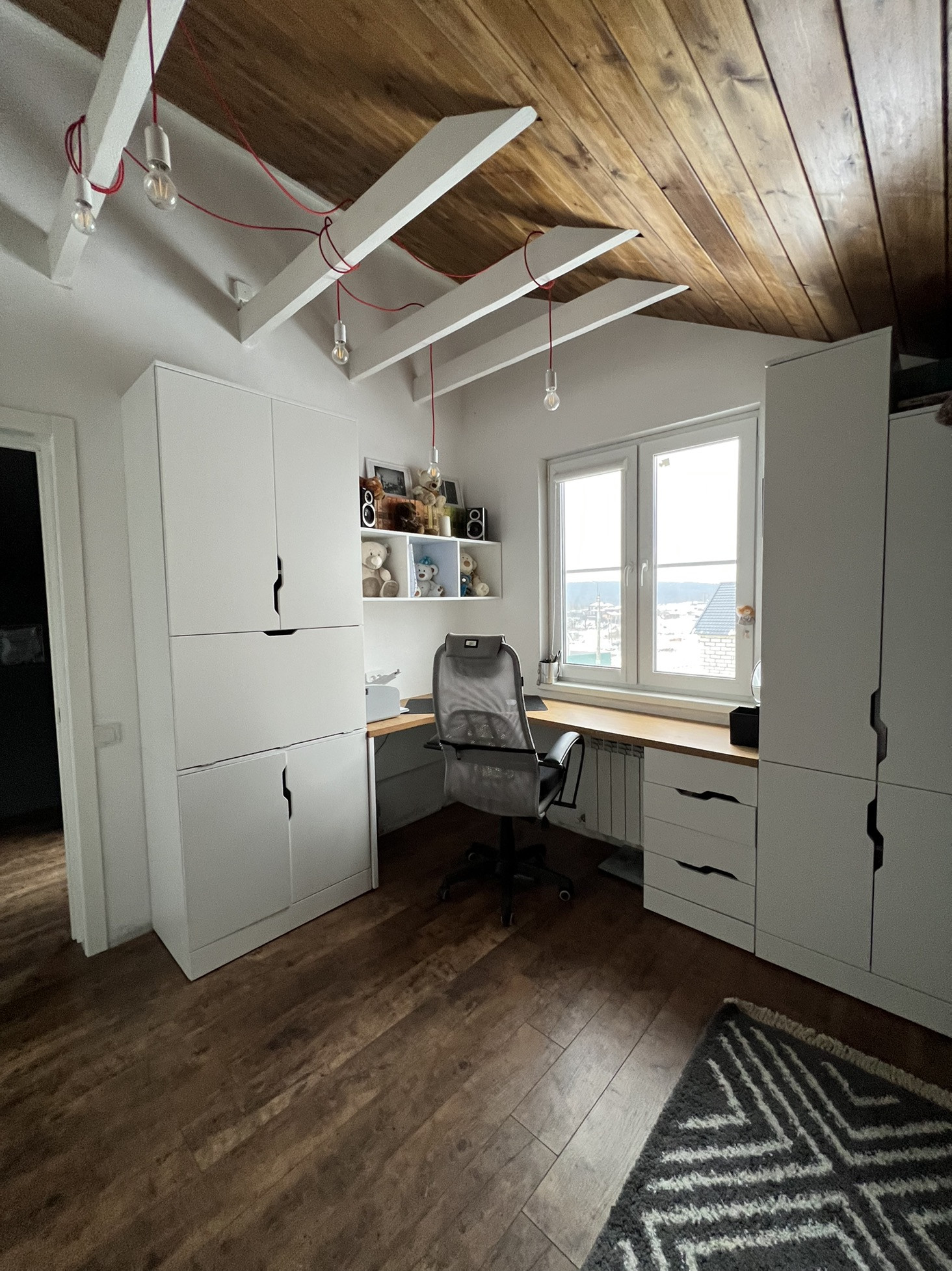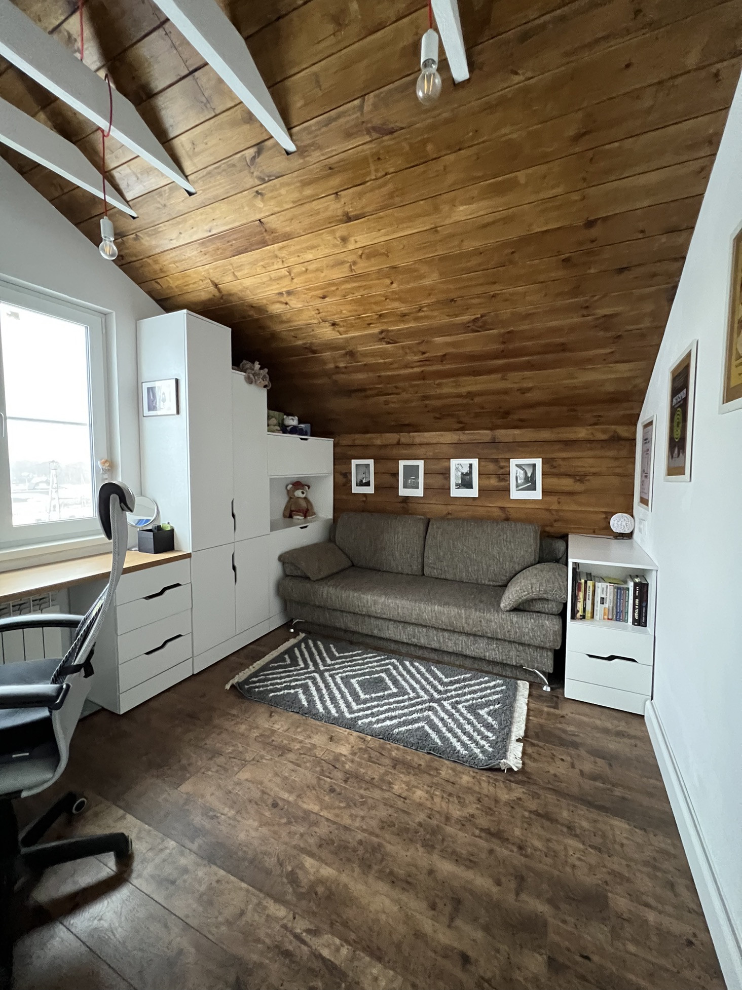 - Кабинет (или детская) (10,6 м2). С удобным раскладным диваном, шкафами и системой хранения для компьютера и принтера. Большая рабочая зона перед окном.