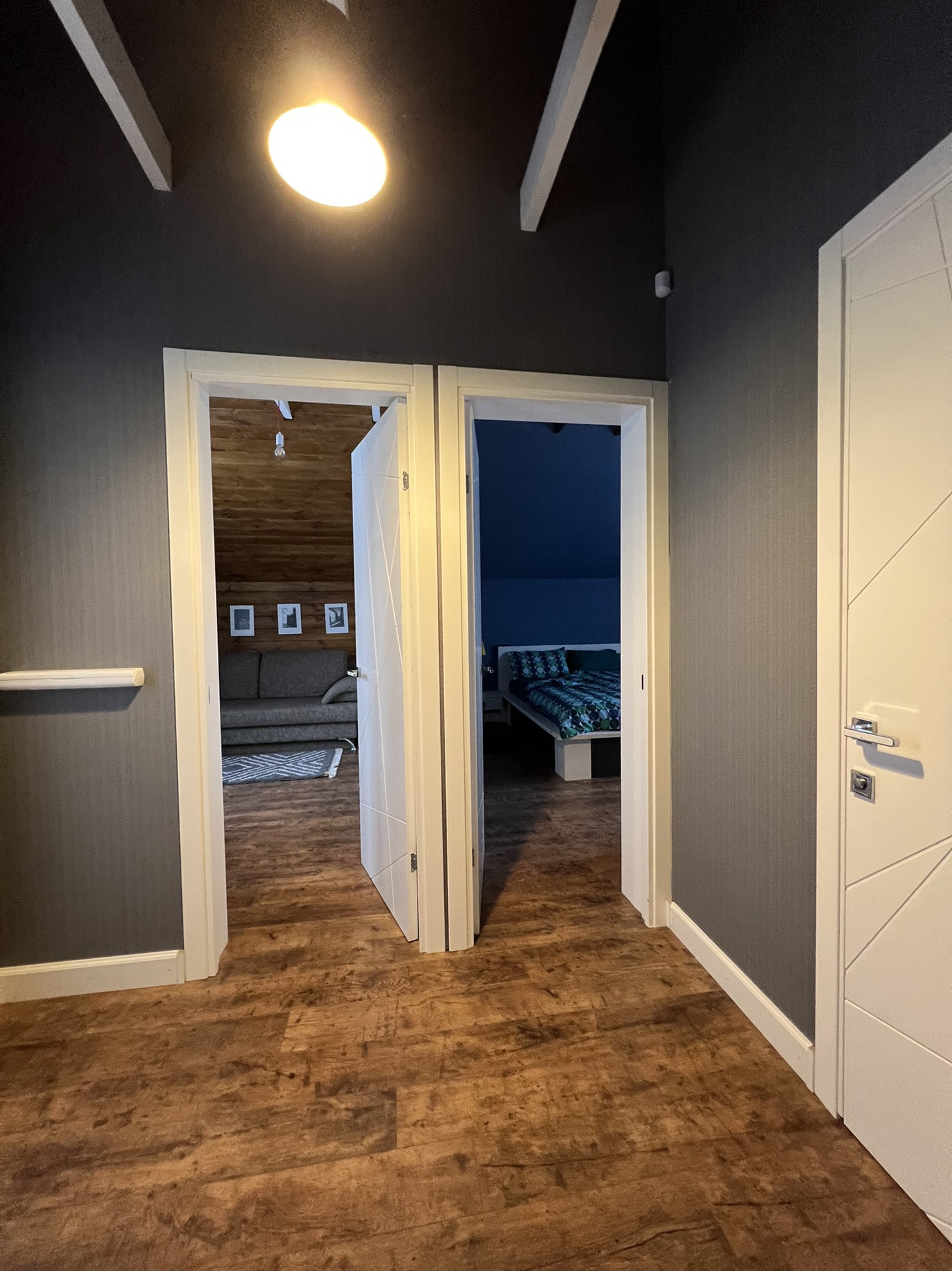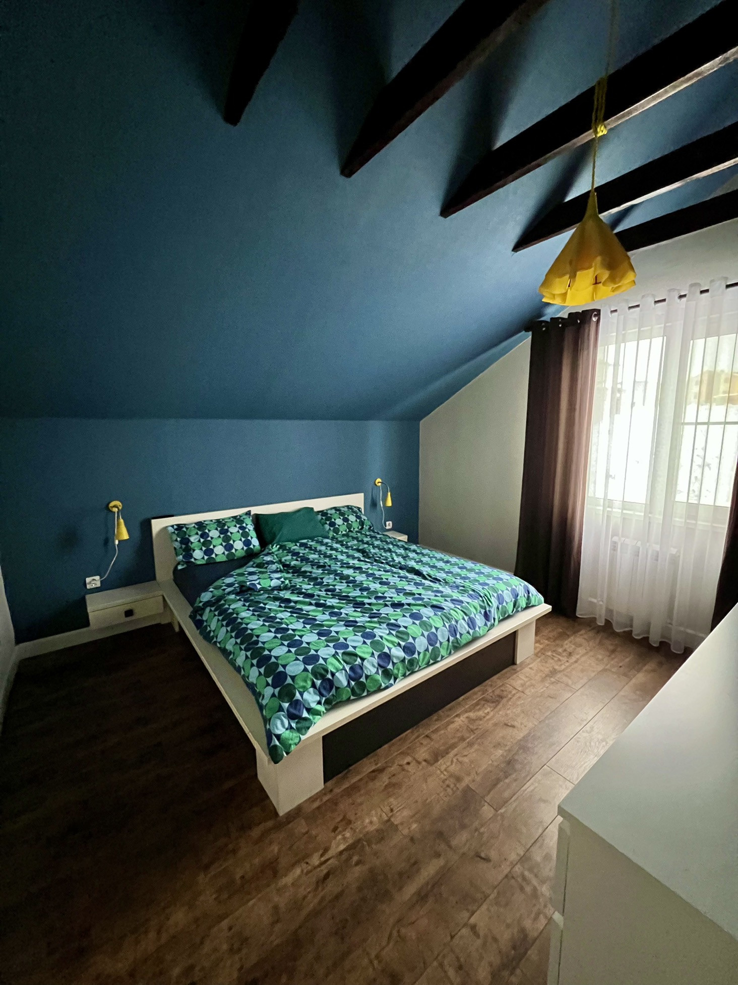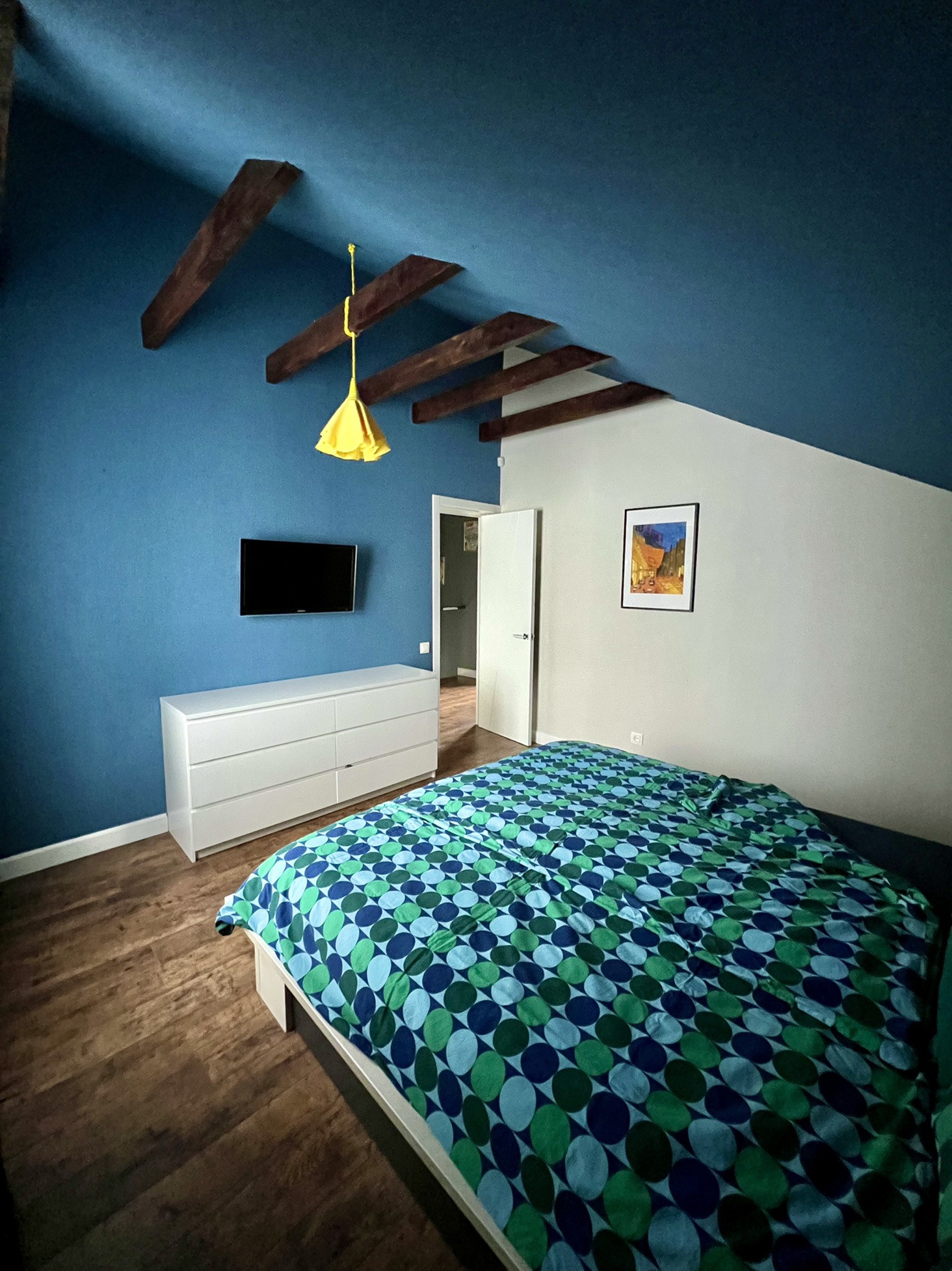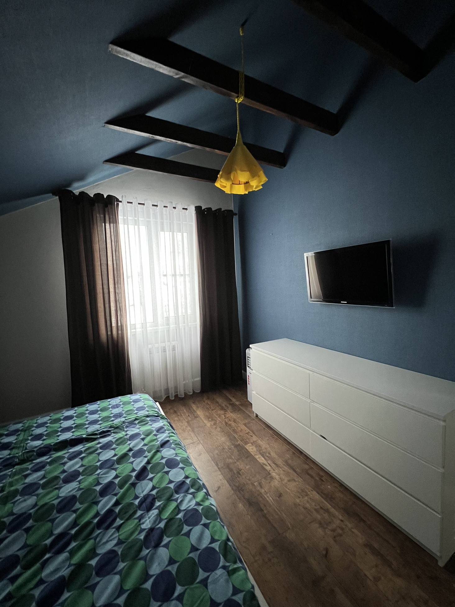- Спальня (13,8 м2). Ничего лишнего: большая кровать 180*200 с ортопедическим матрасом, комод, телевизор, бра, люстра ручной работы.