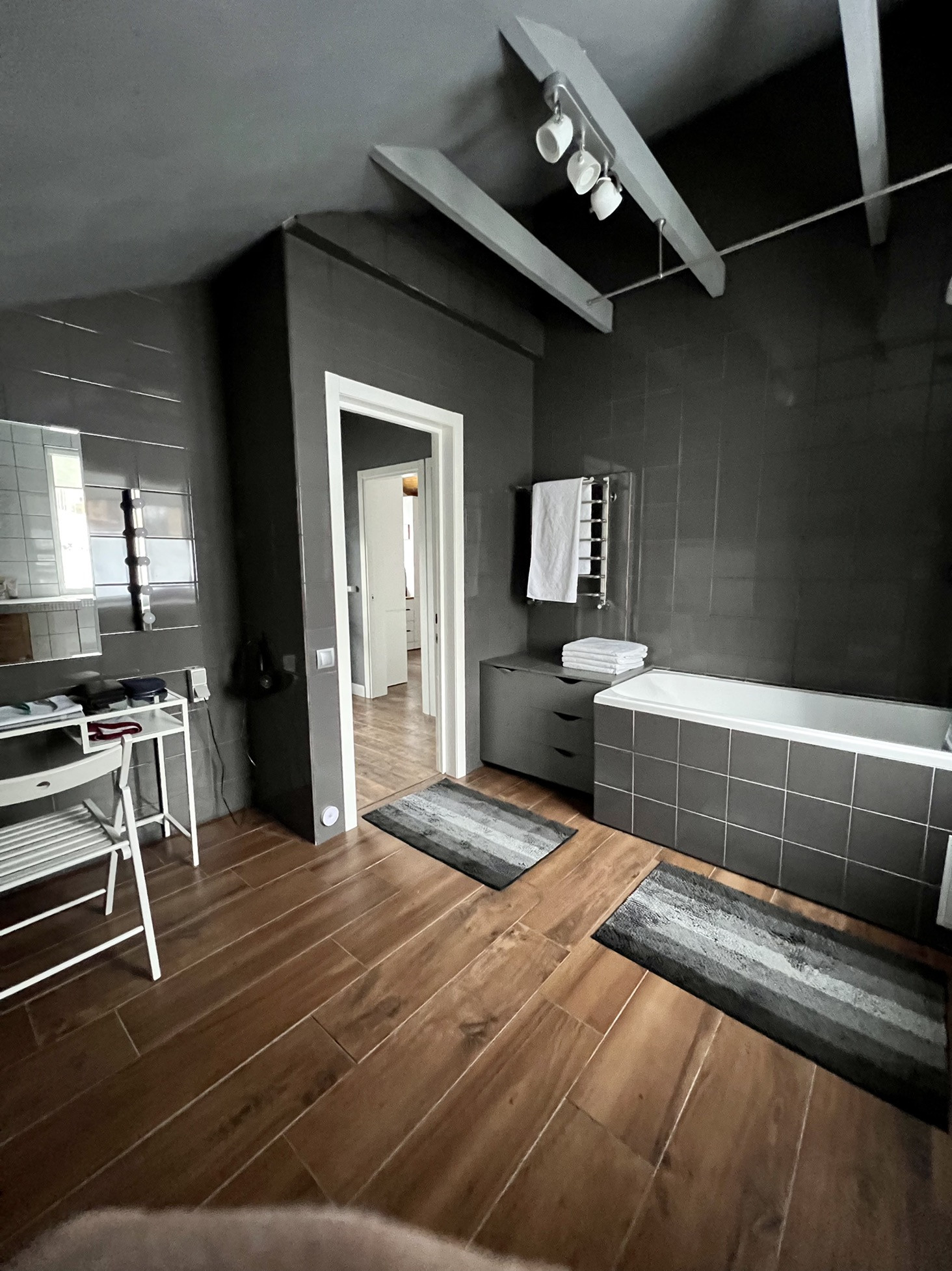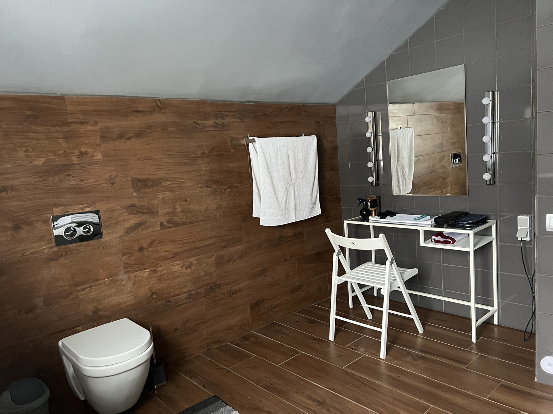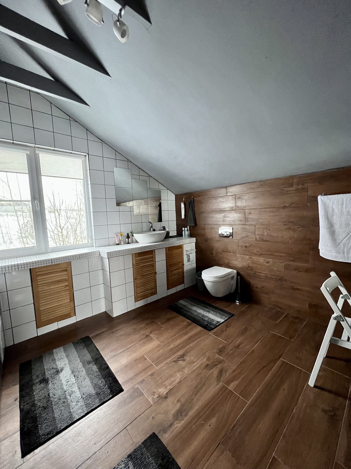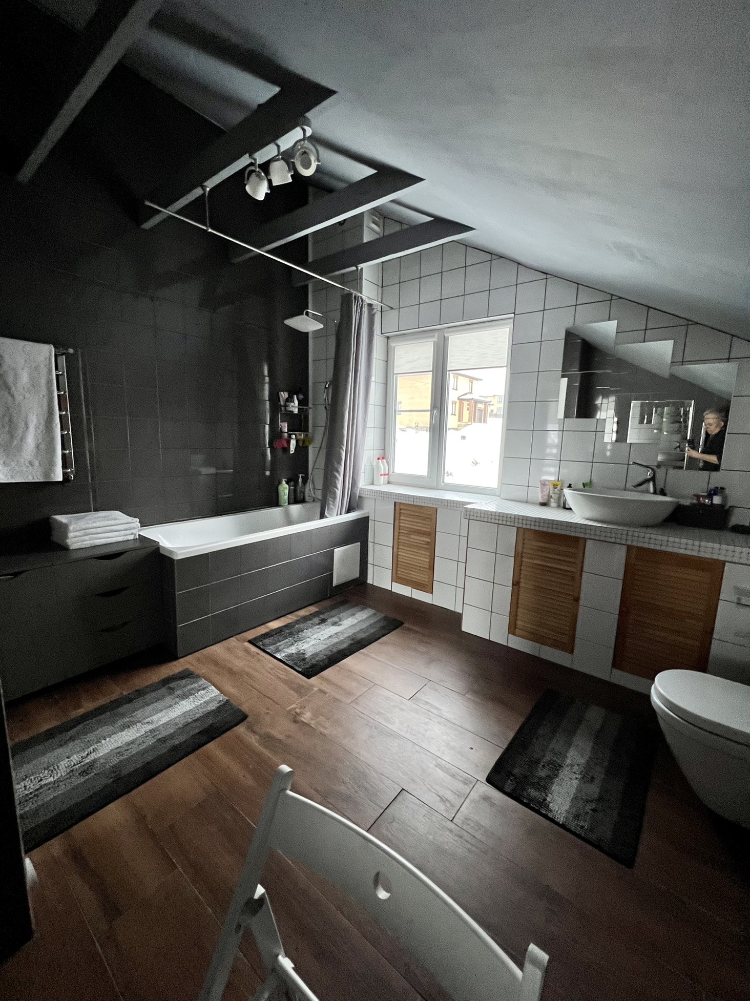 - Совмещенный санузел (11,5 м2) с окном. Зона будуара с большим зеркалом и доп. подсветкой.