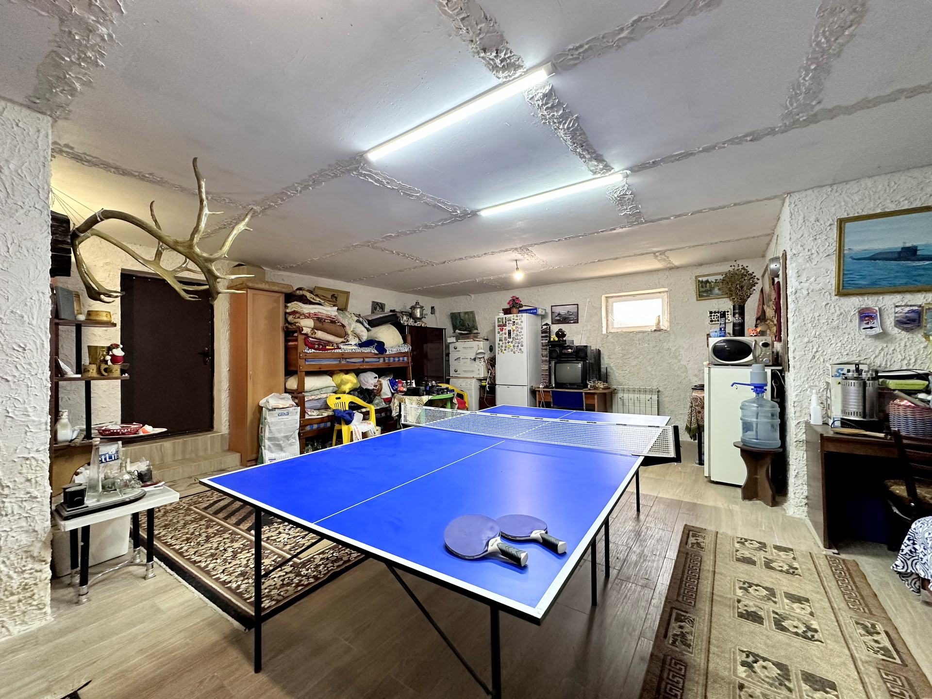 - На цокольном этаже теннисный стол, кладовка, склад, газовый котел и выход на другую сторону дома (можно оборудовать спортзал).