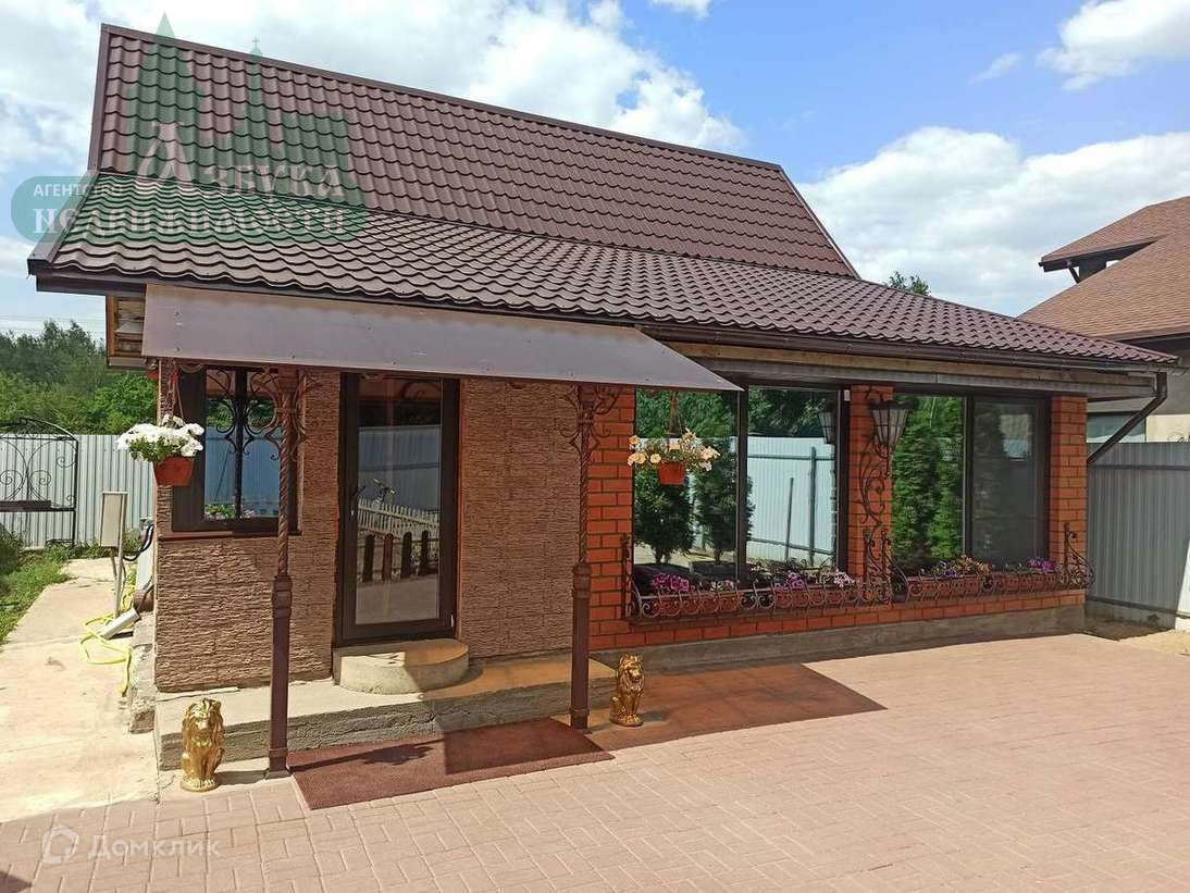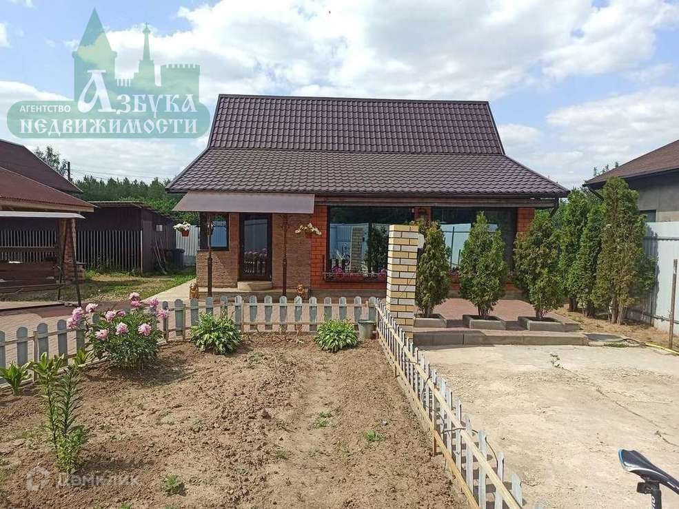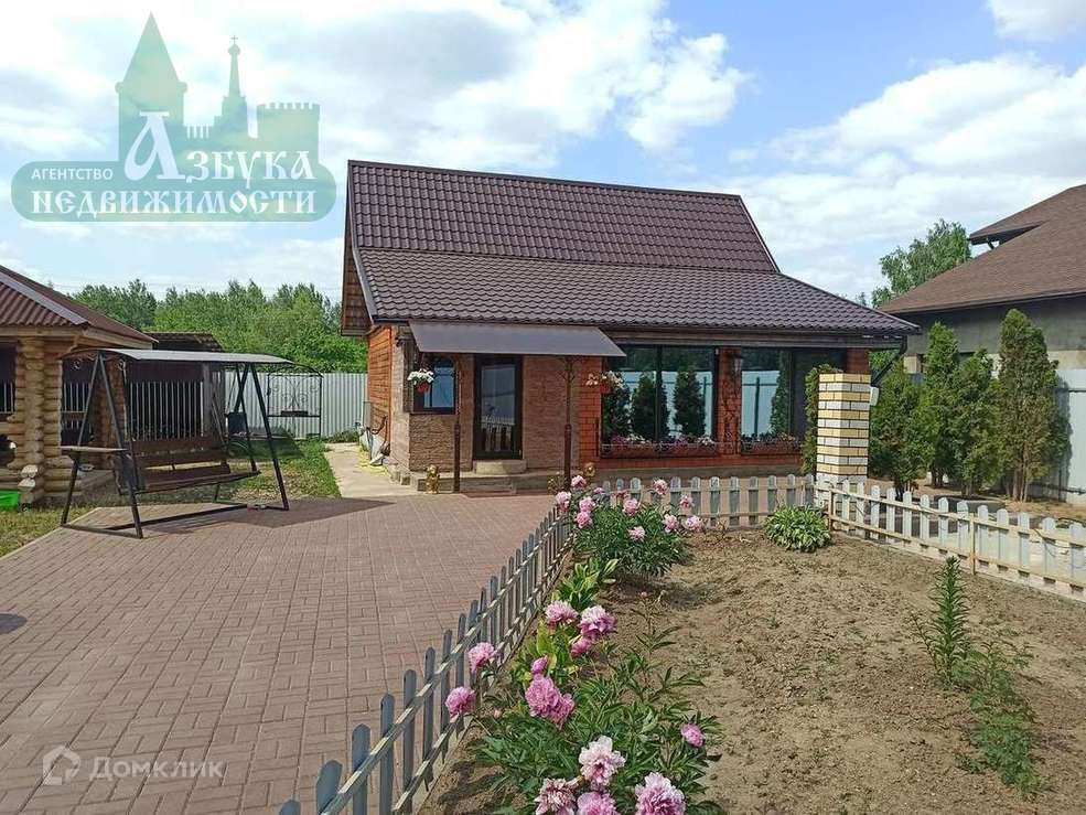 Придомовая территория выложена брусчаткой, на участке: просторная деревянная беседка, большой вольер для собаки с будкой, качели, зона барбекю.