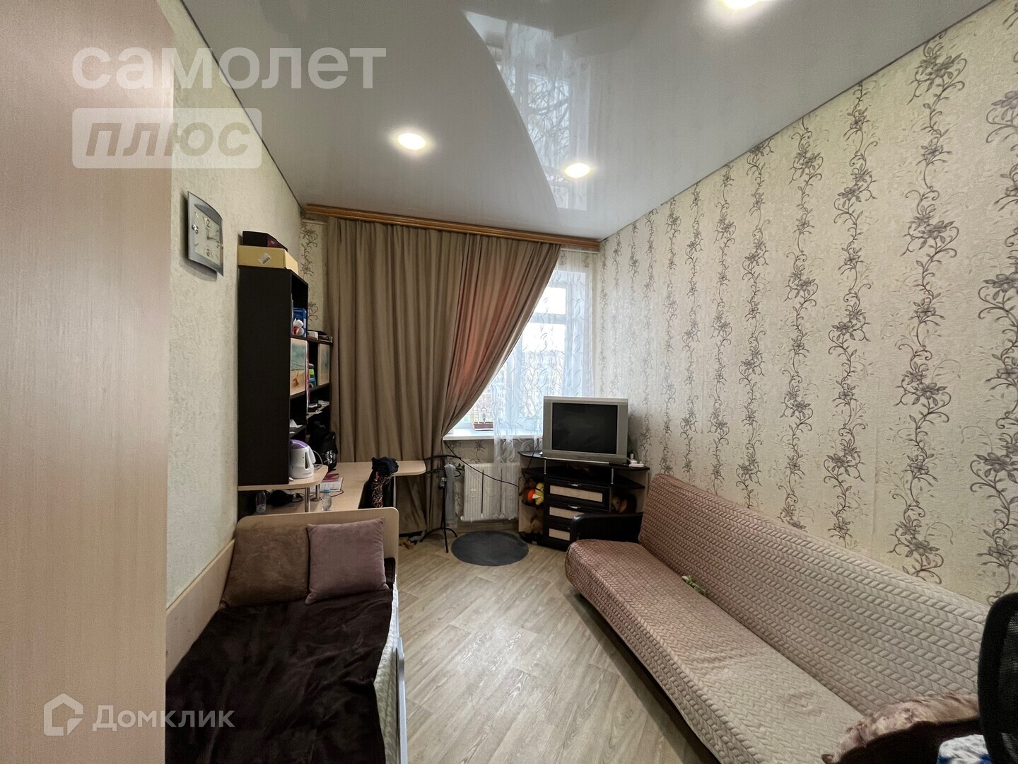Квартира находится в середине дома, в комнате окно заменено на ПВХ и выходят во двор, хорошая входная дверь, натяжной потолок, на полу ламинат, хорошие обои, имеется гардеробная. Бонусом кладовка для хранения.