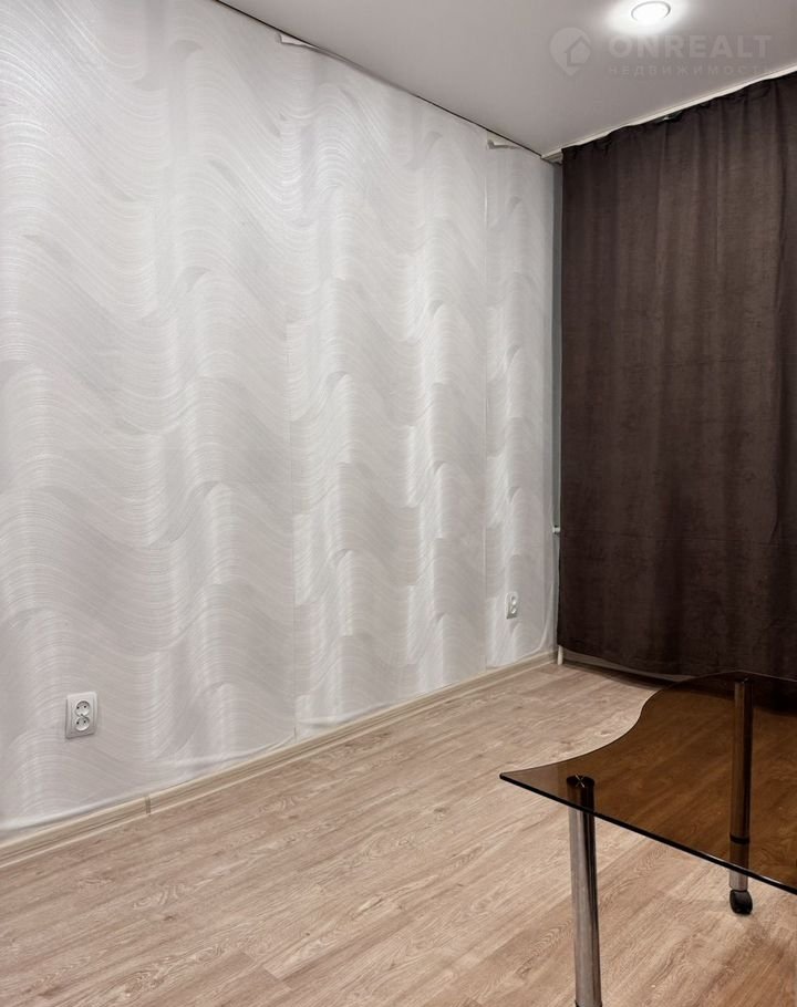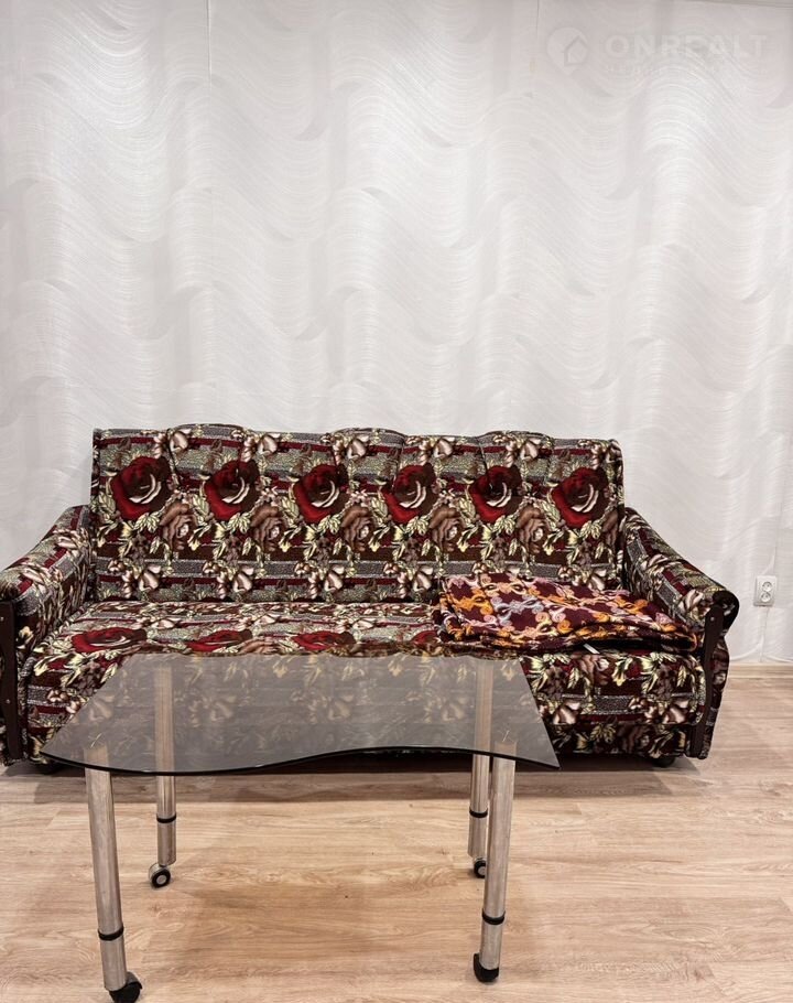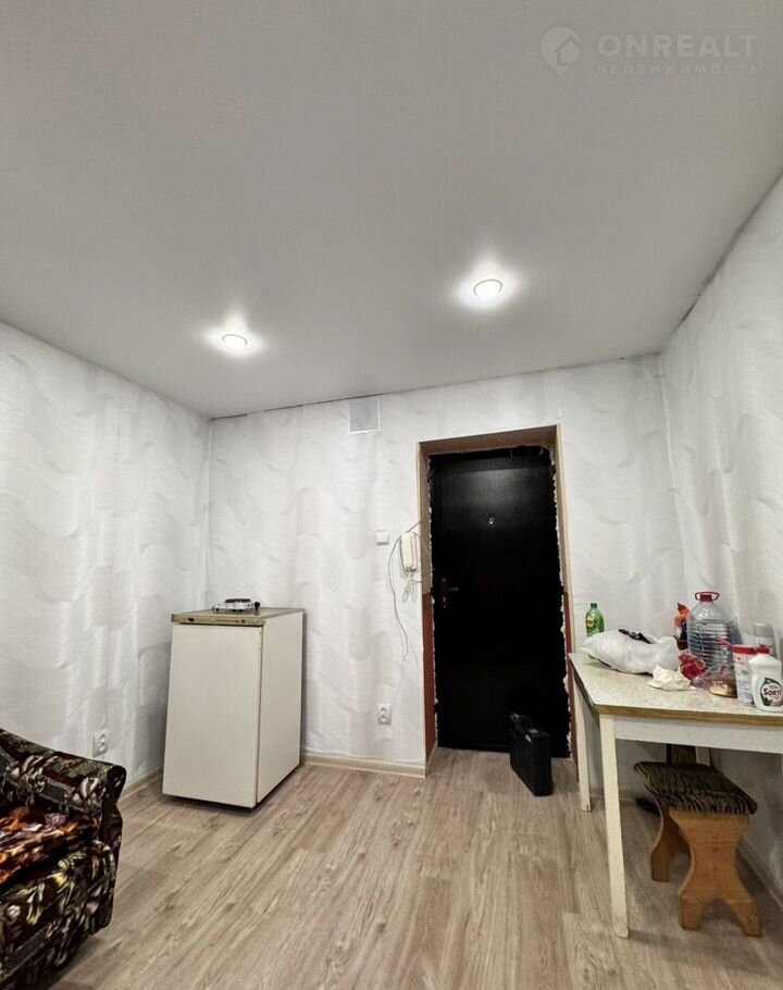 В кoмнaте сдeлaн pемонт: натяжные потолки с точечными светильниками (управление с пульта), светлые обои, новый ламинат, установлена новая железная дверь, заменены розетки и выключатель. Комната с балконом. В комнате диван, холодильник, электроплитка и журнальный столик.