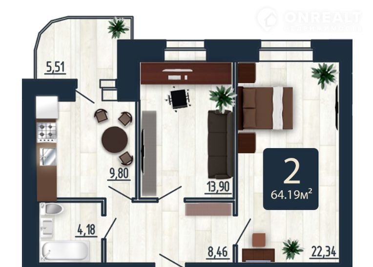 Общая площадь 64.2 м2