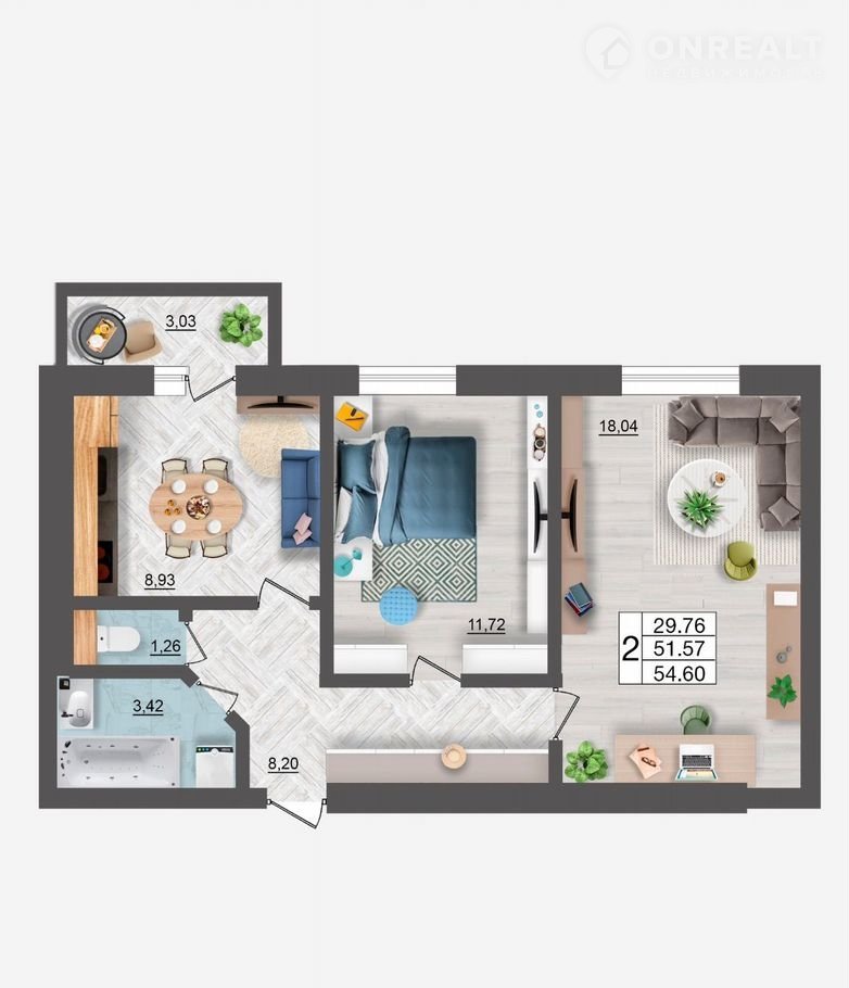 Общая площадь 54.6 м2
