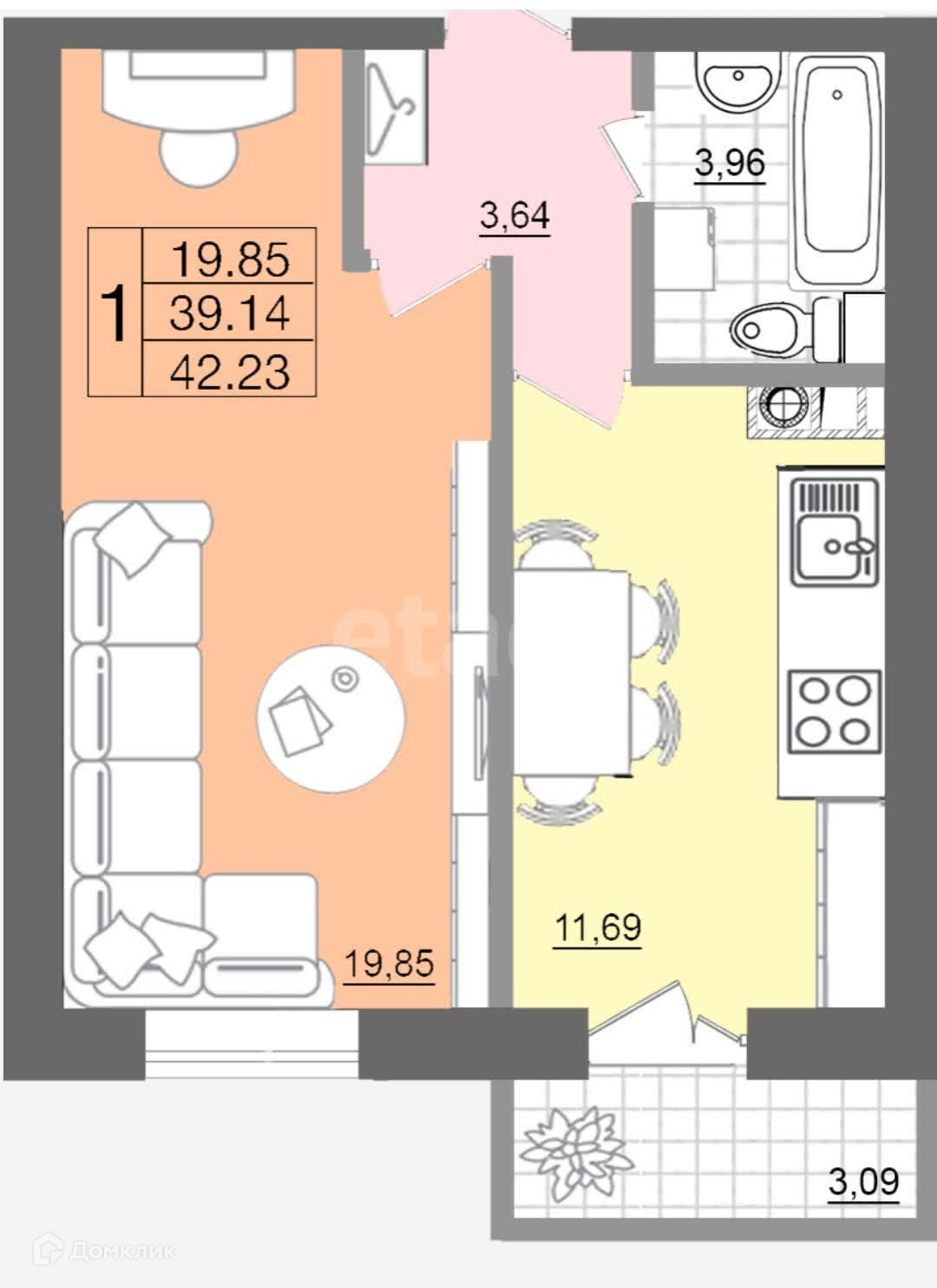 Общая площадь-42.3 кв.м., жилая-19.9 кв.м., кухня-11.6 кв.м.