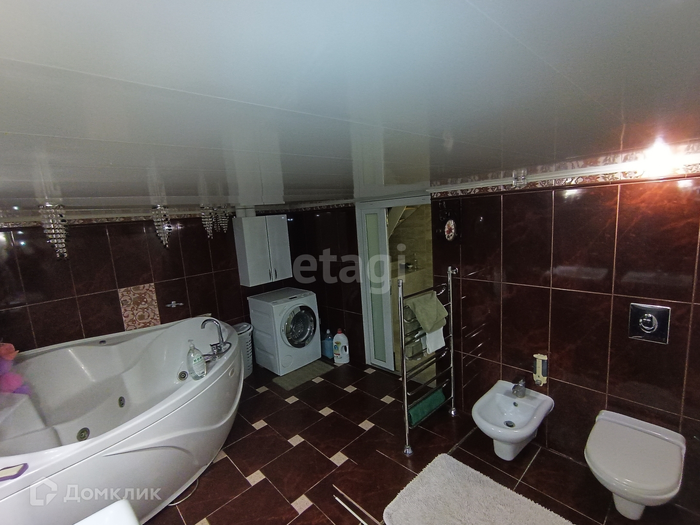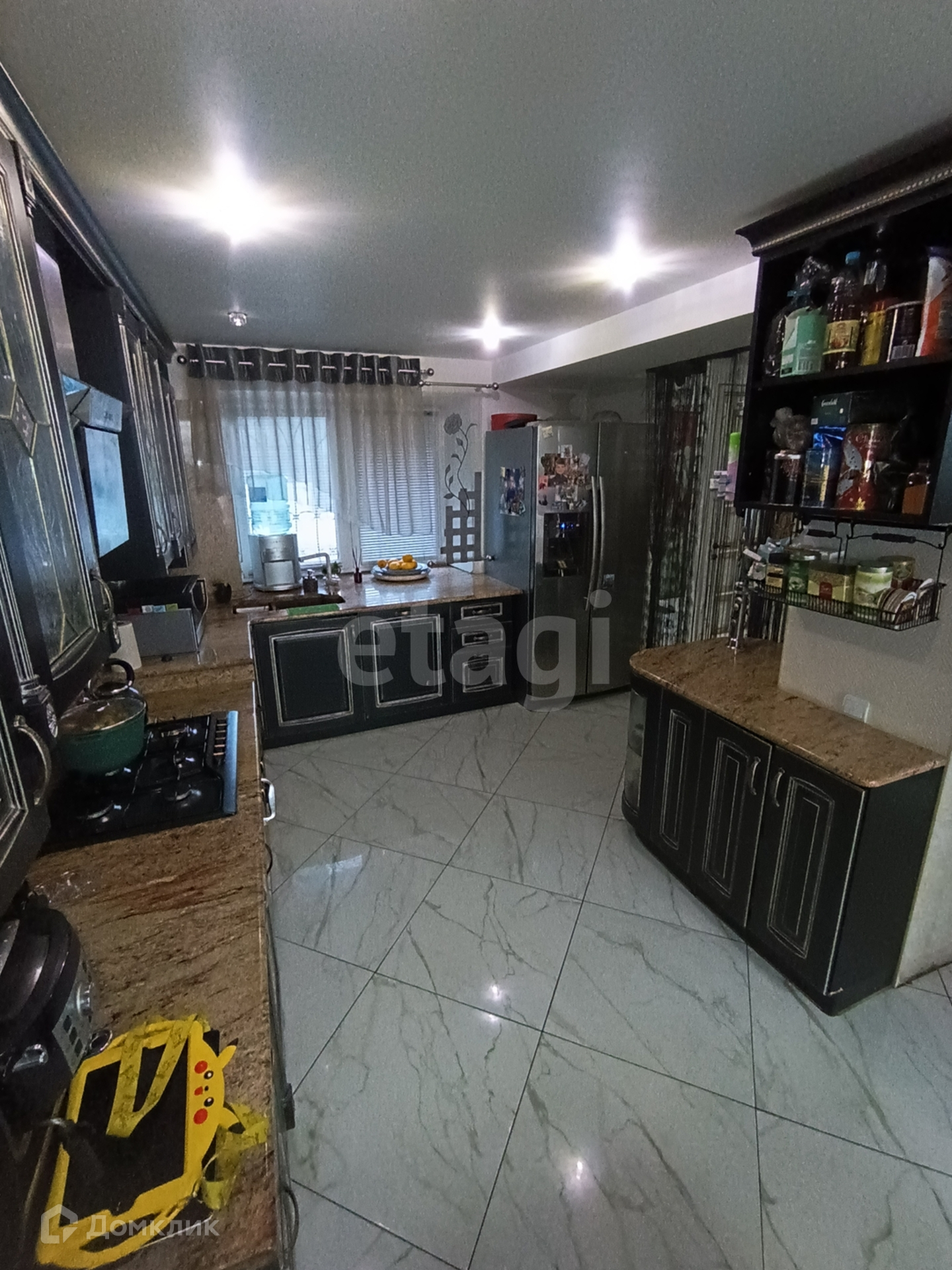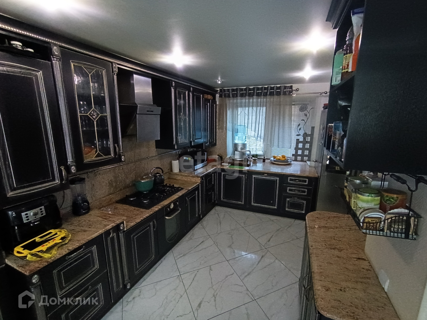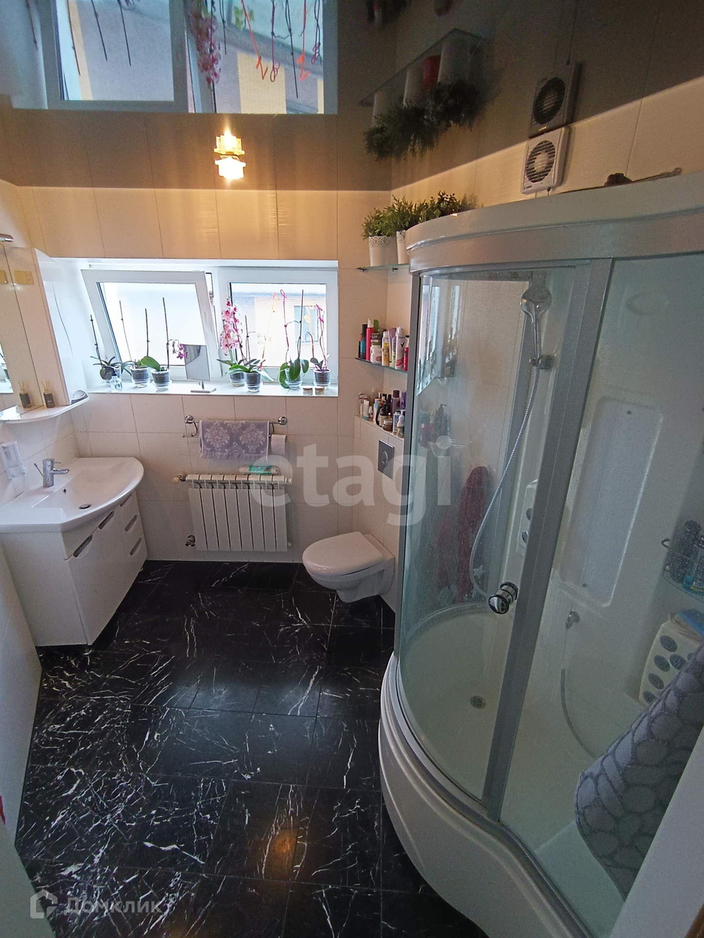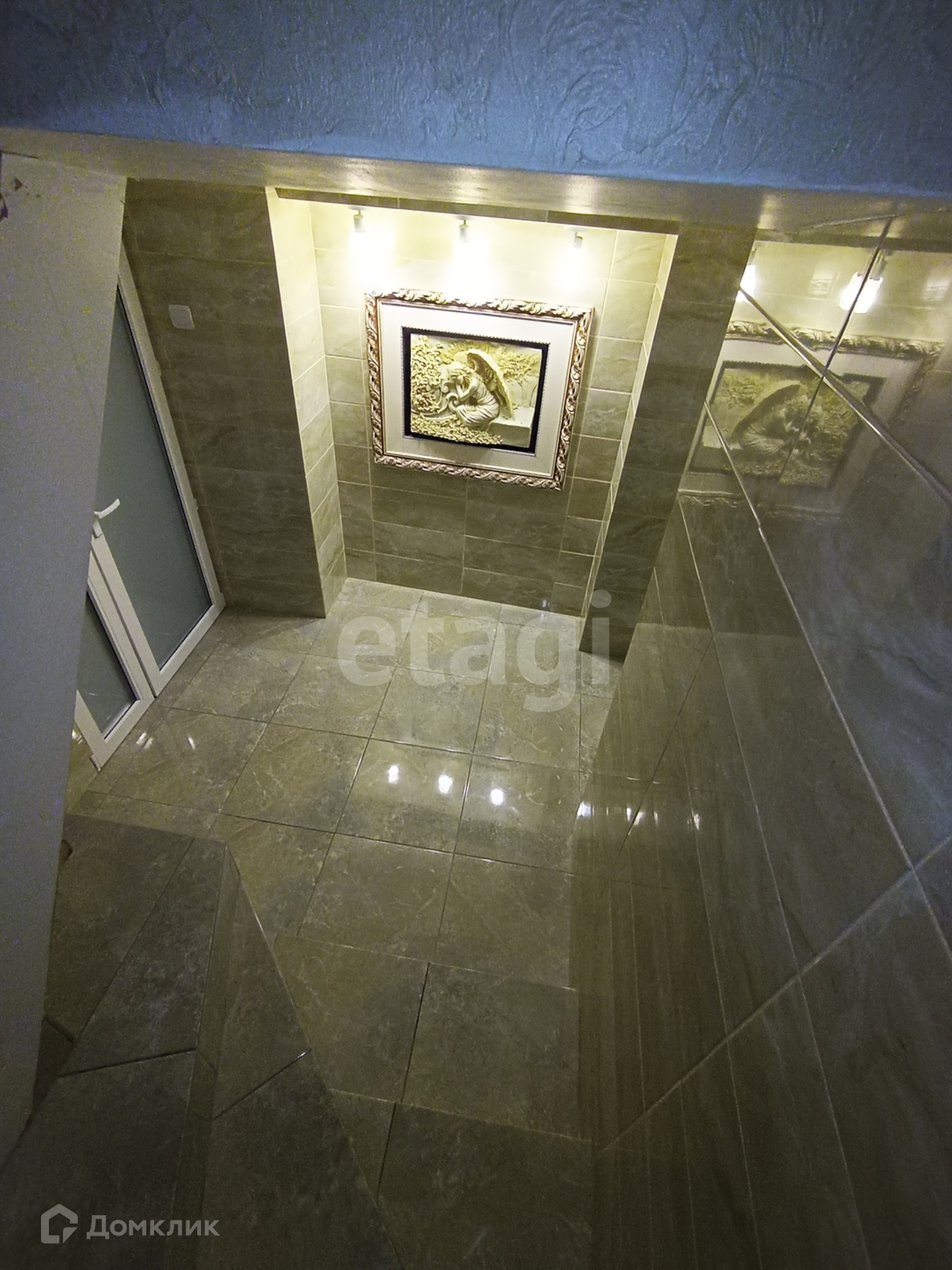 - на полу плитка керамогранит под мрамор