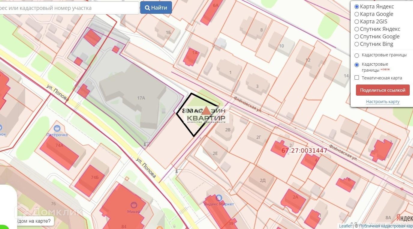 Предлагается к продаже земельный участок площадью 8 соток, расположенный по ул.Попова. К участку подведено электричество, вода, канализация  и газ по границе. Возможно использование в коммерческих целях. Кадастровый номер 67:27:0031447:121