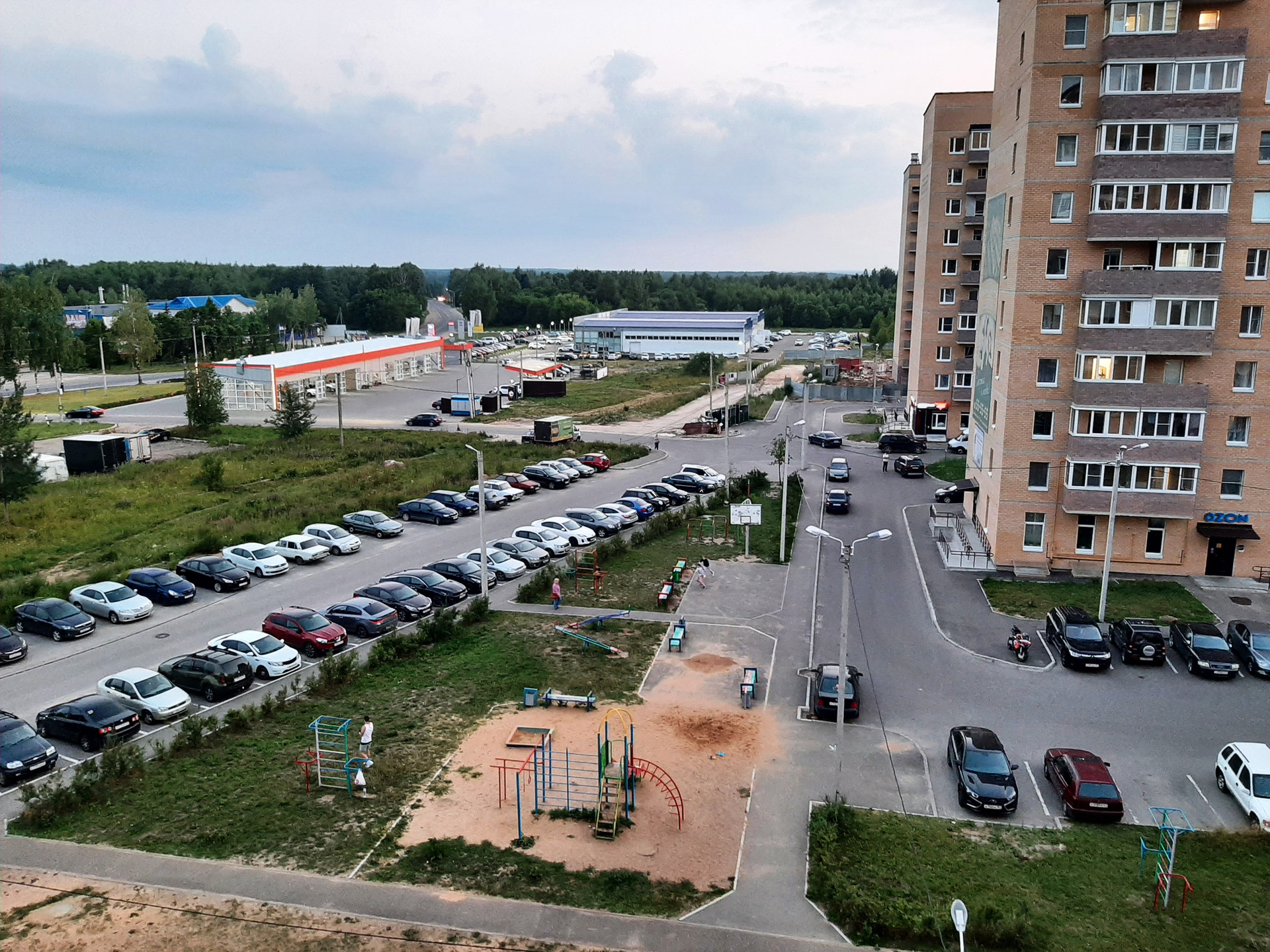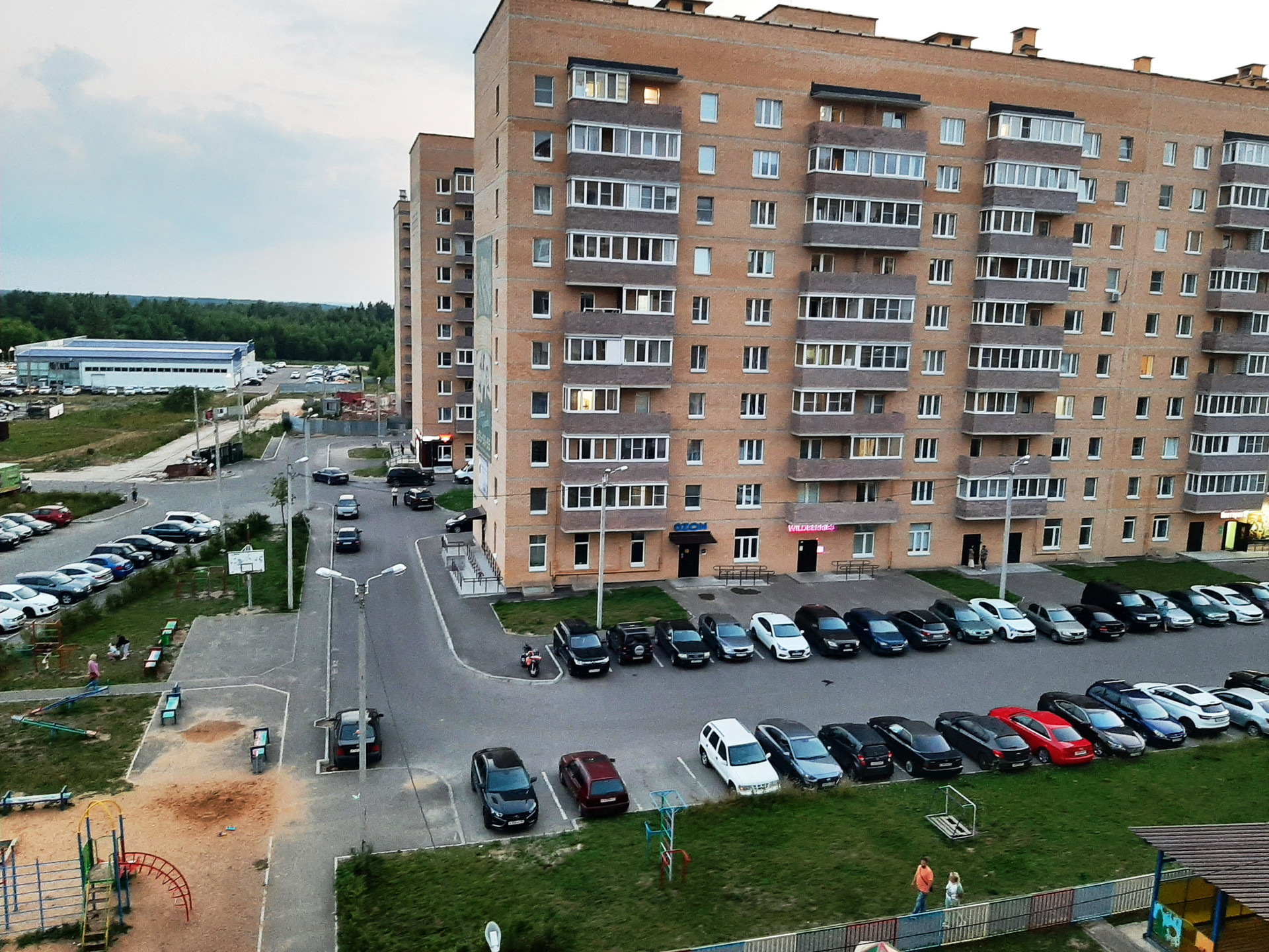 Двор большой, с несколькими детскими и спортивными площадками.