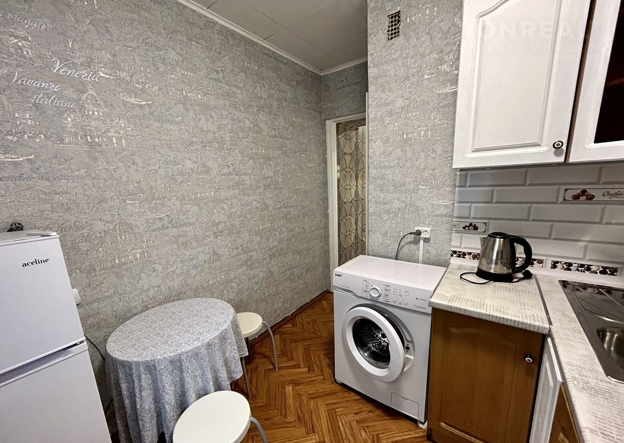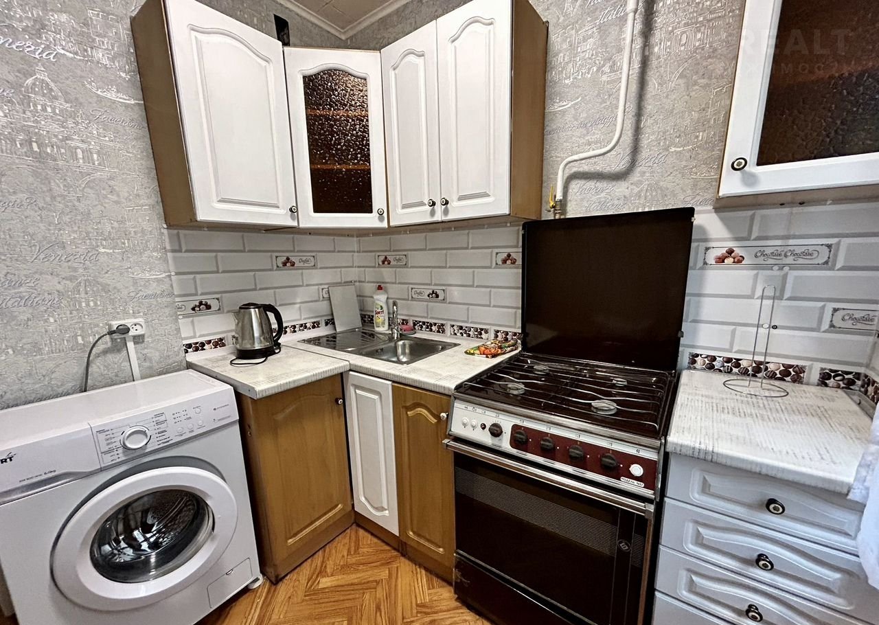 Компактная кухня оборудована современной мебелью и всей нужной для длительного проживания бытовой техникой.
