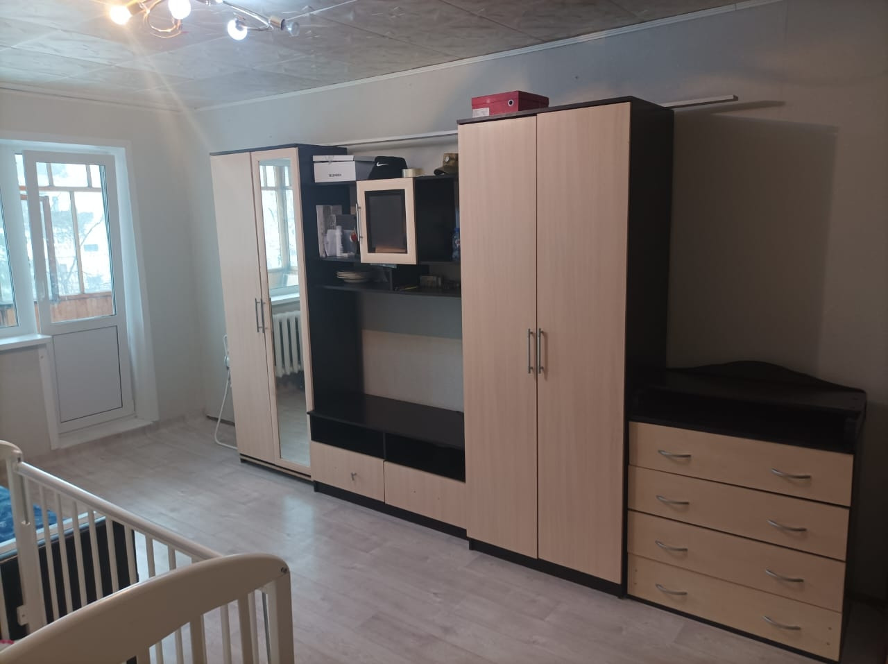 В квартире остаются шкаф и комод, старенький диван.