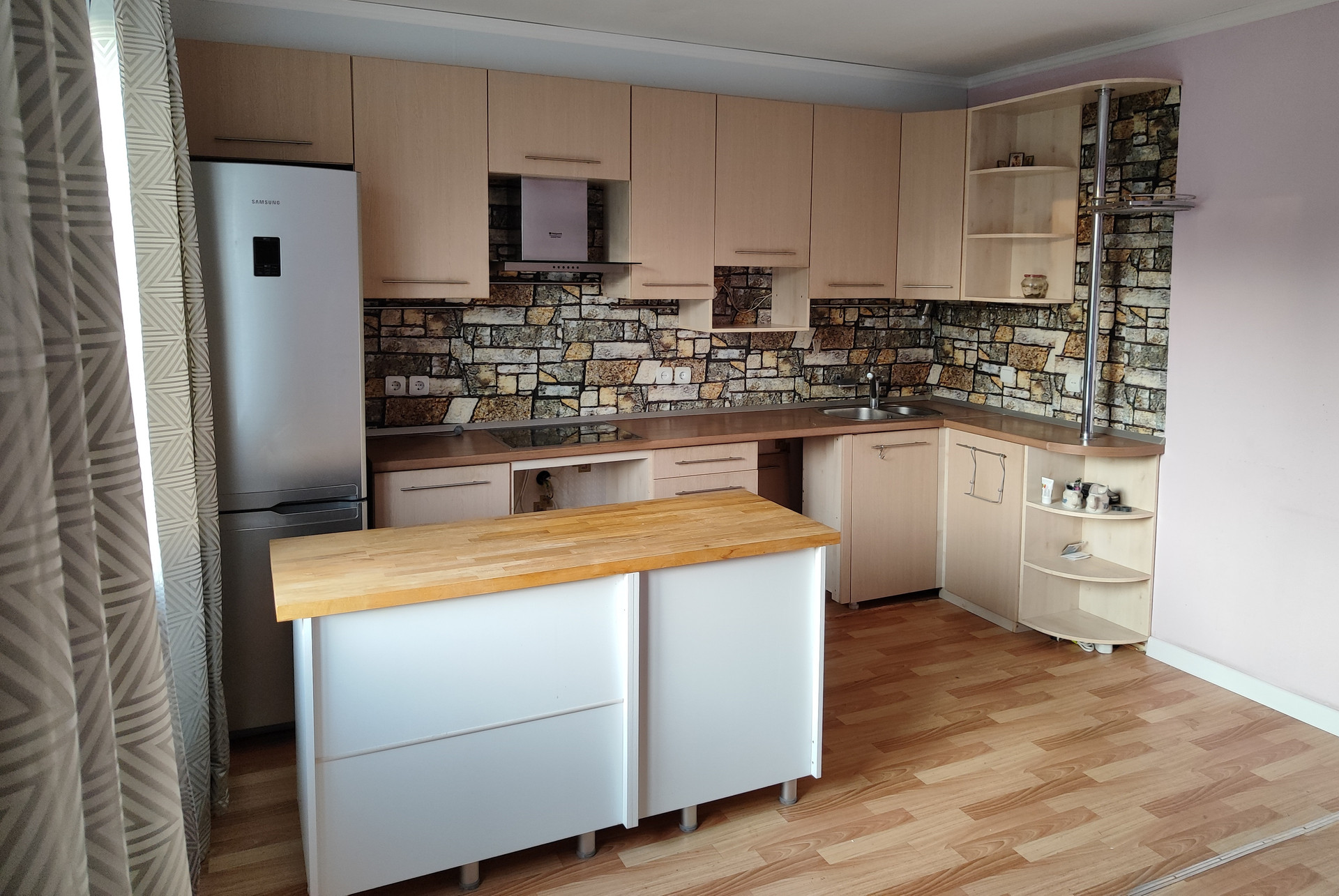Есть холодильник, варочная поверхность на 4 конфорки.Мебель имеется частично.