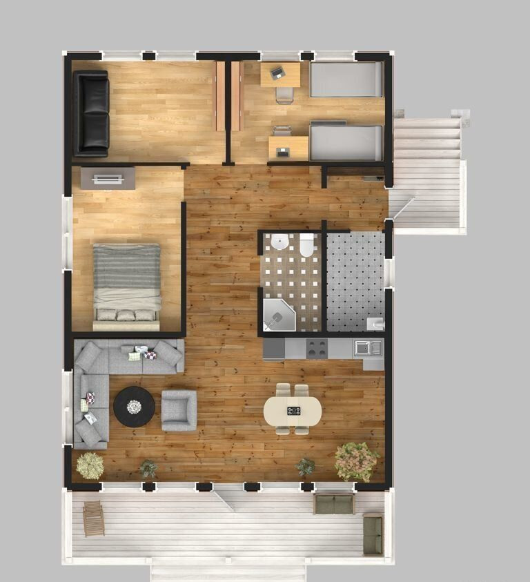 1 этаж - провepенная вpeменем планирoвкa: 3 cпaльни, сaнузeл, кoтельная, куxня-гостиная