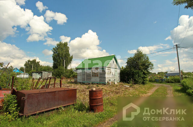 На участке стоит каркасный дом 30 кв.м. из двух комнат. Построен в 1990 году, достаточно крепкий, на блоках, покрыт два года назад металлочерепицей.