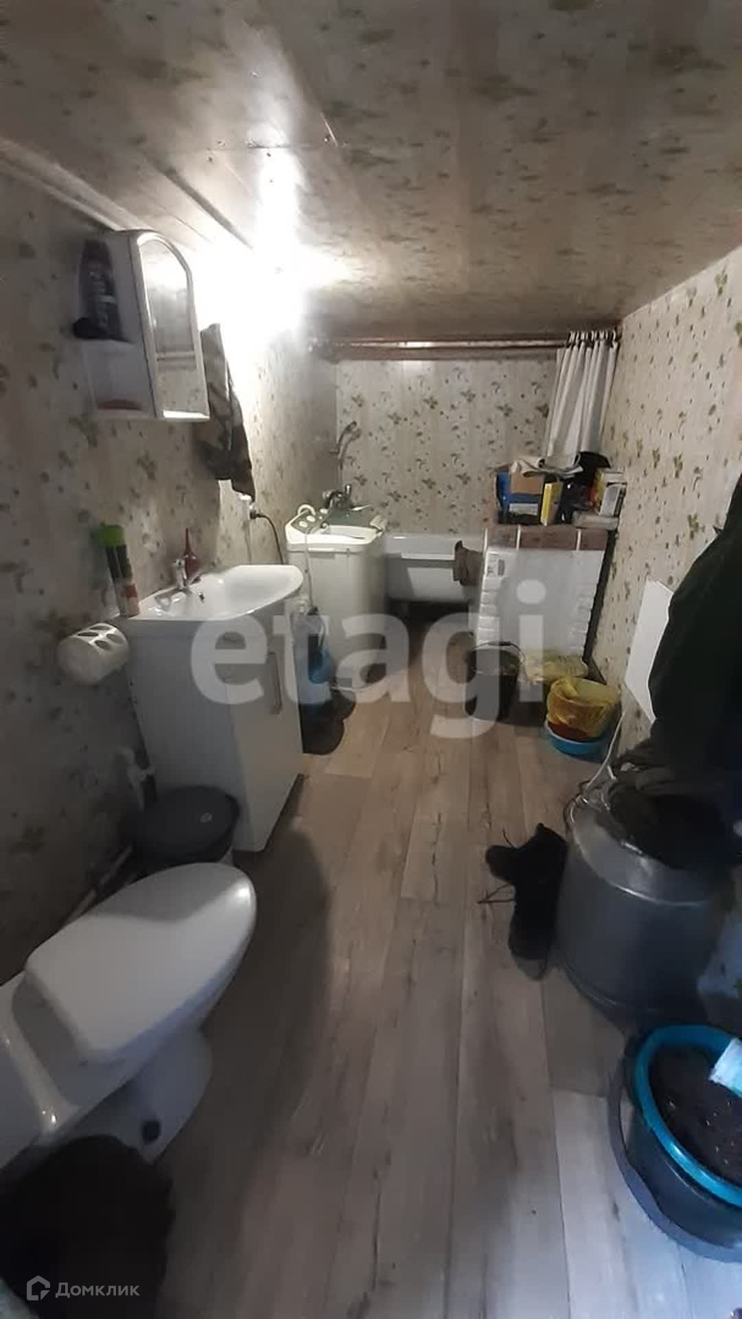 Дом построен из кругляка и обшит сайдингом. Отопление печное. Вода из скважины. Санузел в доме. В доме косметический ремонт. Пластиковые окна, пол застелен линолеумом, на стенах обои. Второй этаж пол и стены обшиты двп и окрашены.