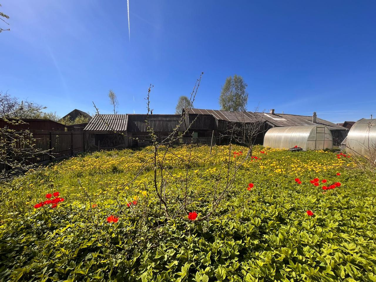 На участке плодовые деревья: яблони, крыжовник, смородина, цветы.