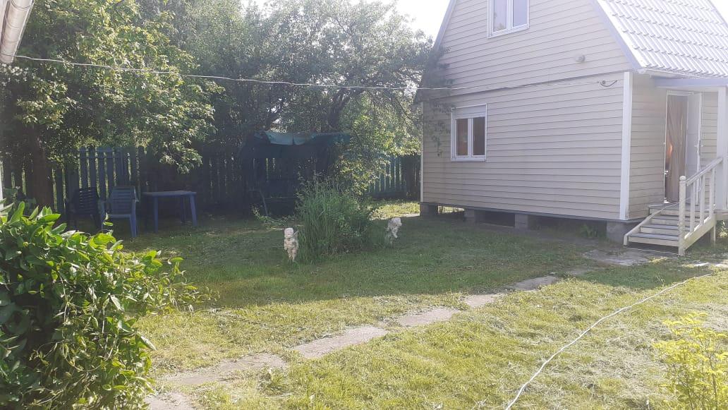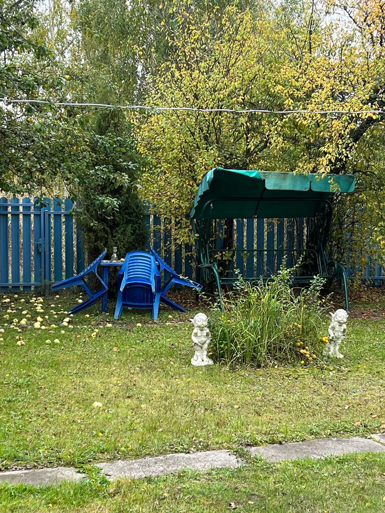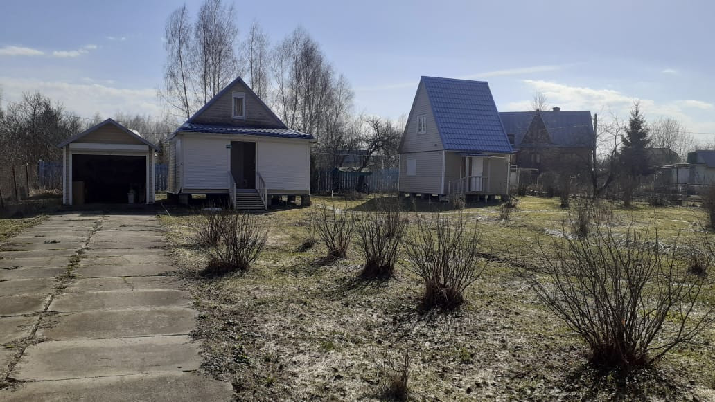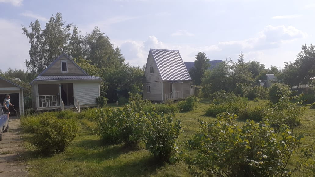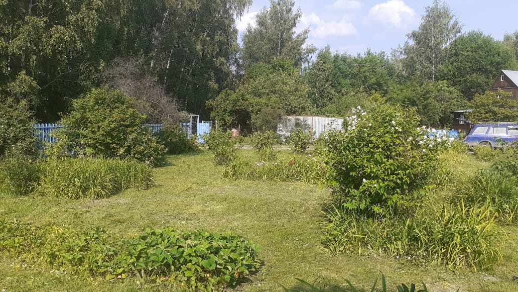 Участок 10 соток правильной формы огорожен со всех сторон. На участке расположен просторный гараж, летний душ. Место стоянки автомобиля вплоть до гаража выложено плитами. Соседи только с двух сторон. С участка выход в лес. На участке растут яблони, сливы, смородина, крыжовник, клубника, айва, малина. На всей территории ухоженный газон, цветы.