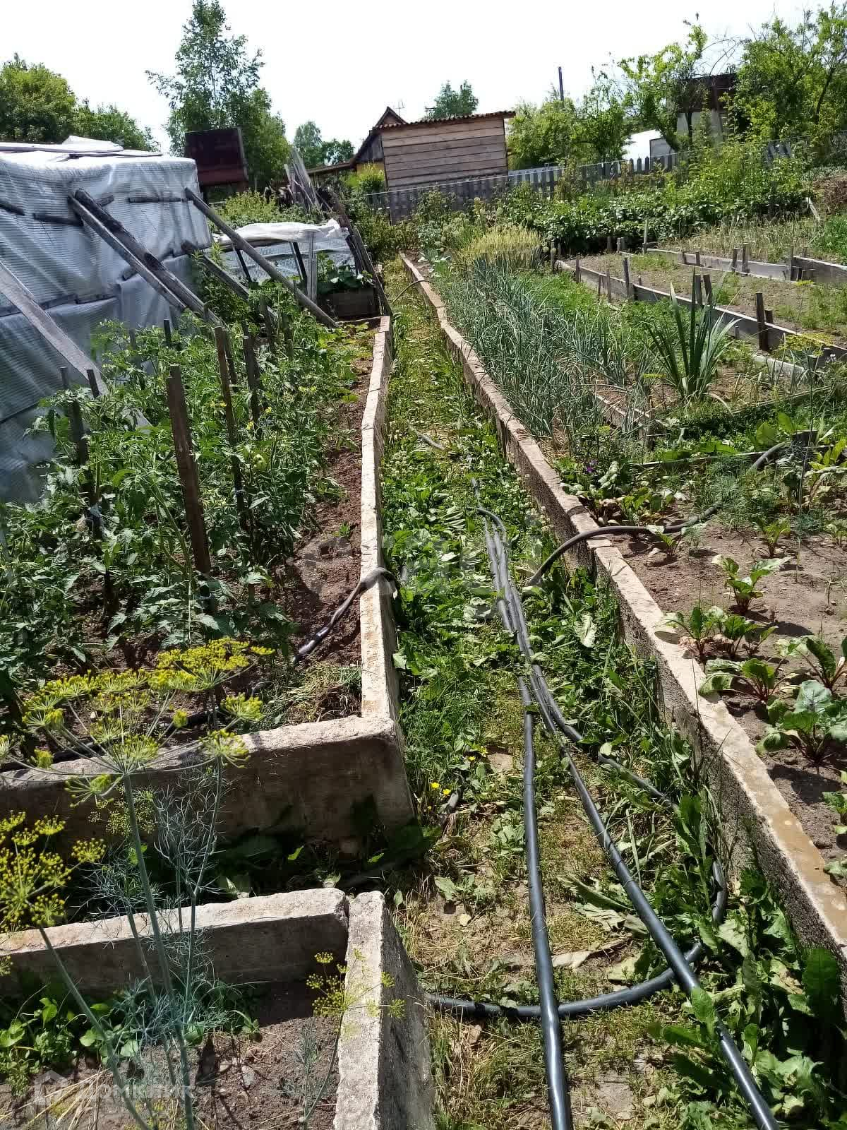 В отдельной постройке небольшой сарай для инструментов и летняя кухня. Поликарбонатная теплица 4*2м, одна плёночная теплица 8м.