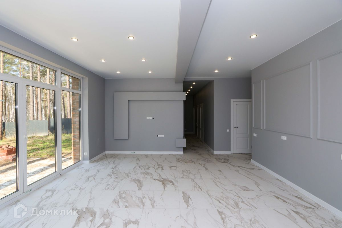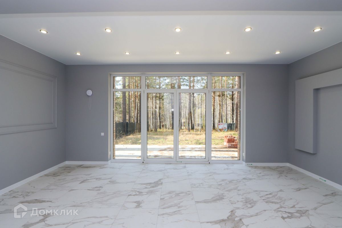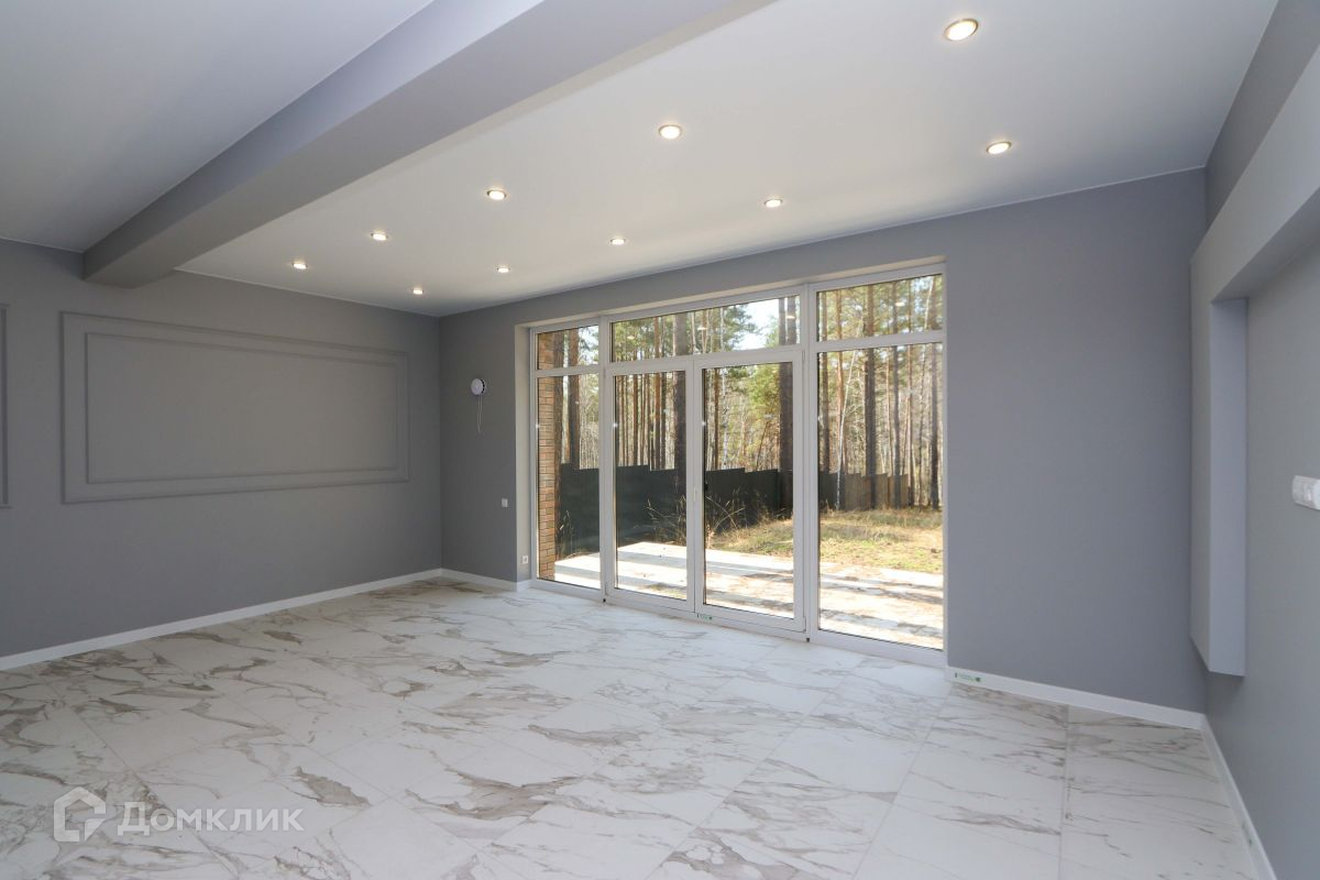 Просторная кухня-гостиная с панорамными окнами, с потрясающим видом на лес. С этой стороны дома нет забора, т.к. за ней находятся земли лесных хозяйств, поэтому Вам не придется смотреть на забор соседей.