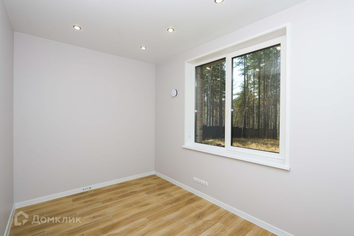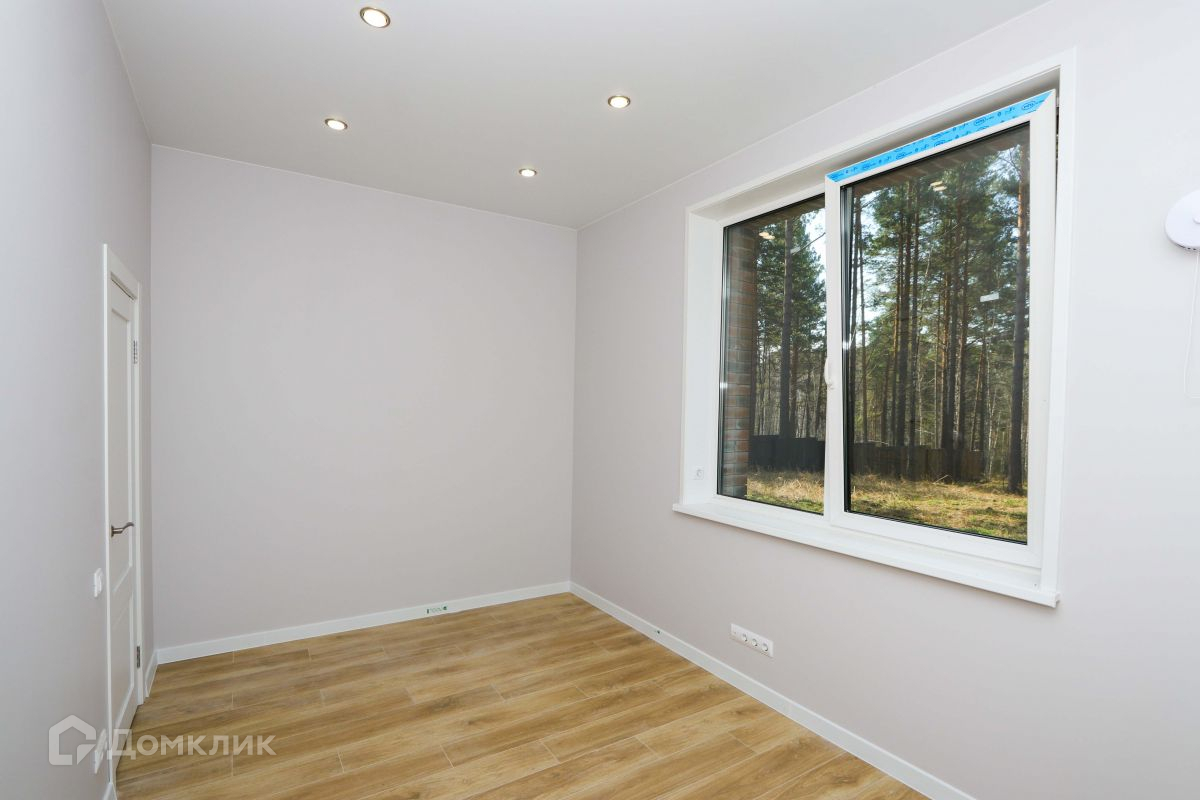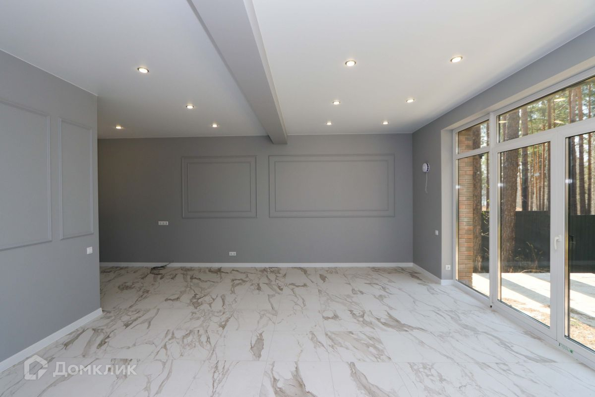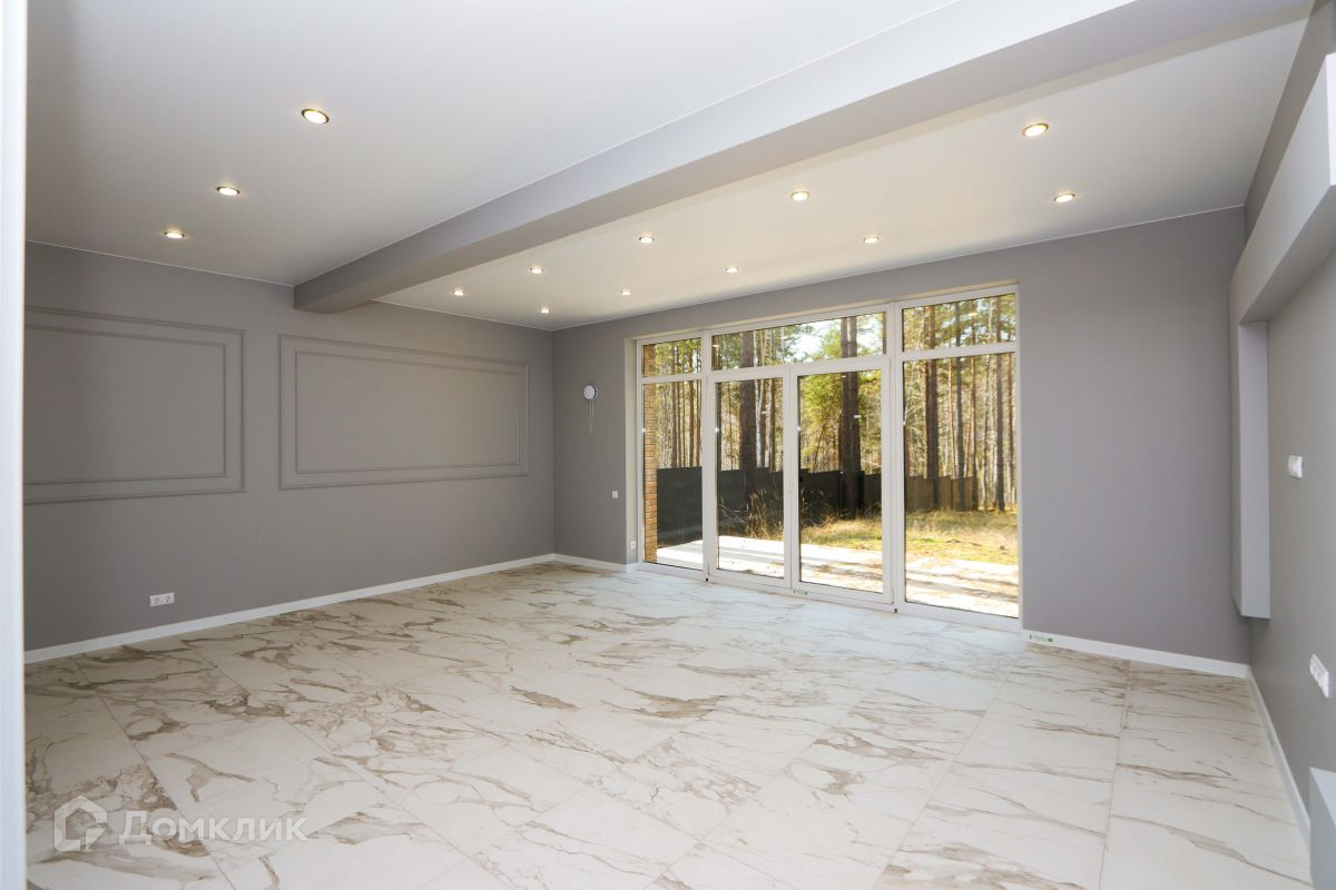 Просторная кухня-гостиная с панорамными окнами, с потрясающим видом на лес. С этой стороны дома нет забора, т.к. за ней находятся земли лесных хозяйств, поэтому Вам не придется смотреть на забор соседей.