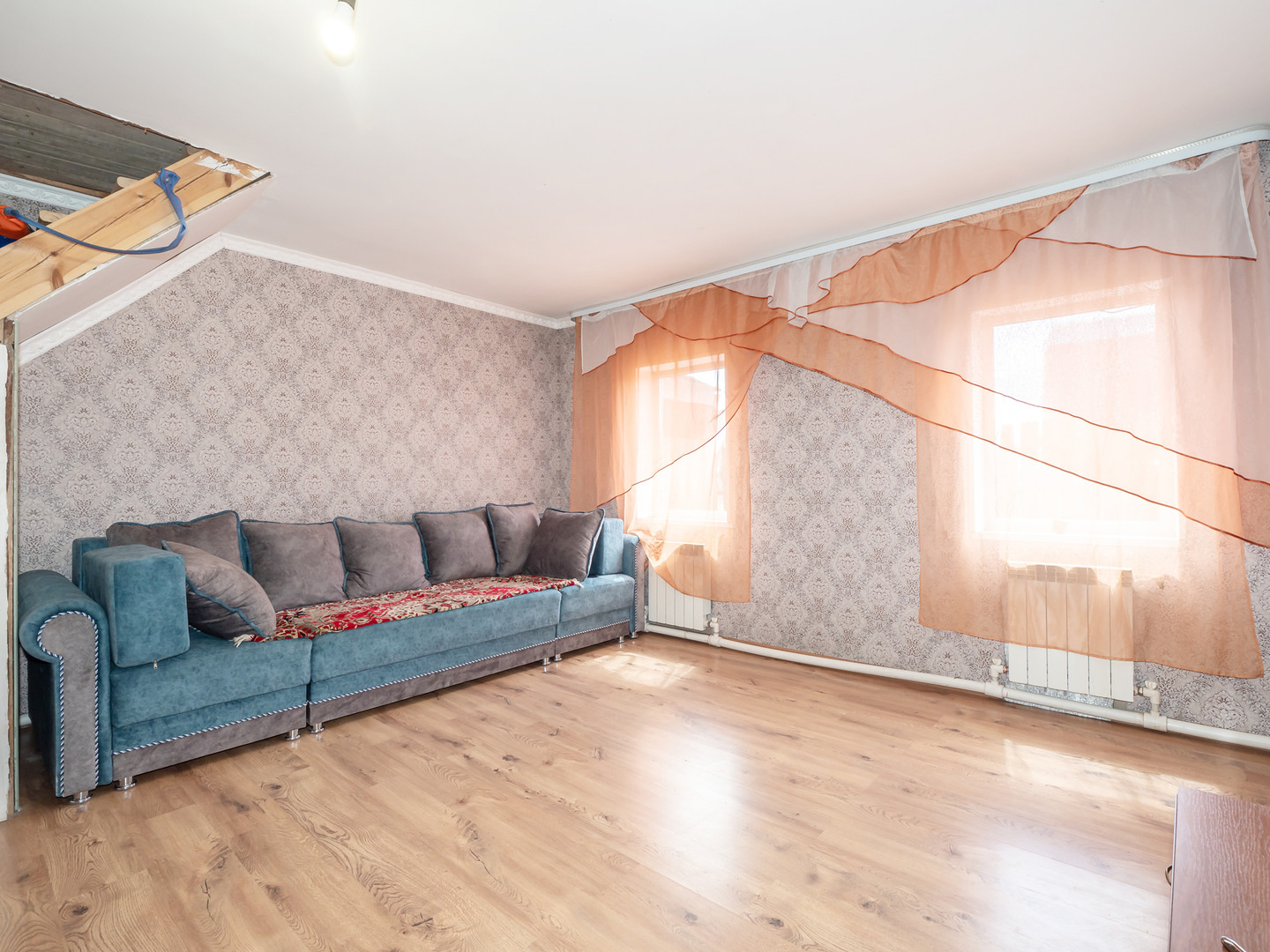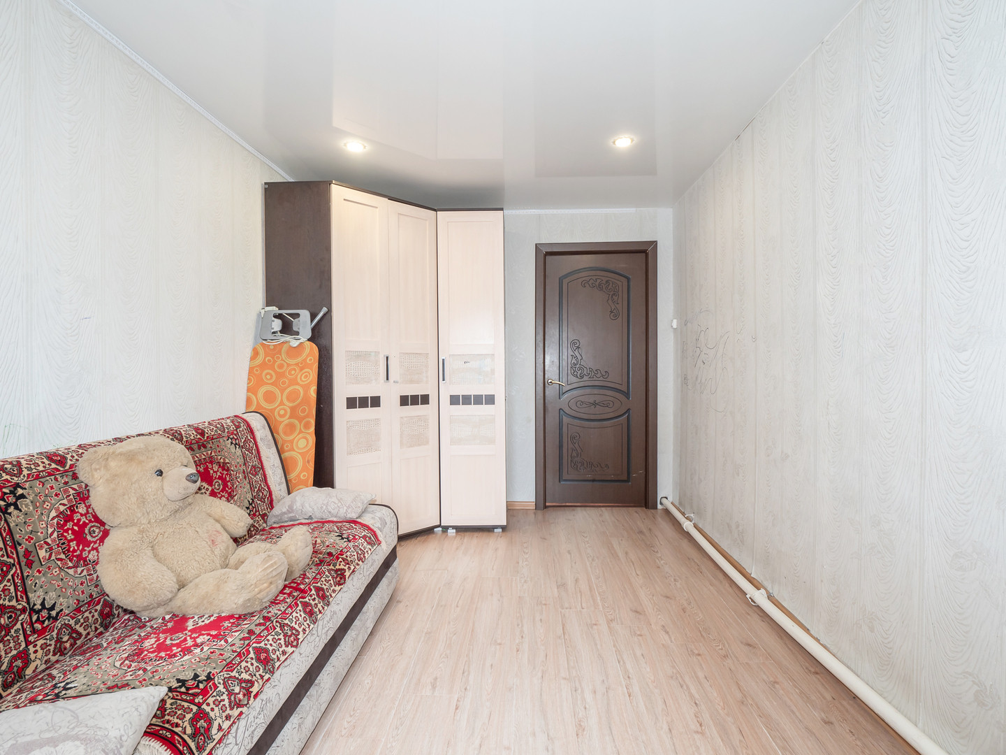 На полу уложен ламинат. Потолки натяжные, частично из гипсокартона. Стены обшиты гипсокартоном, сверху наклеены обои. В коридоре и санузле плитка. Окна пластиковые.