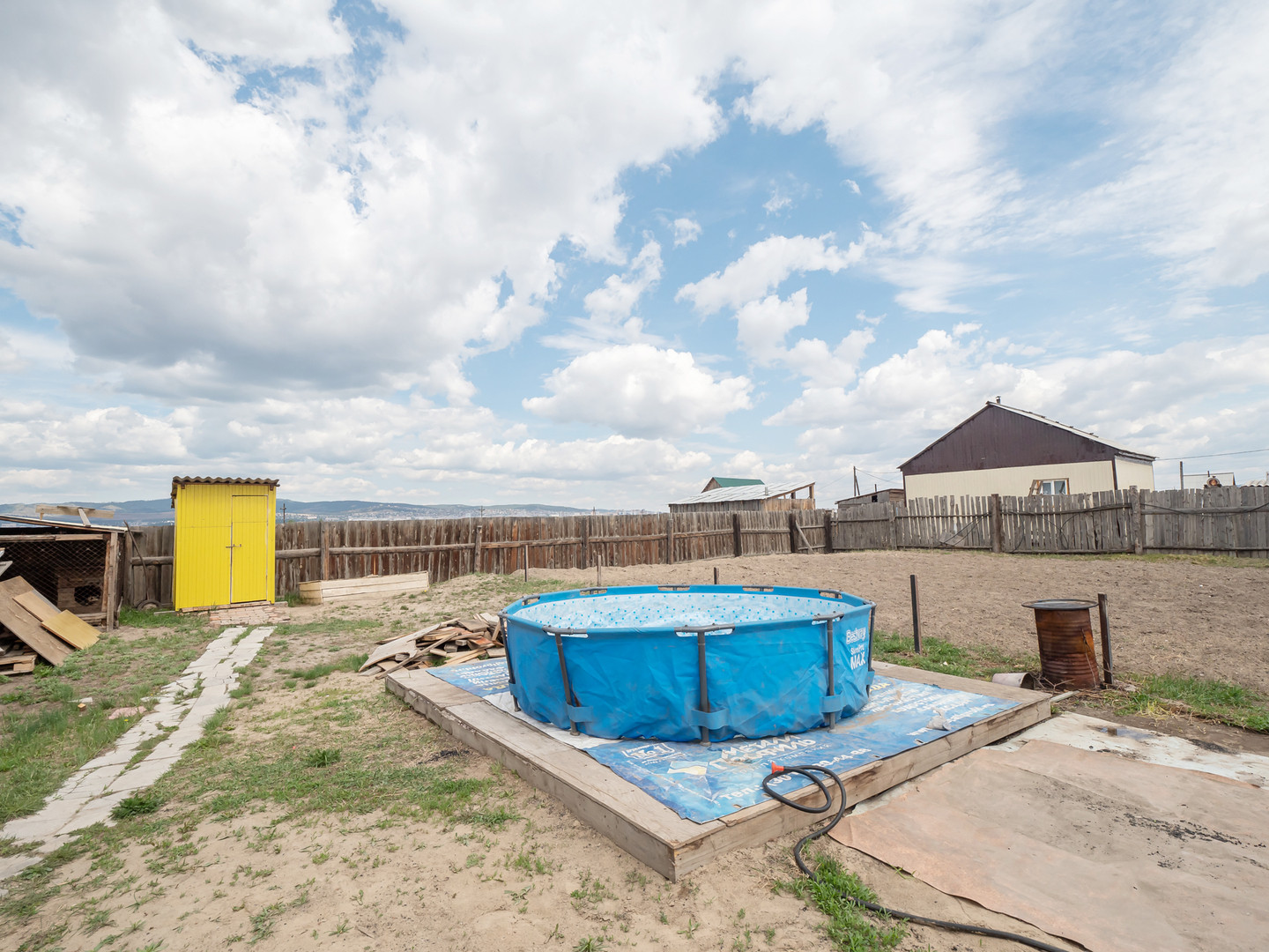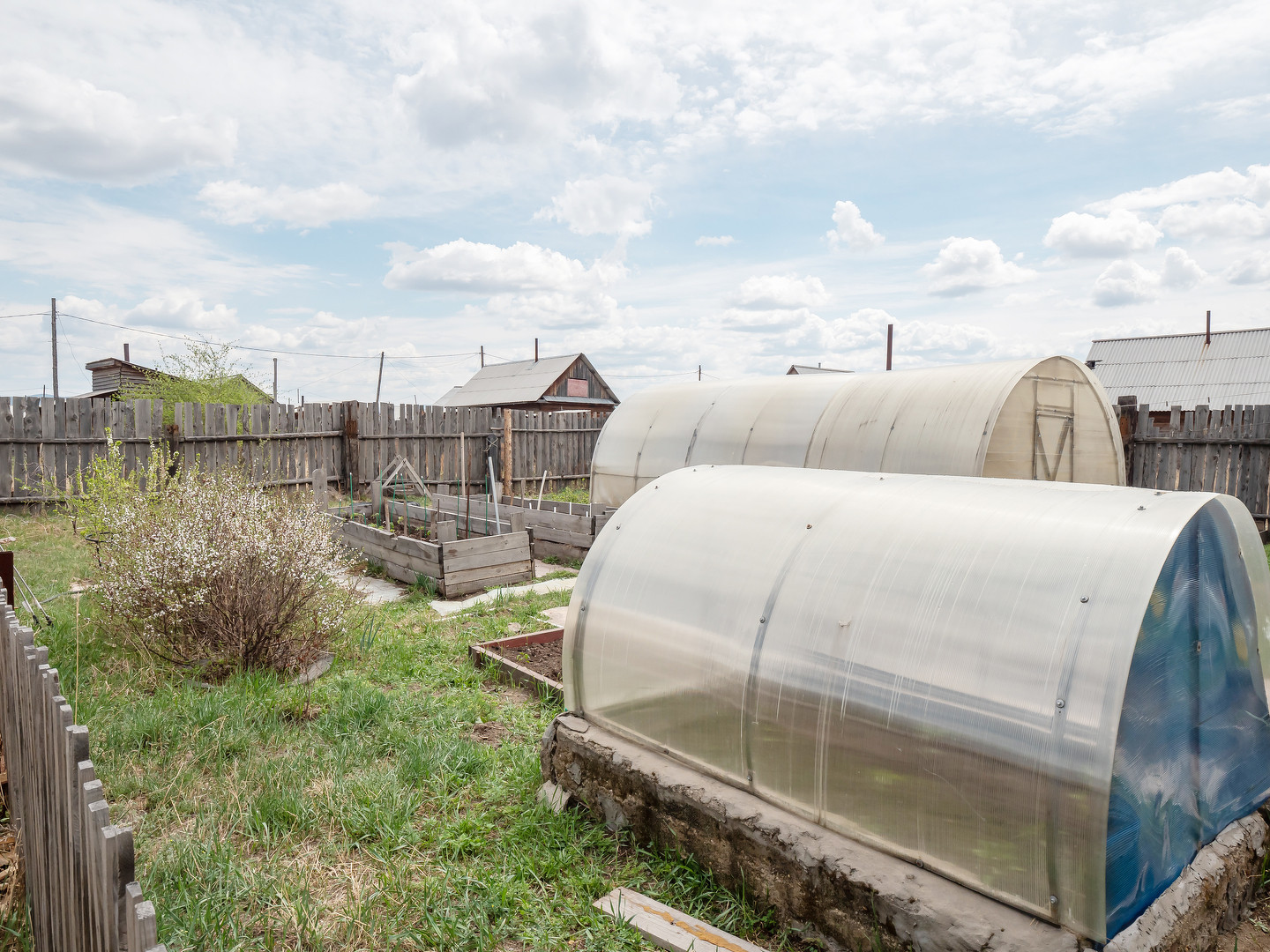 Участок ровный, огорожен деревянным забором. С лицевой стороны ворота из профлиста. Площадь участка: 13 соток. Есть недостроенный гараж, большой огород, теплица, беседка-мангальная, баня, качегарка.