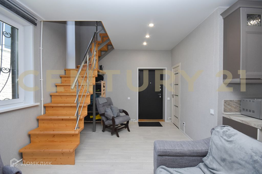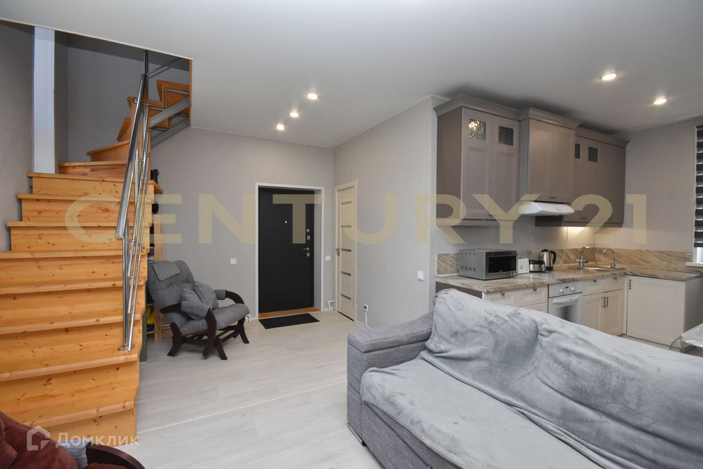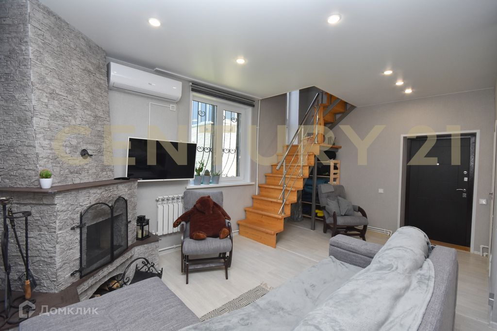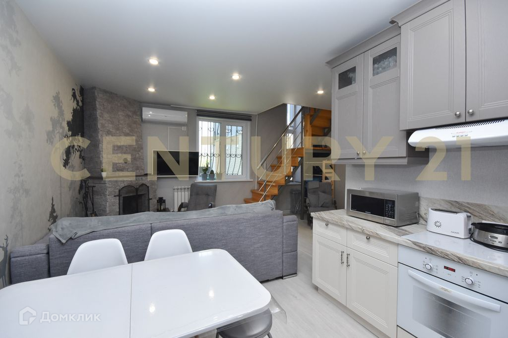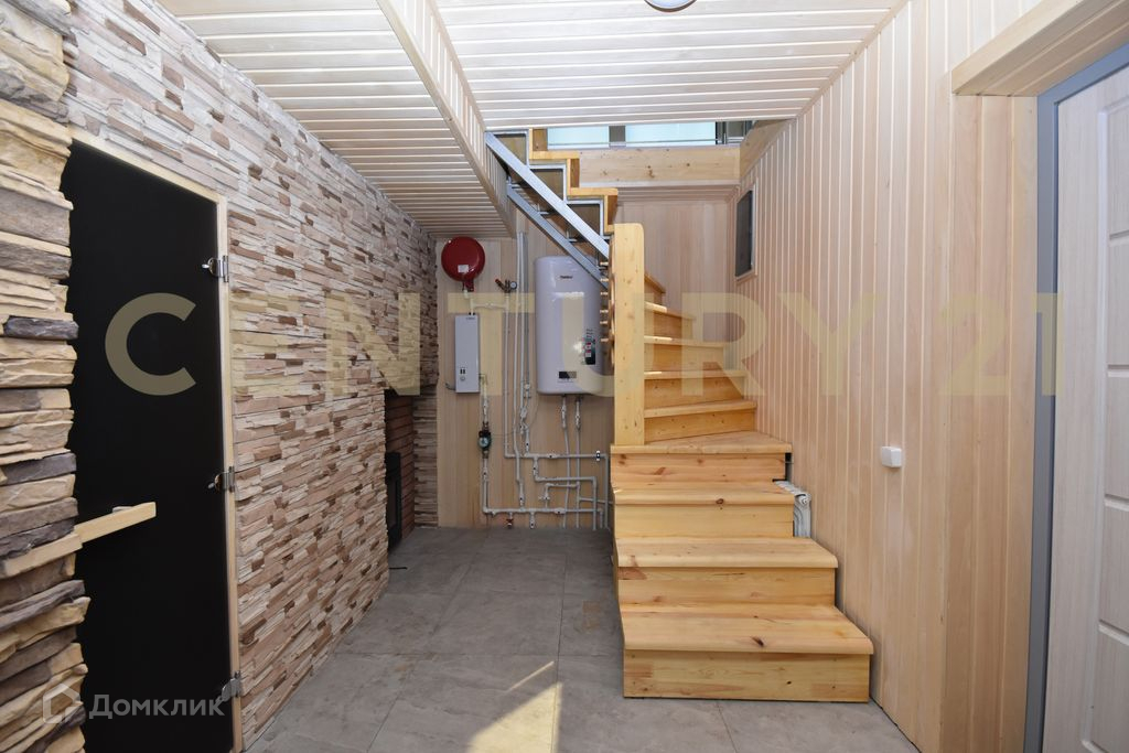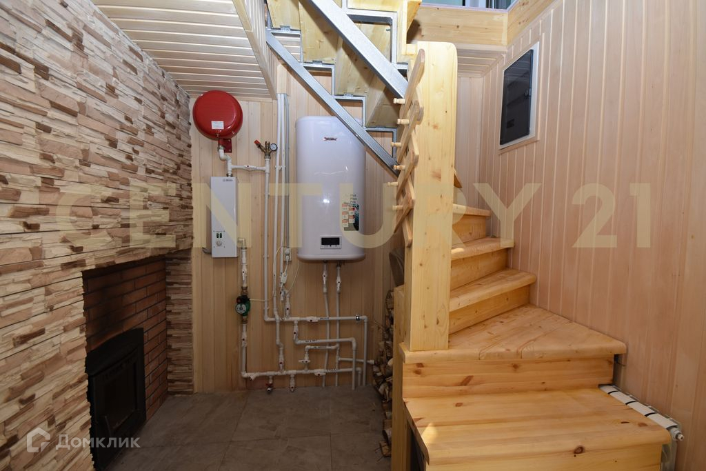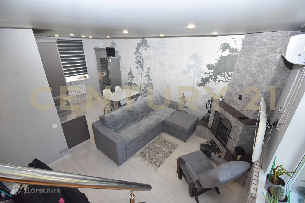 На первом этаже расположилась большая кухня-гостиная, душ и туалет. В ванной комнате установлены тёплые полы. Действующий камин.