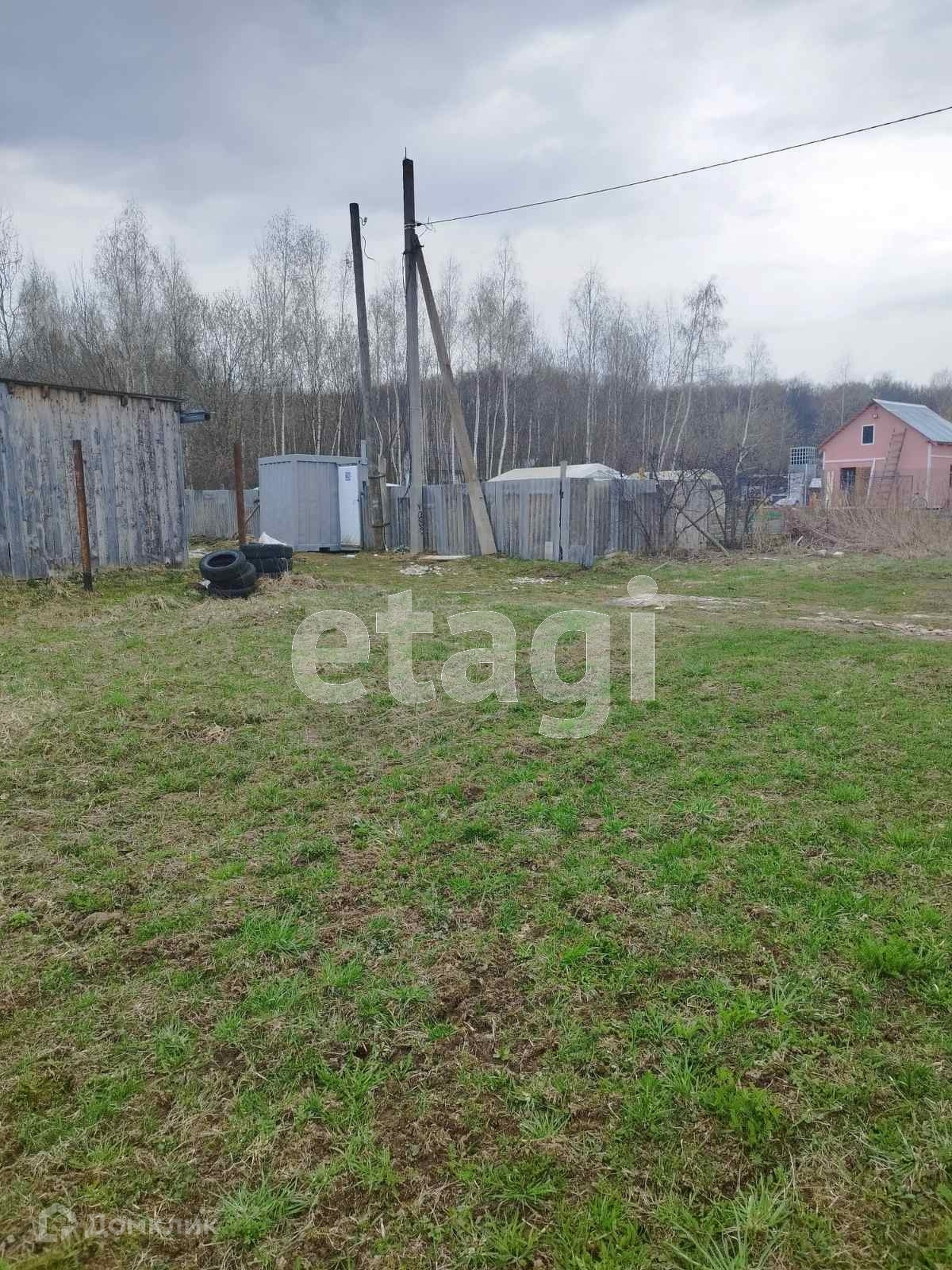 С одной стороны огорожен рабицей, с другой стороны вкопаны столбы для установки забора.