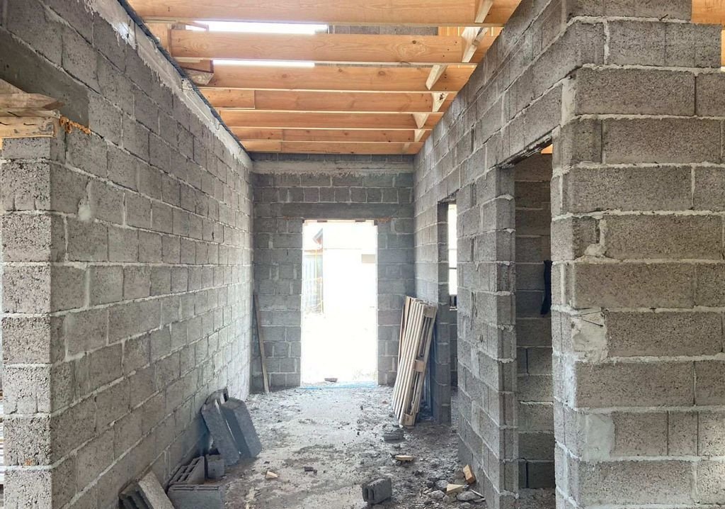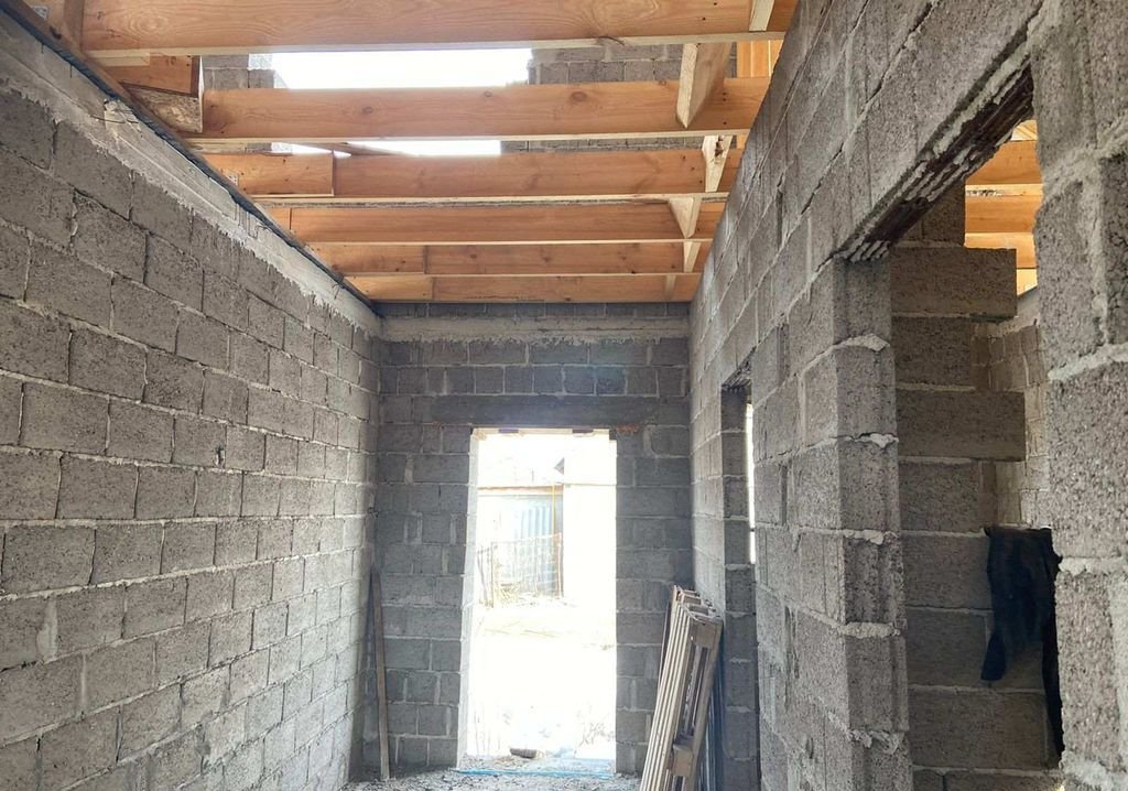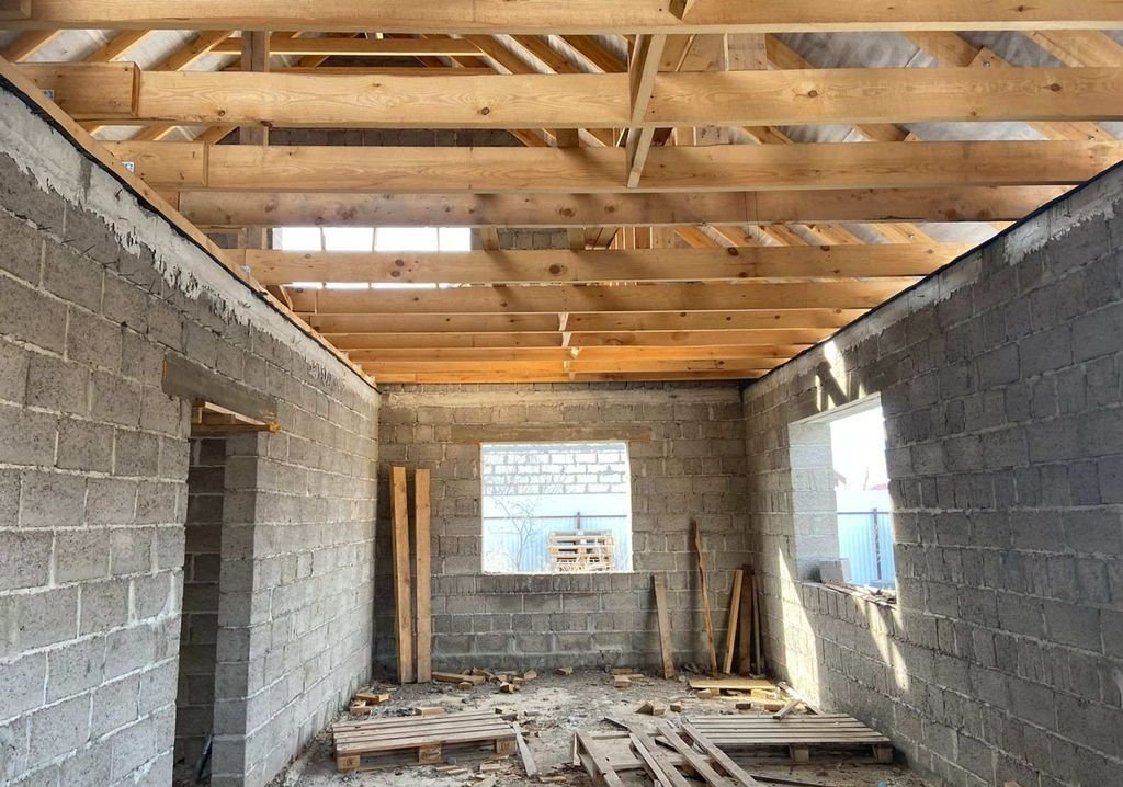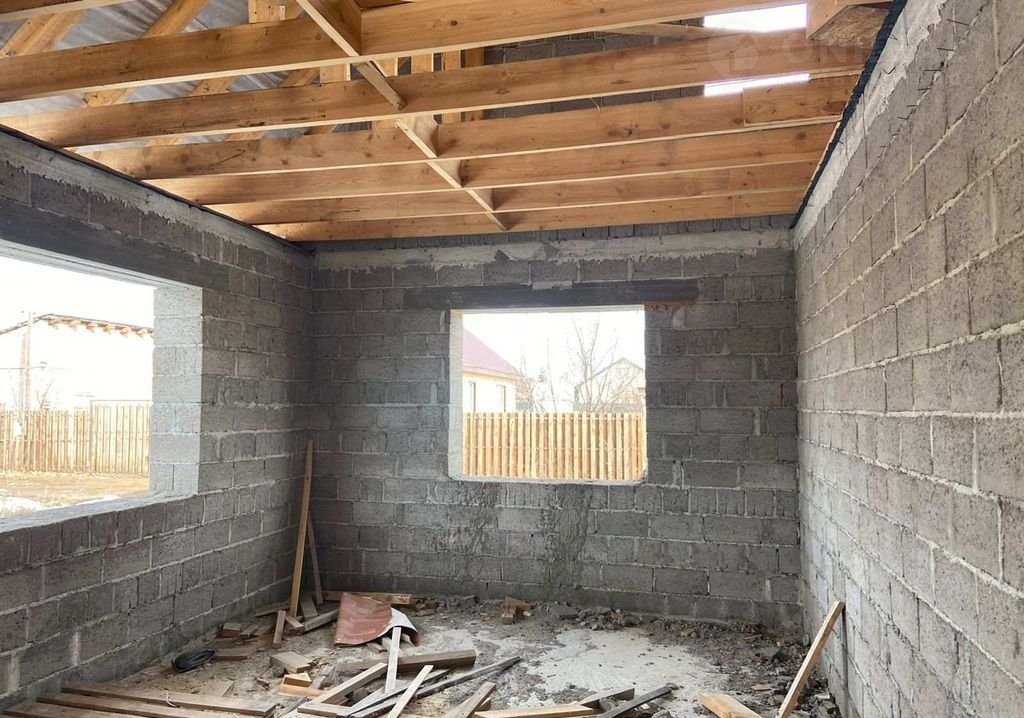 Материал керамзитоблок, толщина стен 40 см. Внутренние 20 см. Лаги перекрытия 200×50. Залит черновой пол.