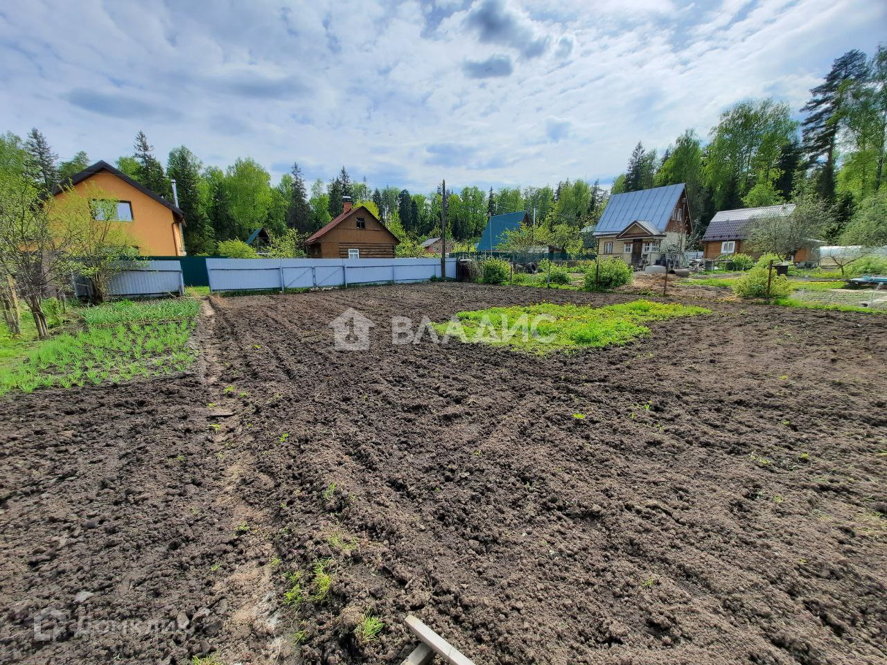 Участок огорожен металлическим профилем и сеткой рабицей.