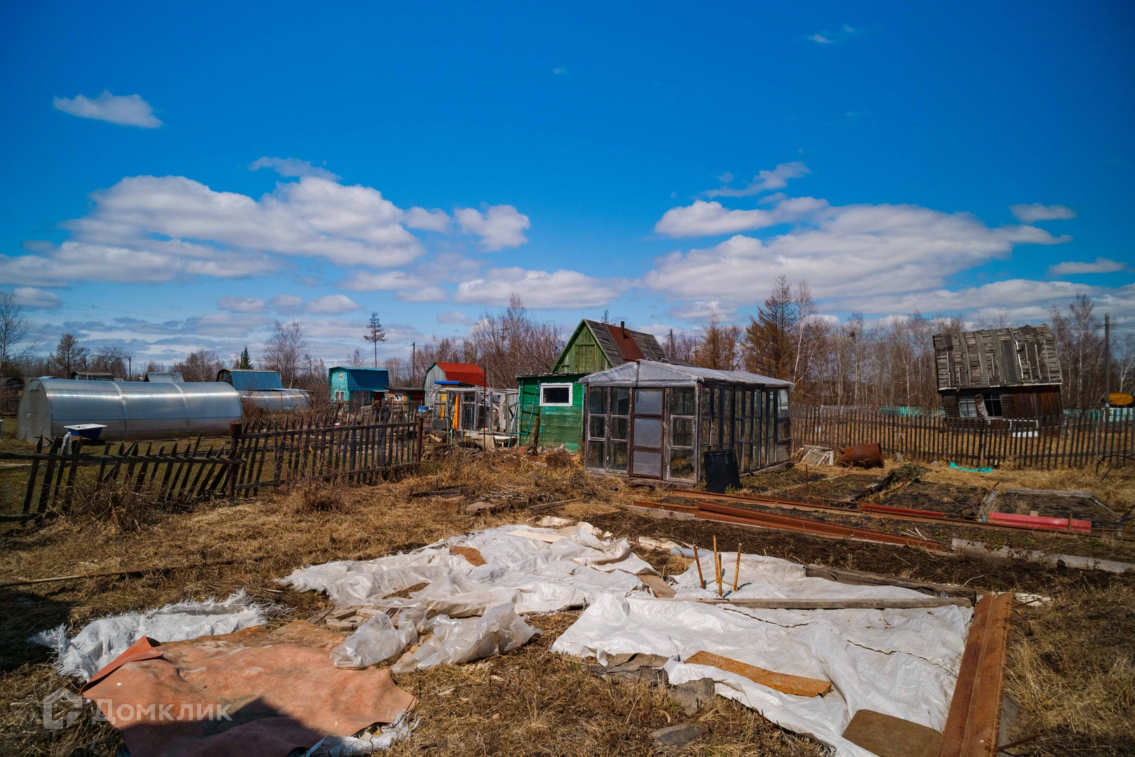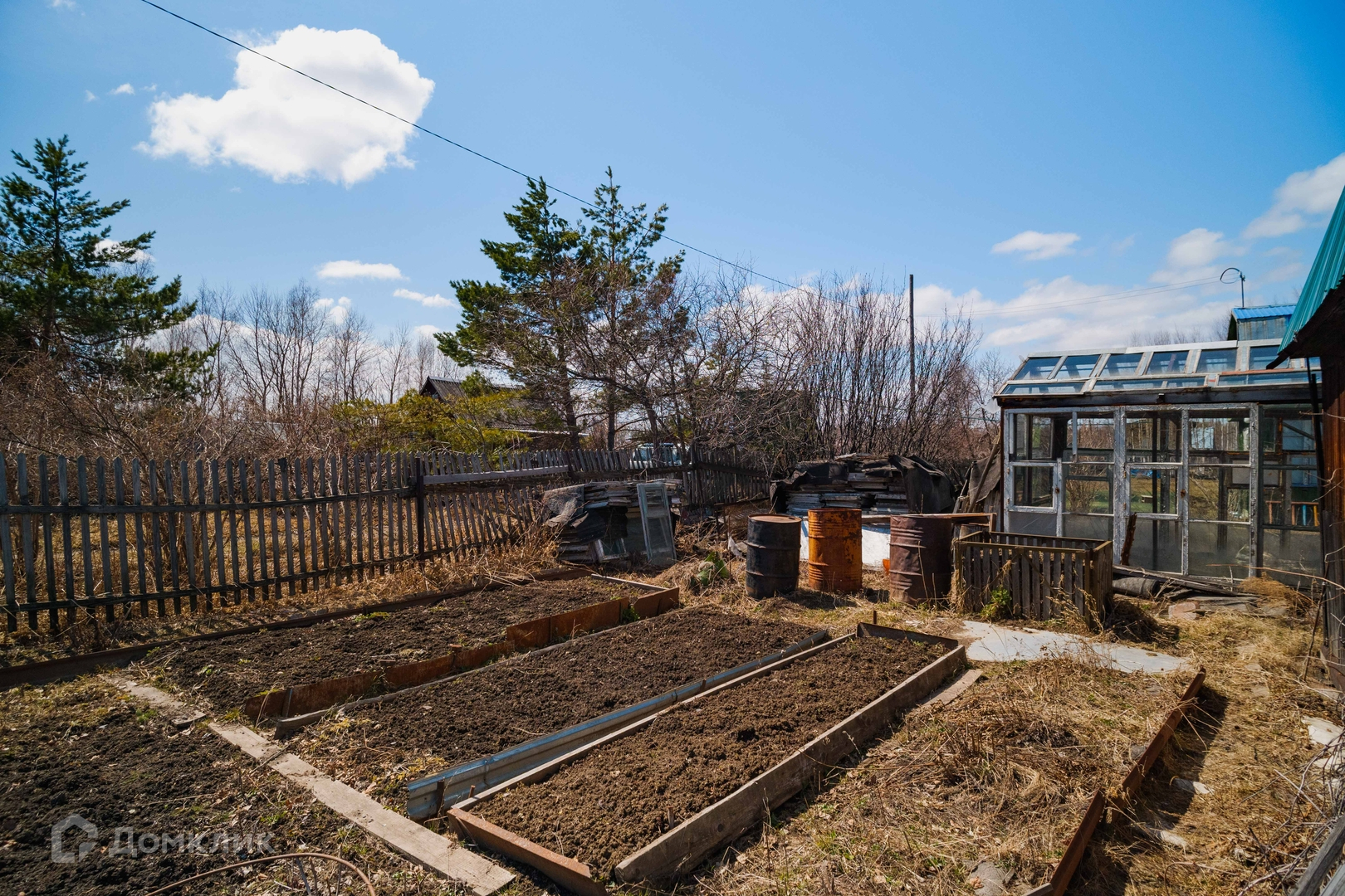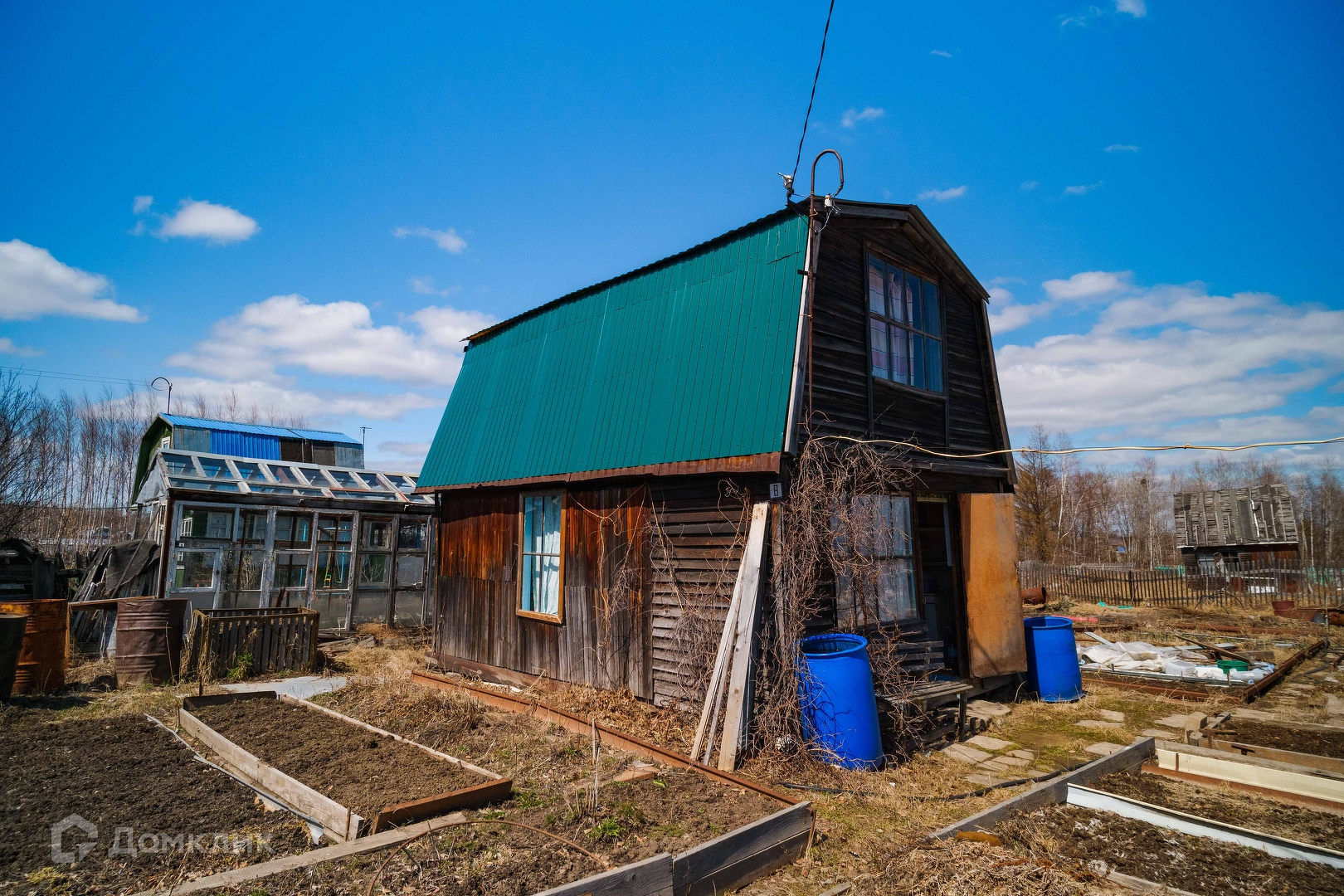 Садоводство оборудовано центральным летним водопроводом со скважины, на участке два выхода воды, есть электричество. На участке расположен двухэтажный дом из бруса, баня, три стеклянные теплицы, плёночный парник, отдельная емкость для воды, бочки, есть двое ворот для въезда машин, контейнер с наличием инвентаря, шлангов, строительного материала и различного инструмента.