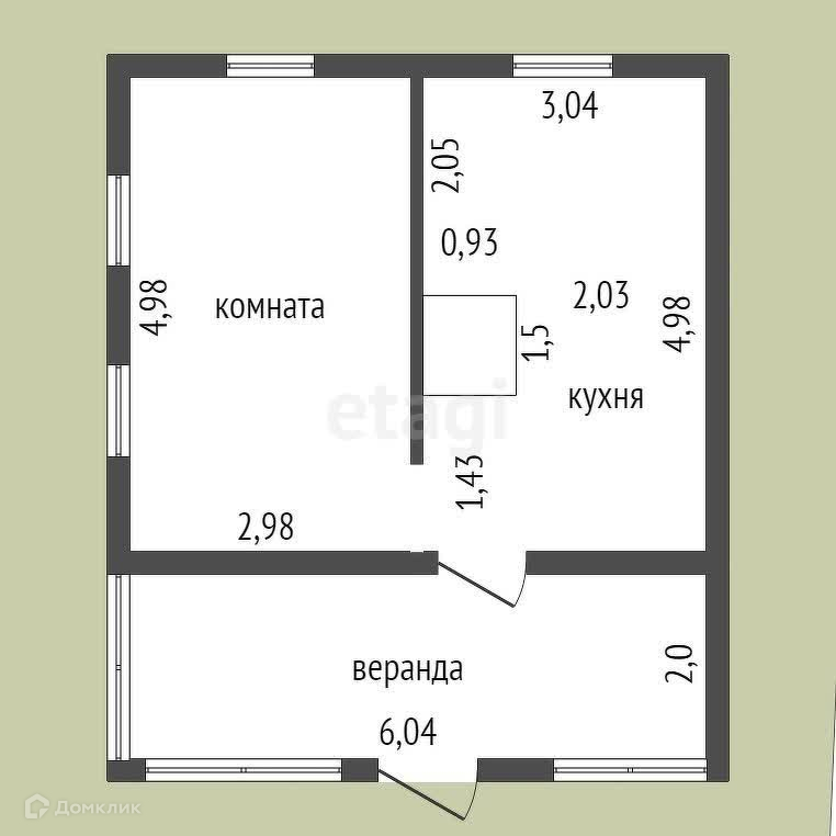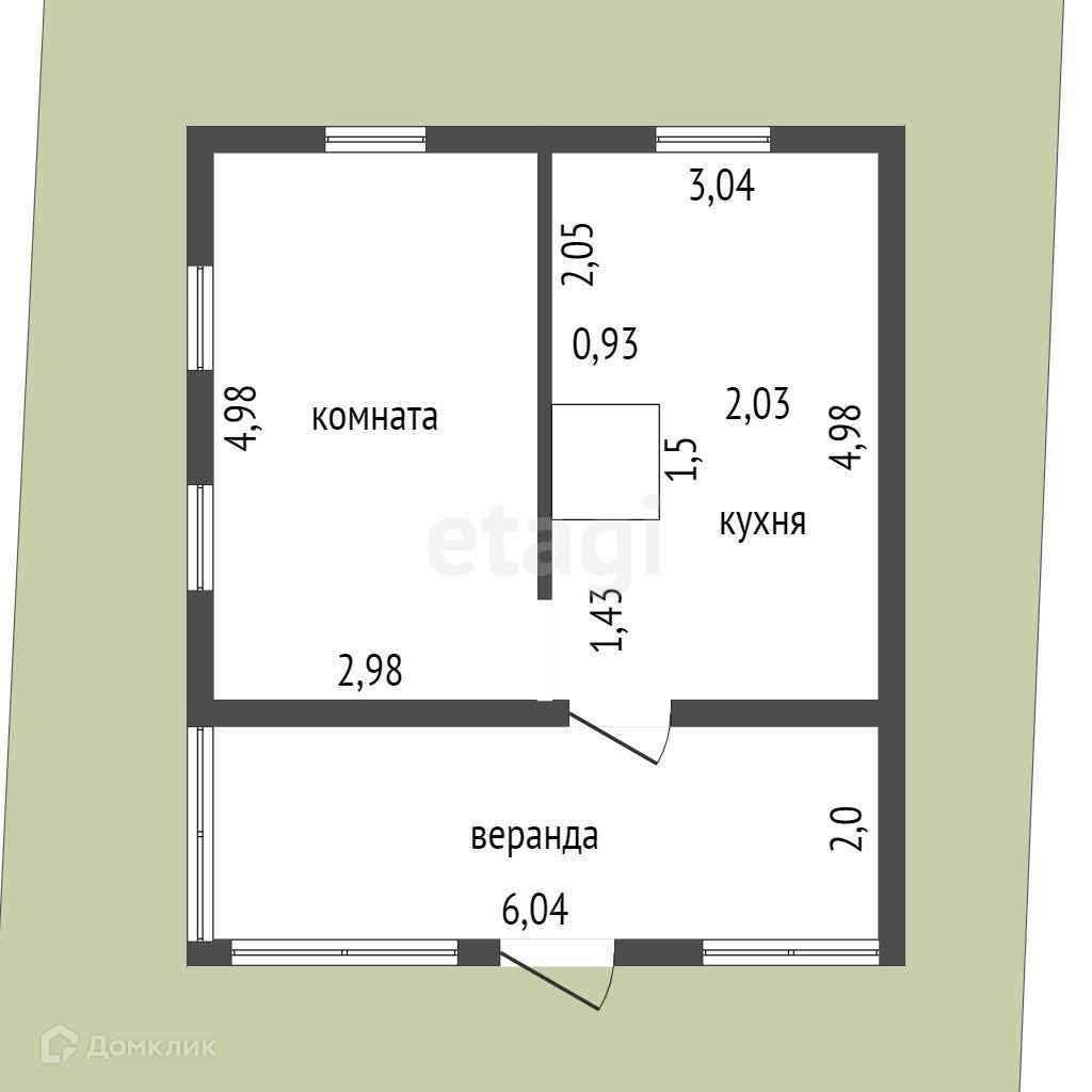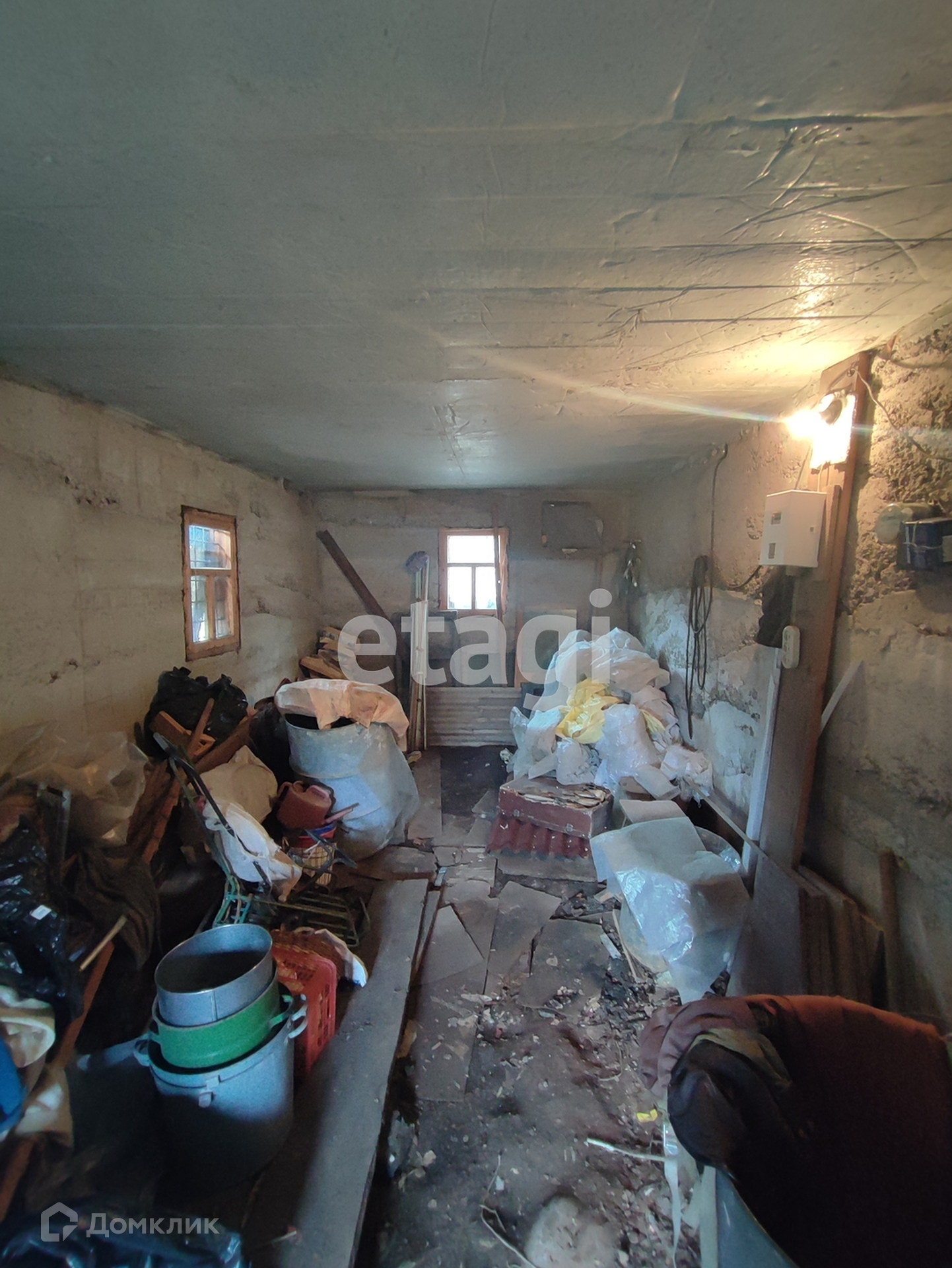 Добротный дом на бетонном цоколе. В цоколе два помещения - большой гараж и комната, из которой осуществляется спуск в погреб. Жилое помещение состоит из двух комнат, построенных вокруг большой кирпичной печи.